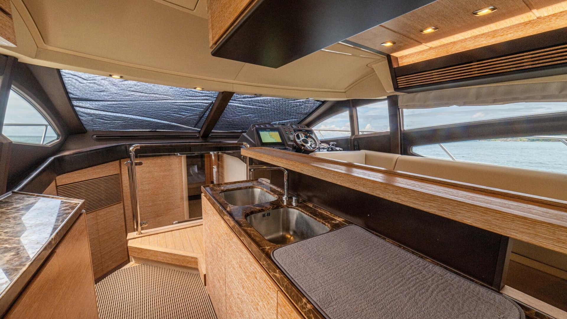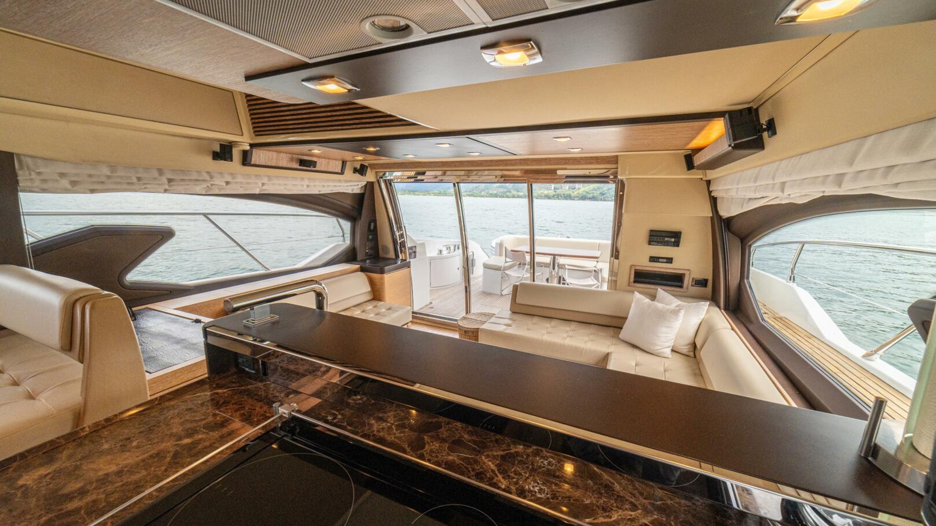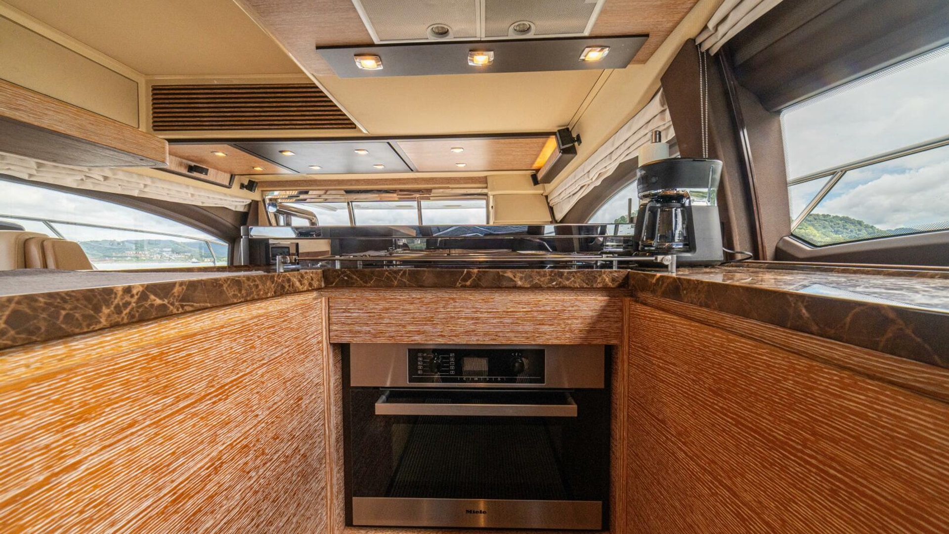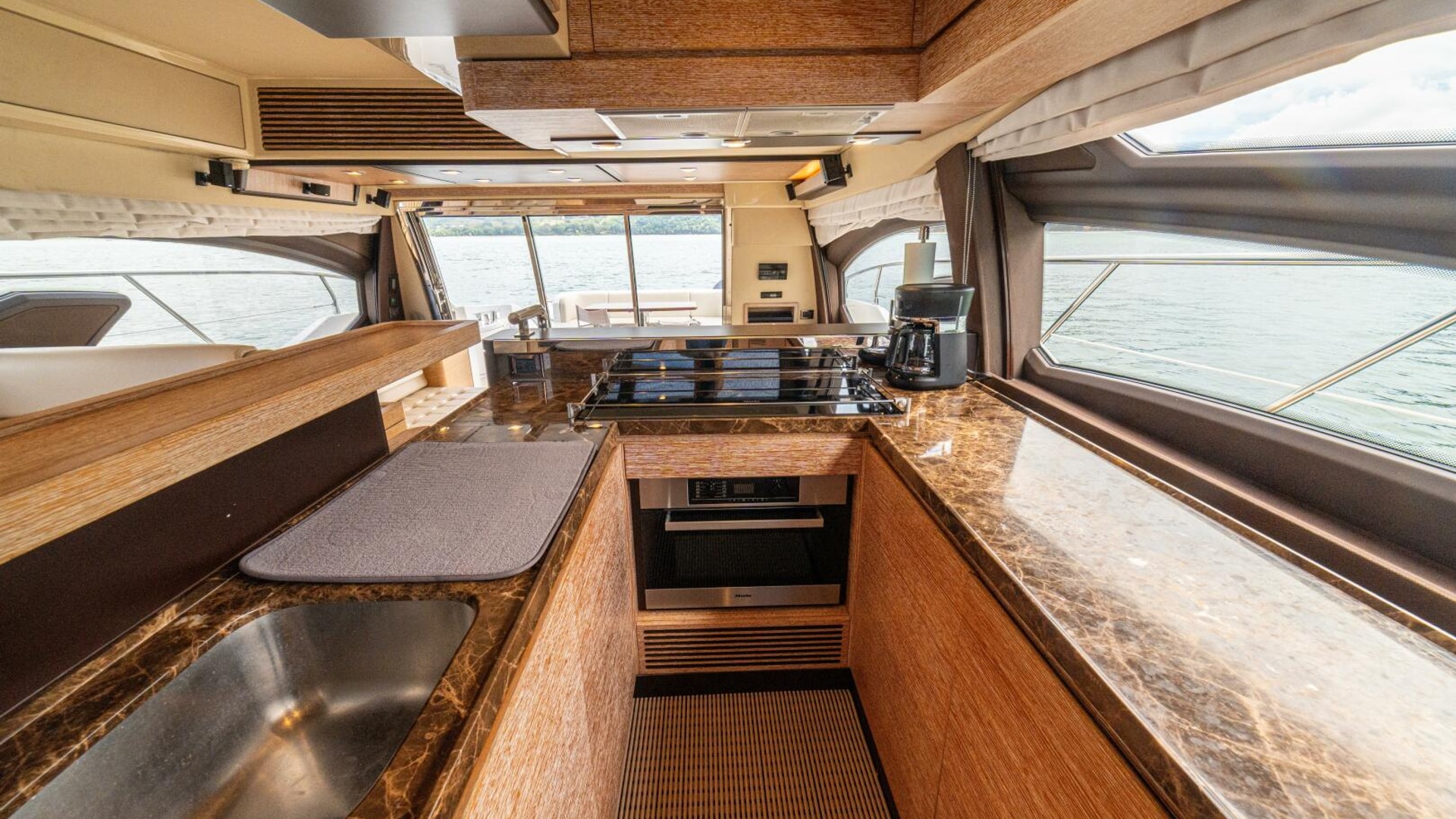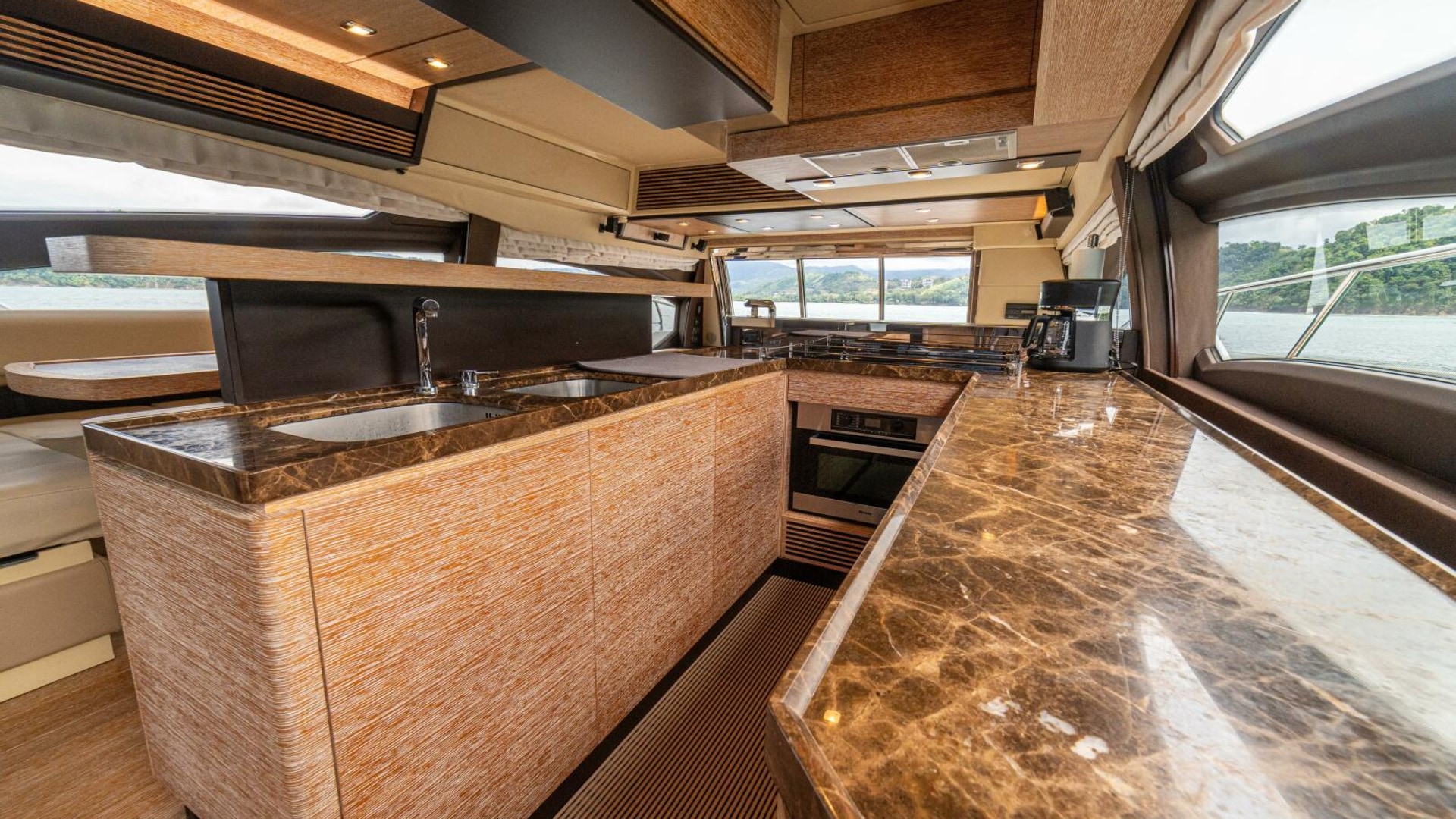 The galley is modern and well-appointed, featuring high-quality finishes and appliances, designed for functionality and elegance.