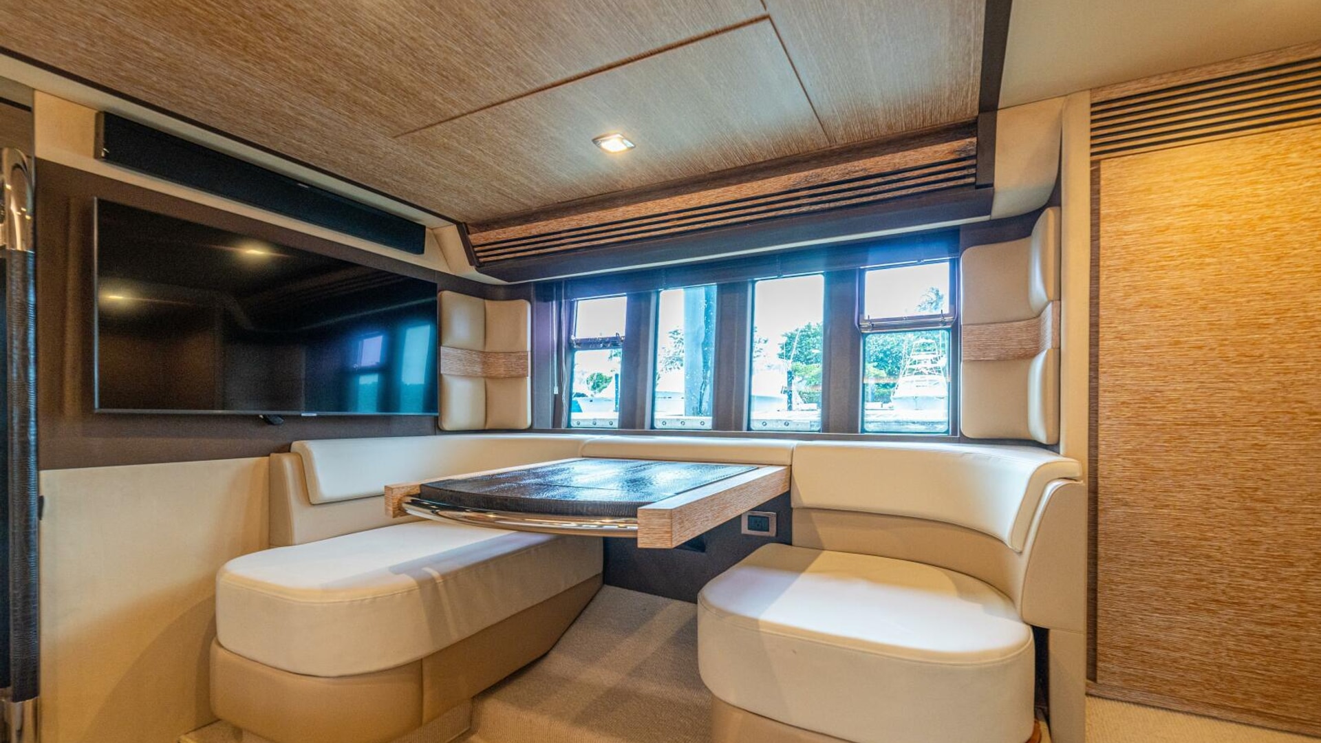 The salon is a luxurious, contemporary-styled living area featuring ample seating, elegant finishes, and modern entertainment amenities. Large windows provide abundant natural light and panoramic views, enhancing the open and inviting atmosphere.
