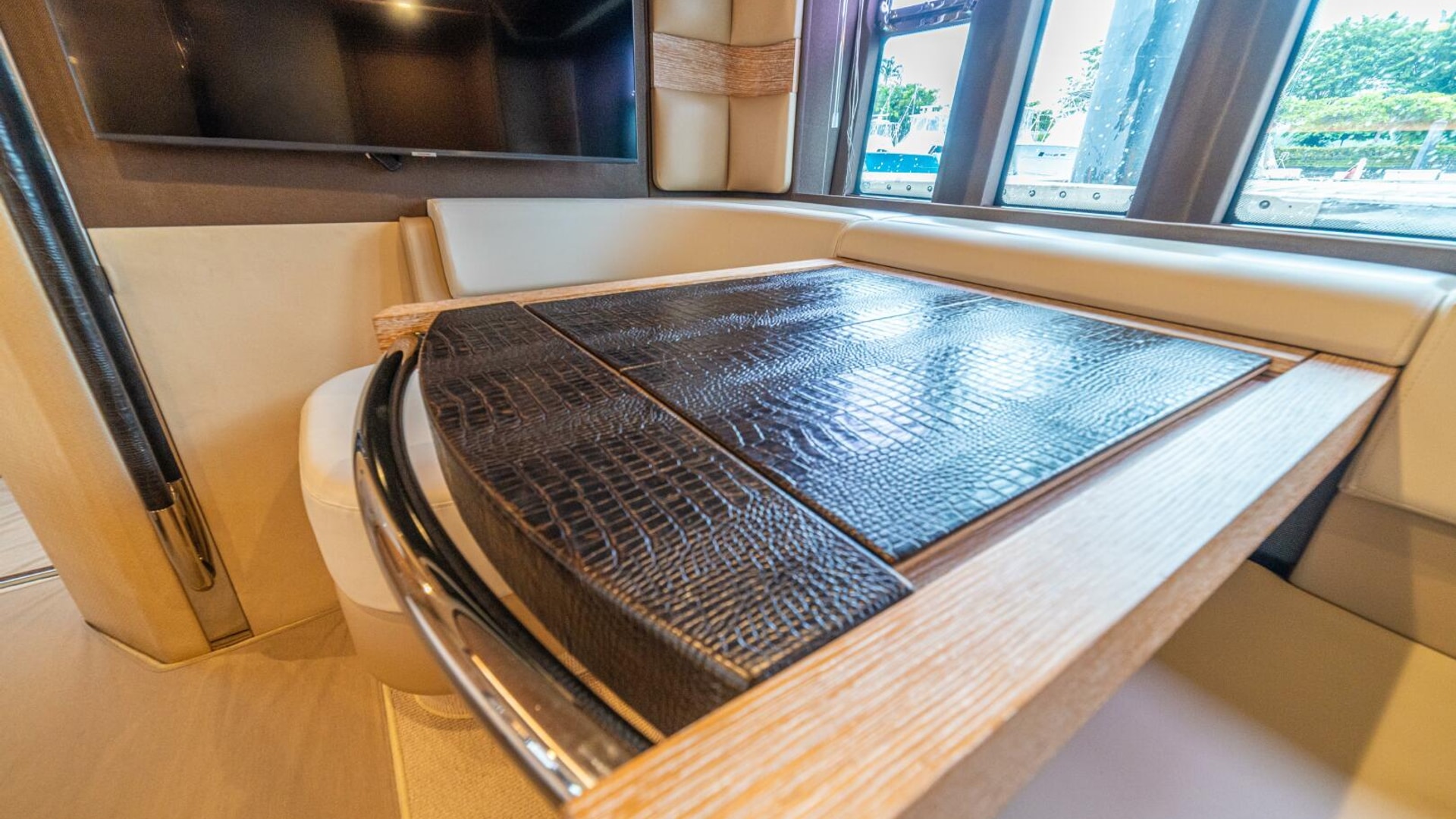 - High-gloss finished wooden cockpit table with polished stainless-steel pedestal