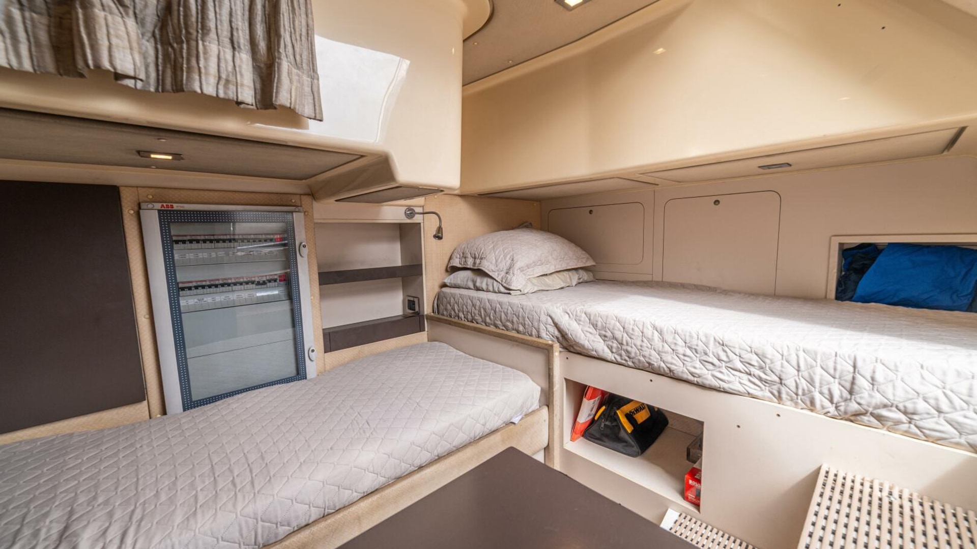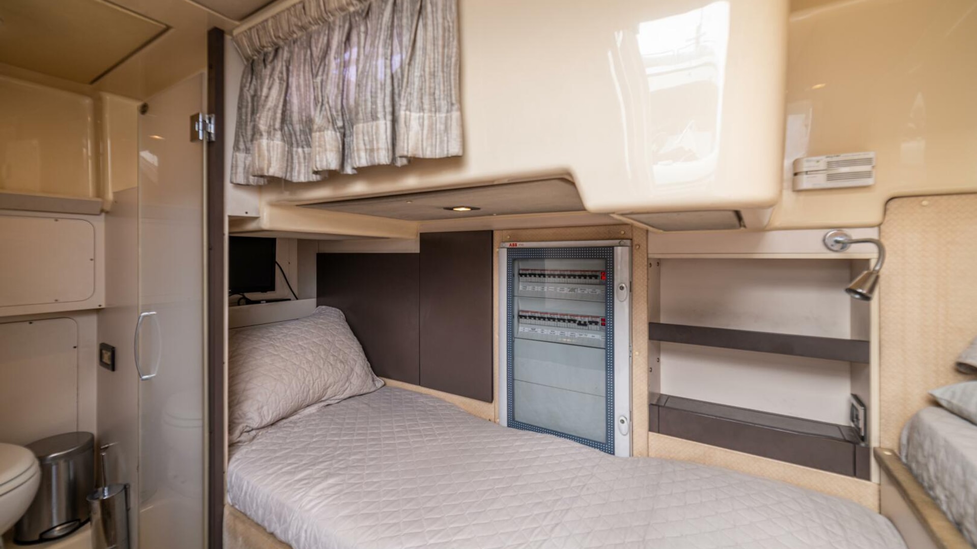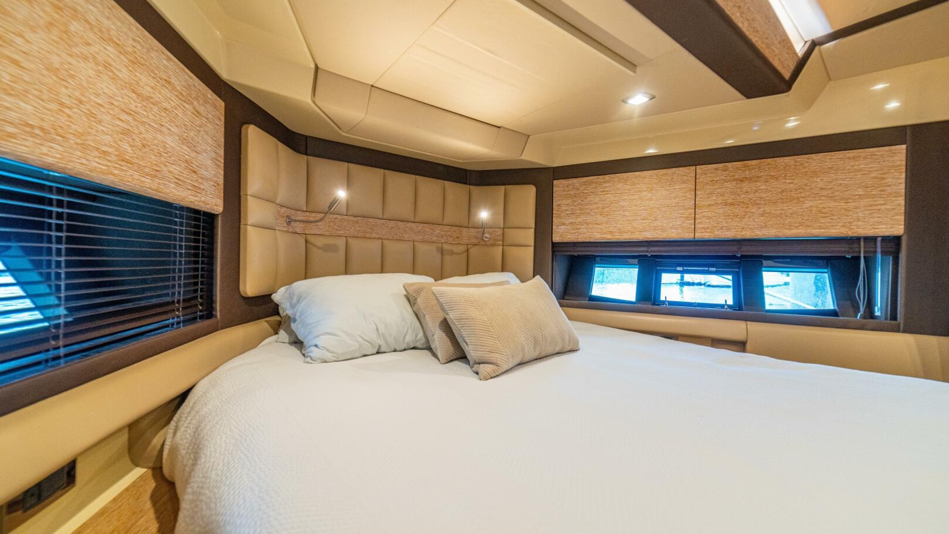 - Large centerline berth with upholstered headboard and integrated reading lights Overhead recessed lighting and accent lighting