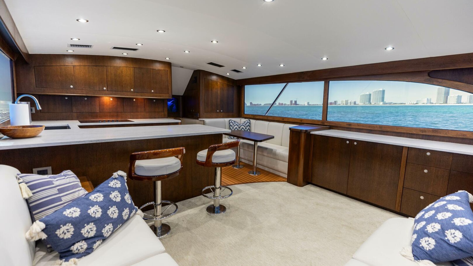 Massive salon with 7’ headroom featuring raised counter with bar stools, dinette with seating for five and quartz counter tops.