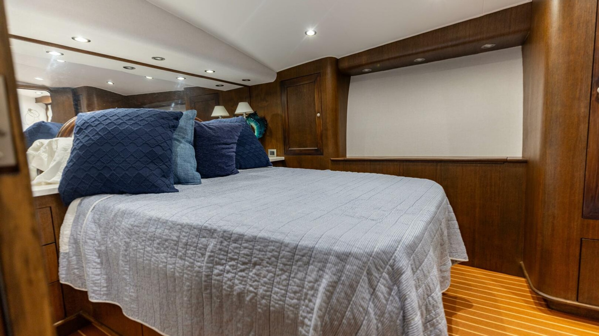 - Queen berth center lined with storage