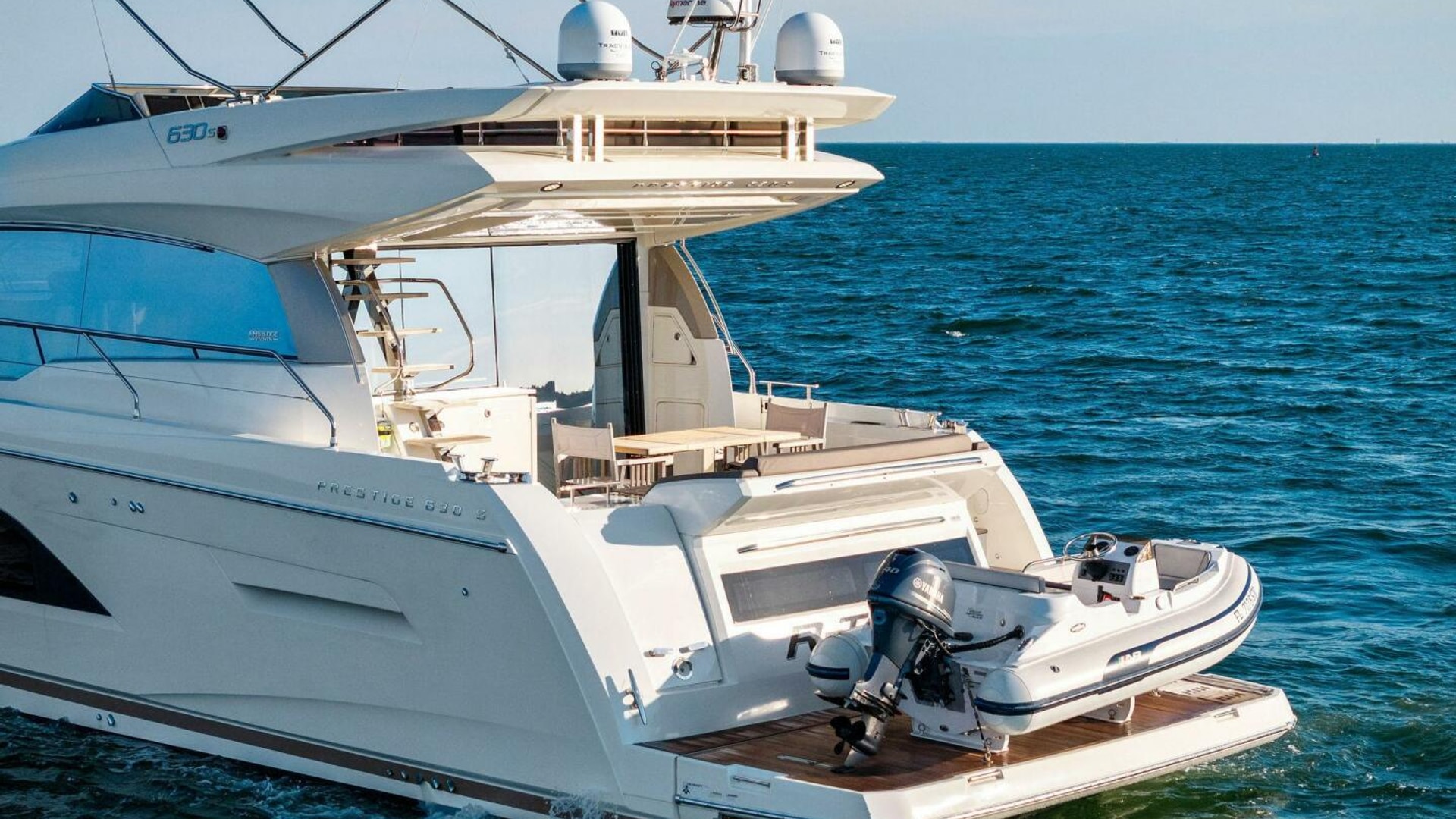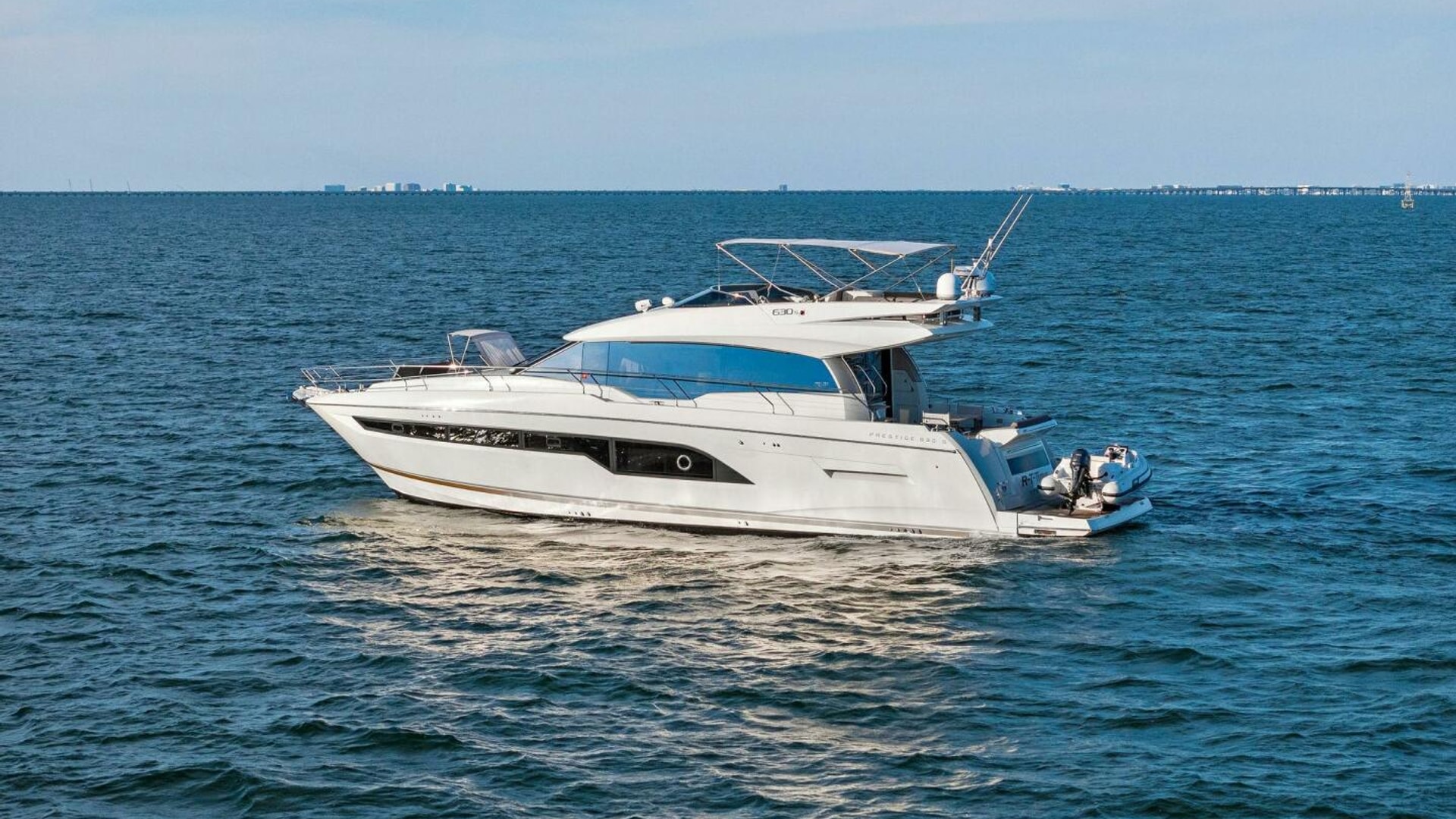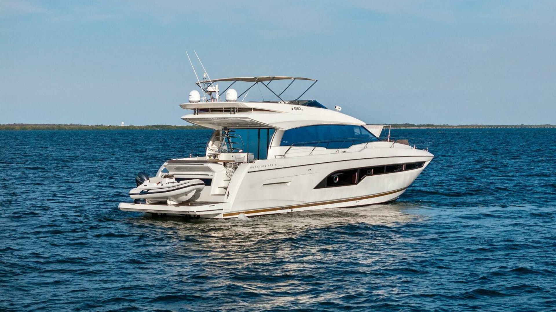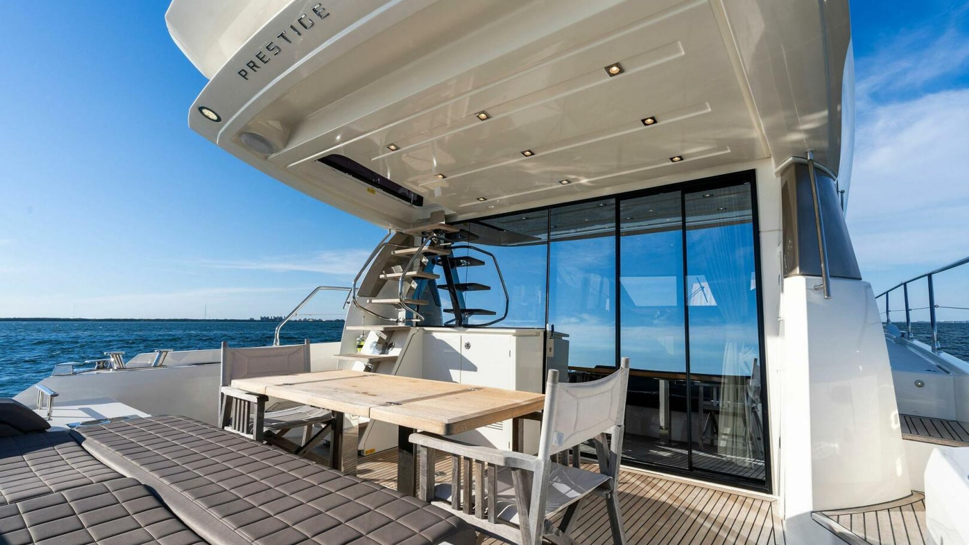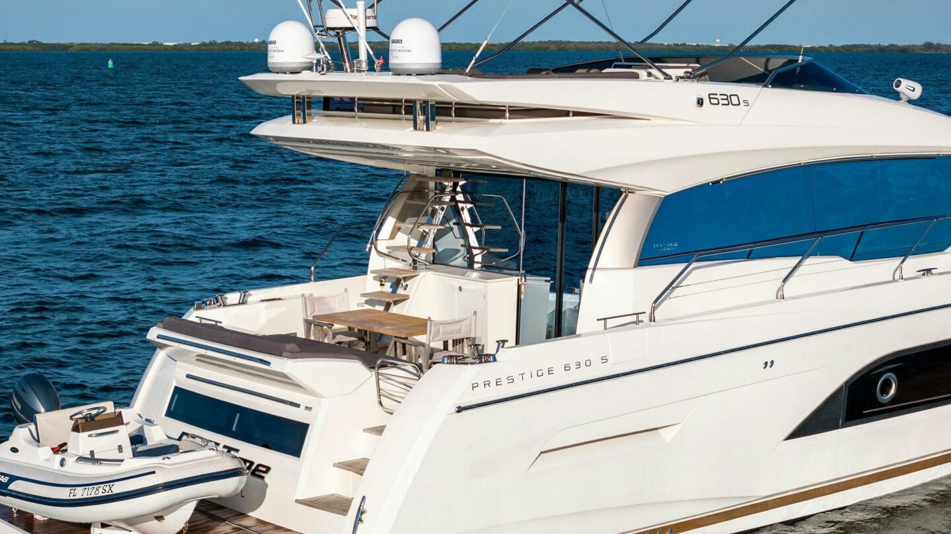 2019 63 Prestige Flybridge - "RT Time" is the only Prestige 630S currently listed for sale in the US. This model offers the best of both worlds with a spacious flybridge and a hydraulic removable bimini top and she transforms into a sleek-looking sport yacht with a large sunroof over the interior helm station.