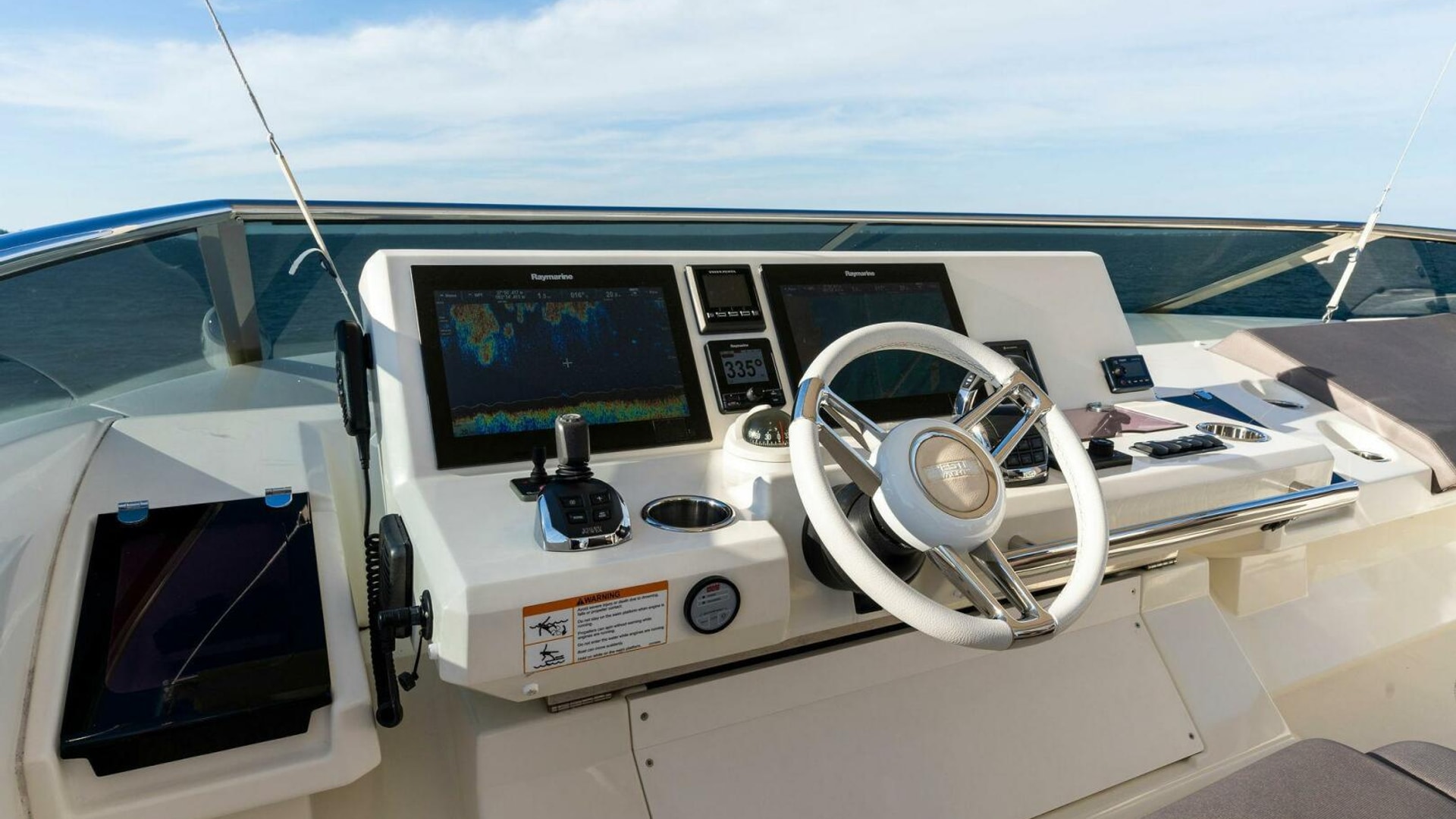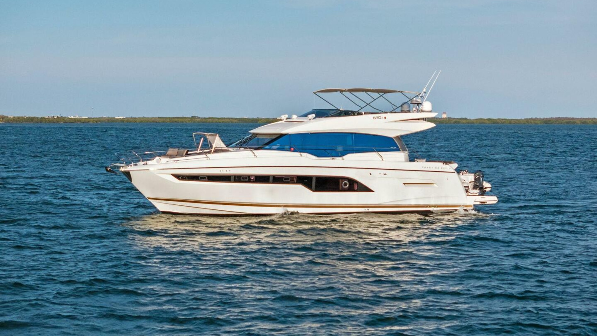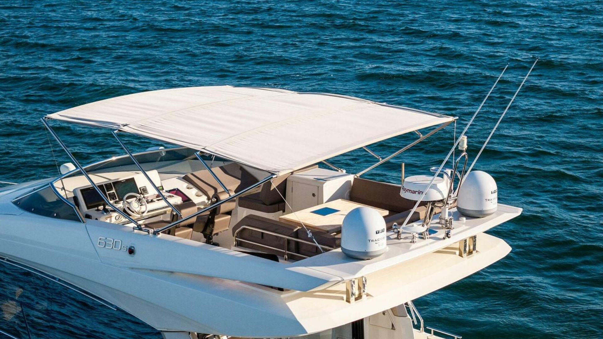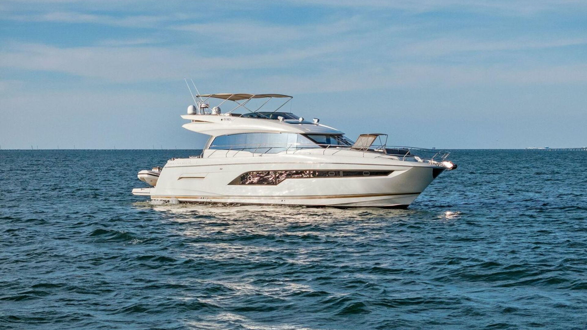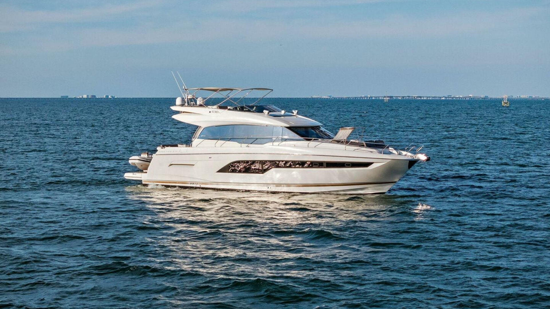 2019 63 Prestige Flybridge - "RT Time" is the only Prestige 630S currently listed for sale in the US. This model offers the best of both worlds with a spacious flybridge and a hydraulic removable bimini top and she transforms into a sleek-looking sport yacht with a large sunroof over the interior helm station.
