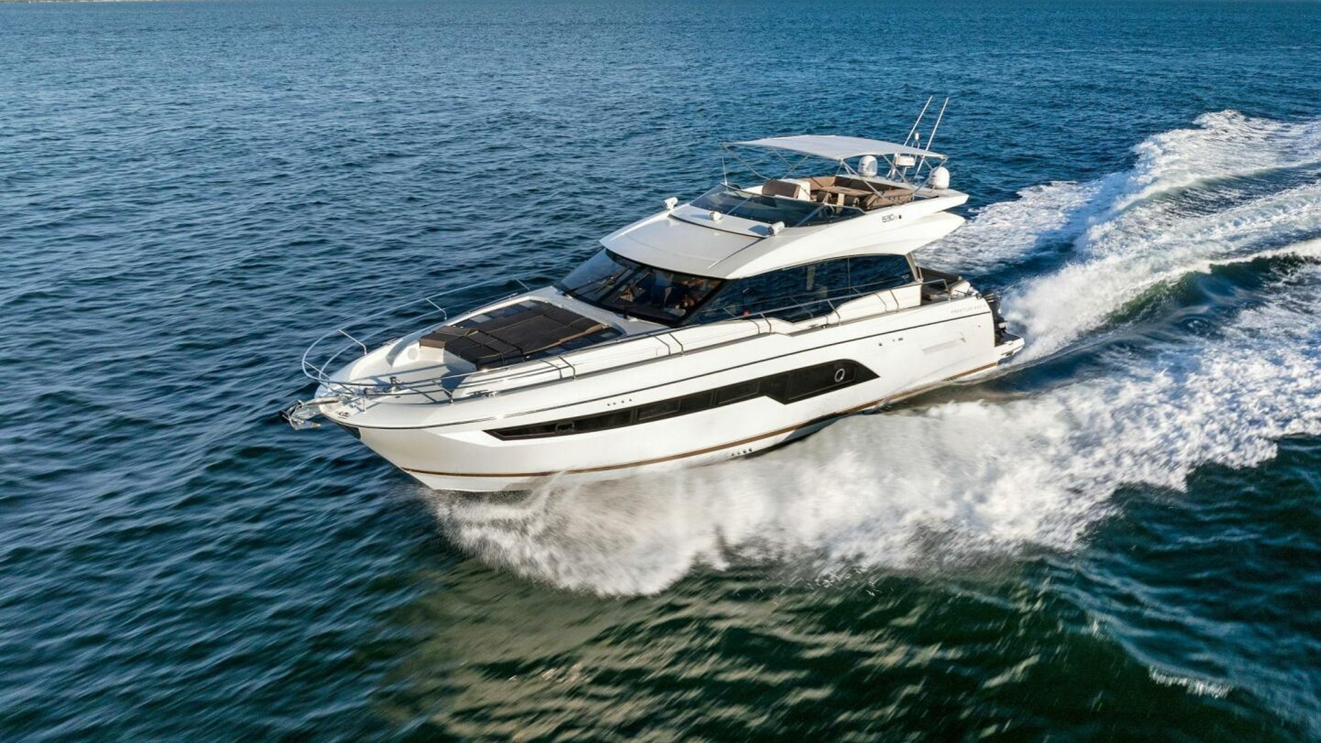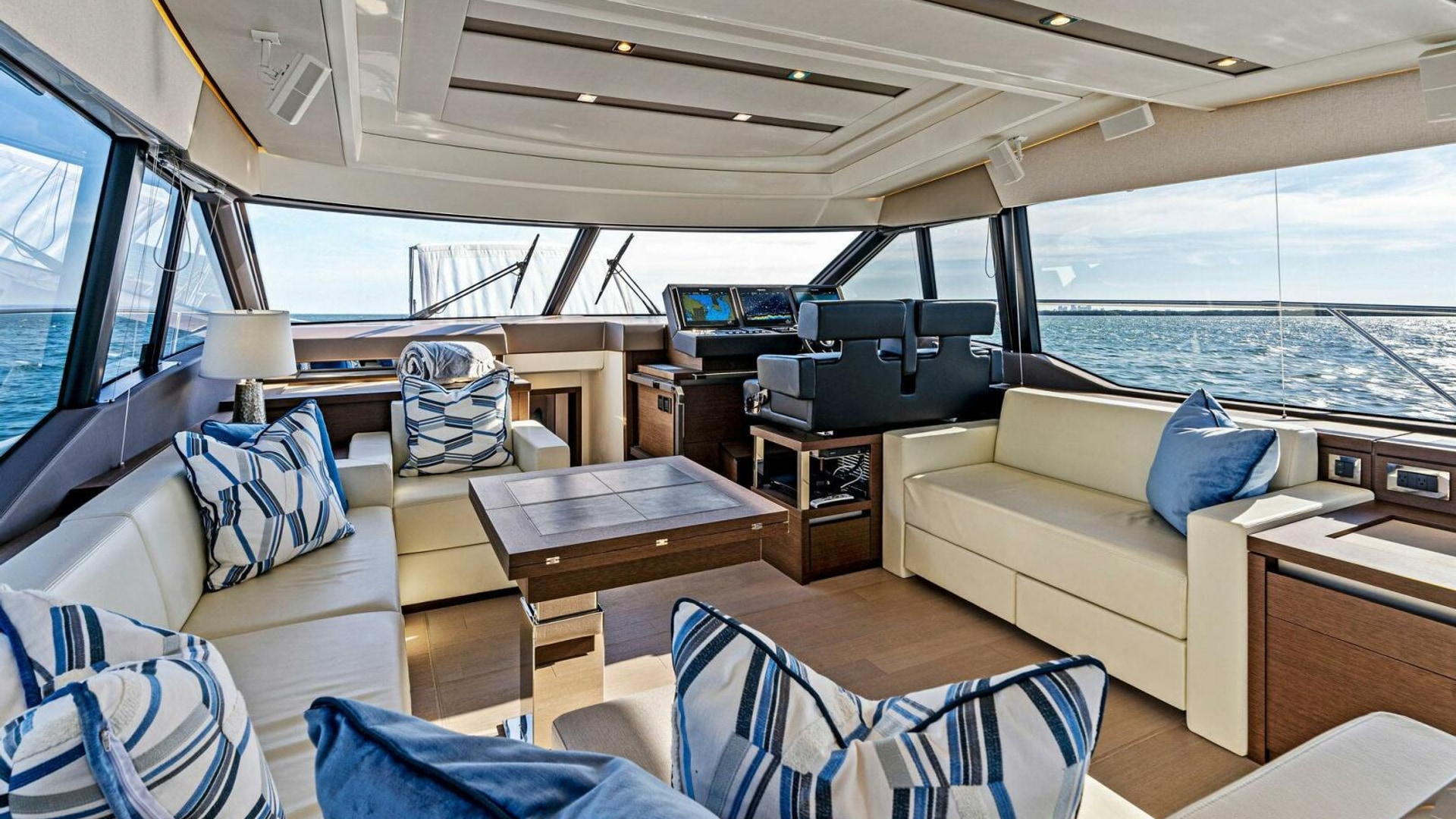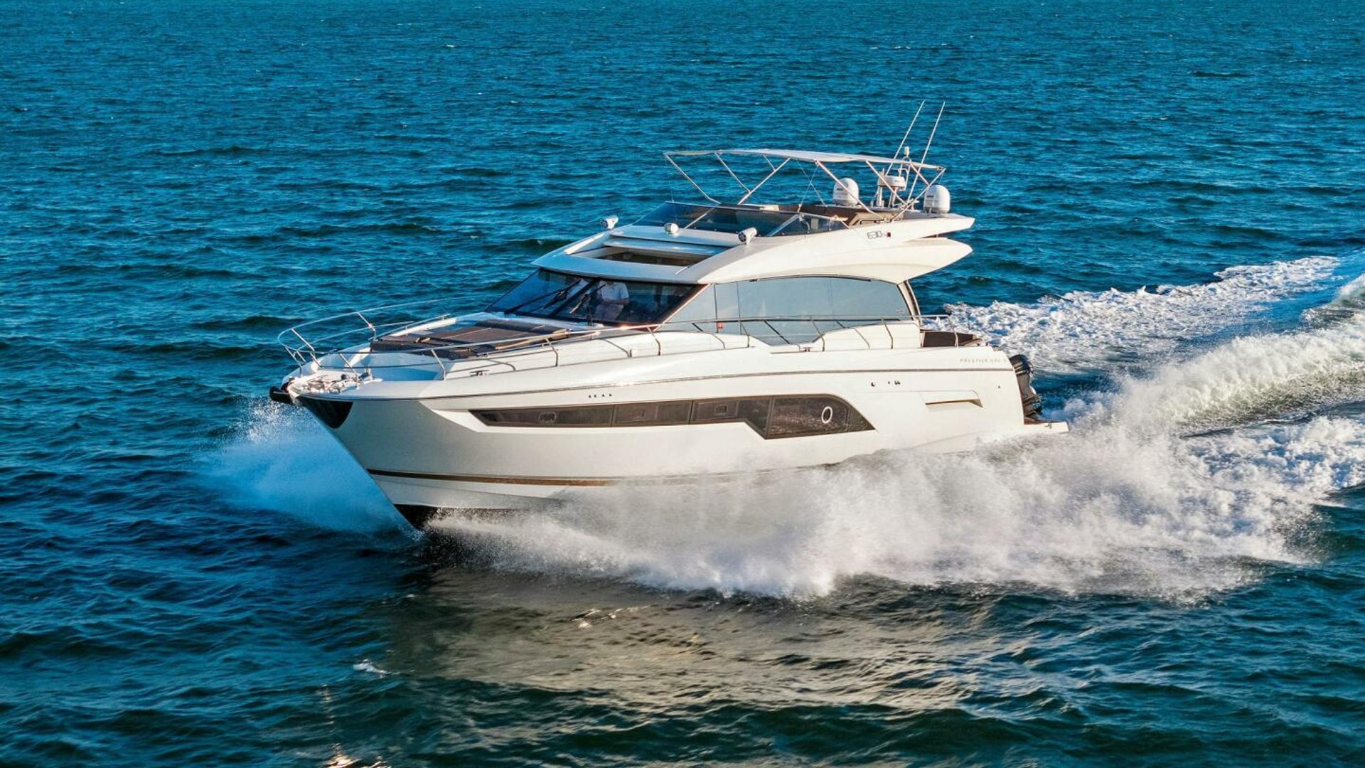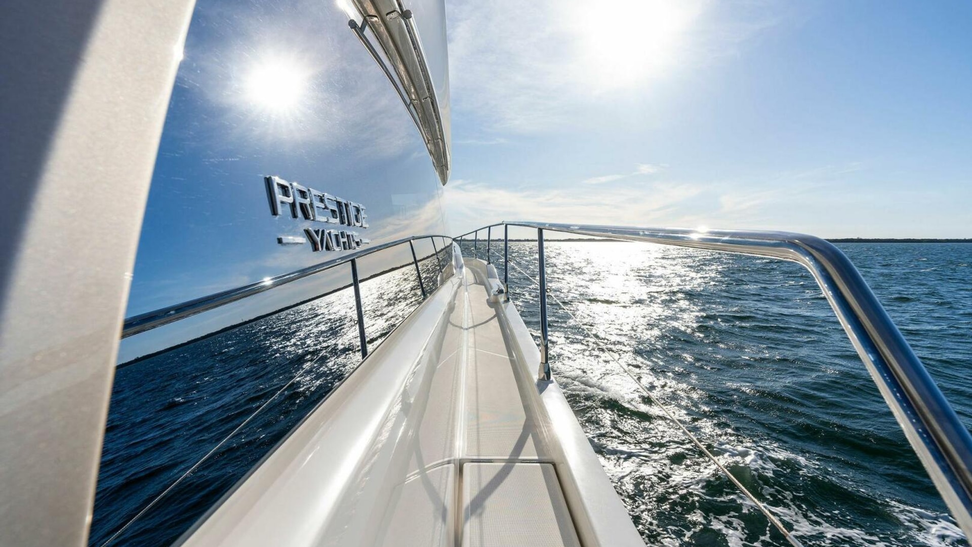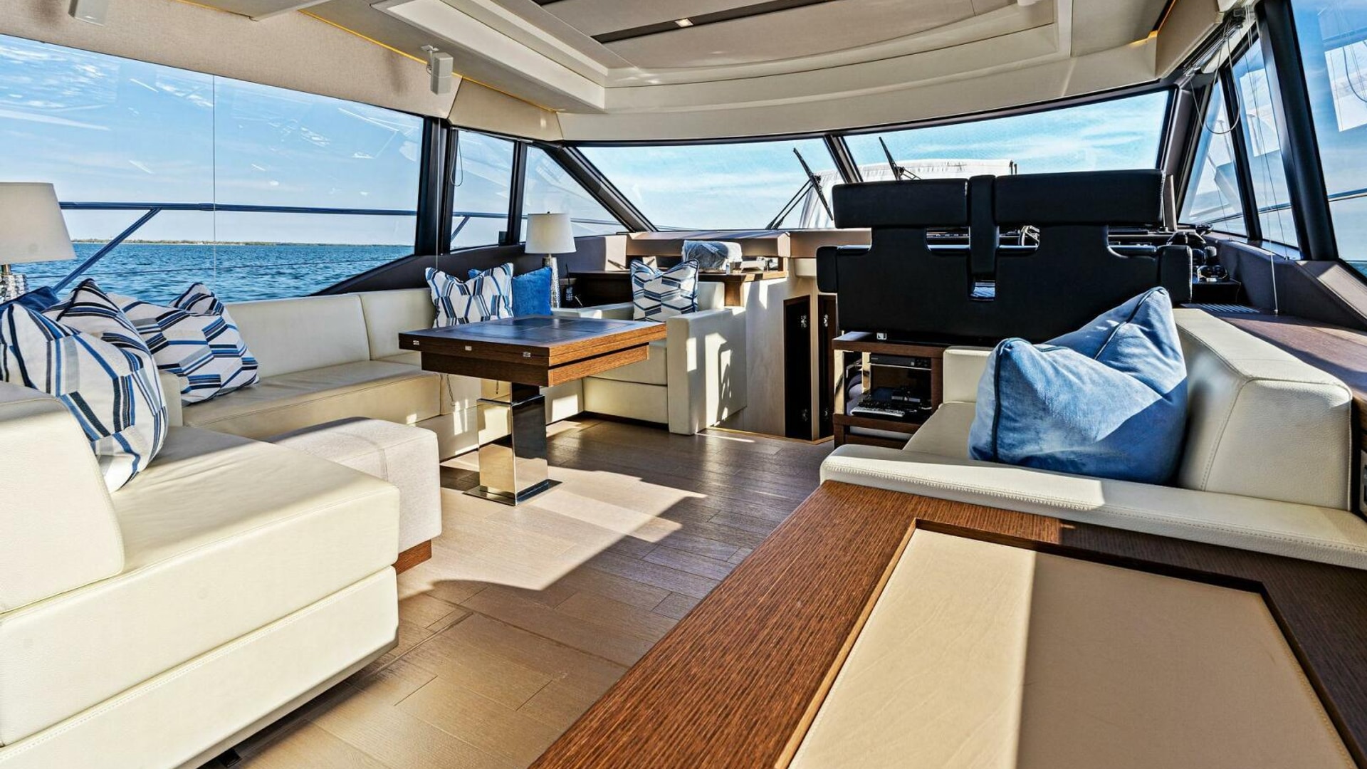 2019 63 Prestige Flybridge - "RT Time" is the only Prestige 630S currently listed for sale in the US. This model offers the best of both worlds with a spacious flybridge and a hydraulic removable bimini top and she transforms into a sleek-looking sport yacht with a large sunroof over the interior helm station.