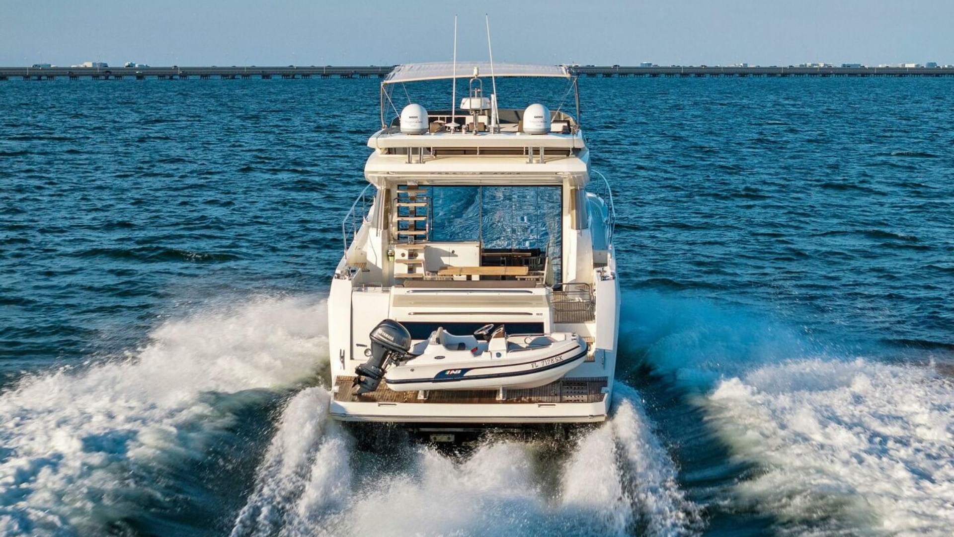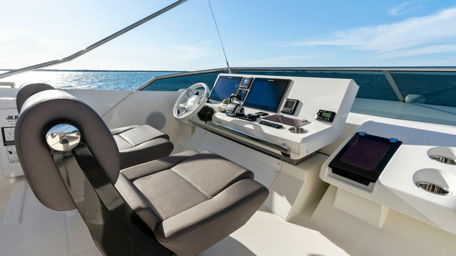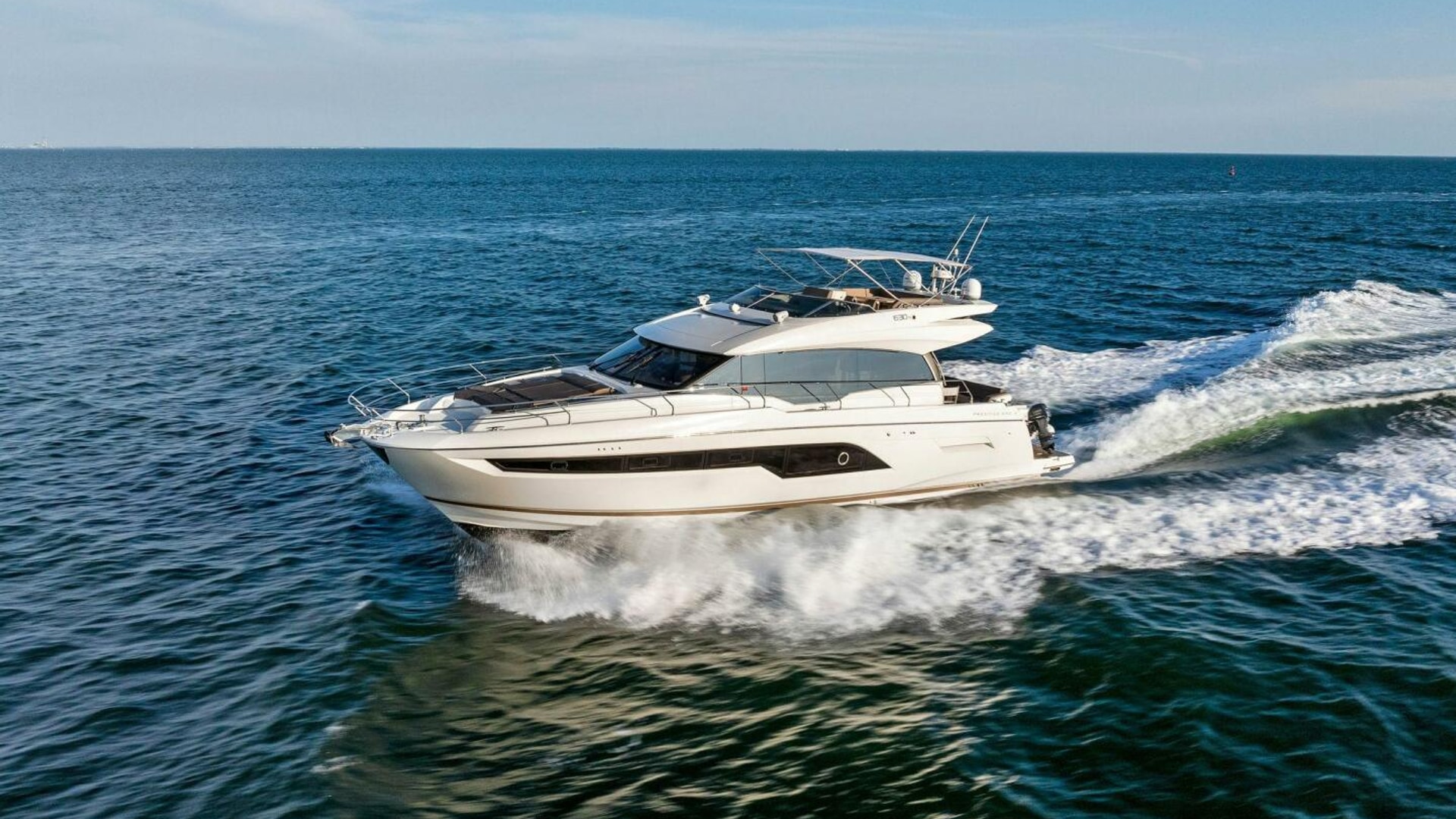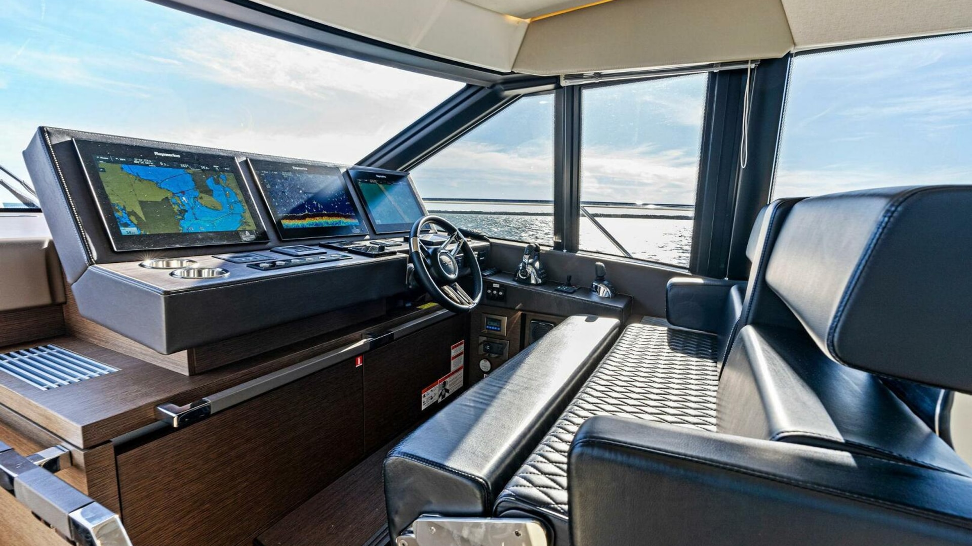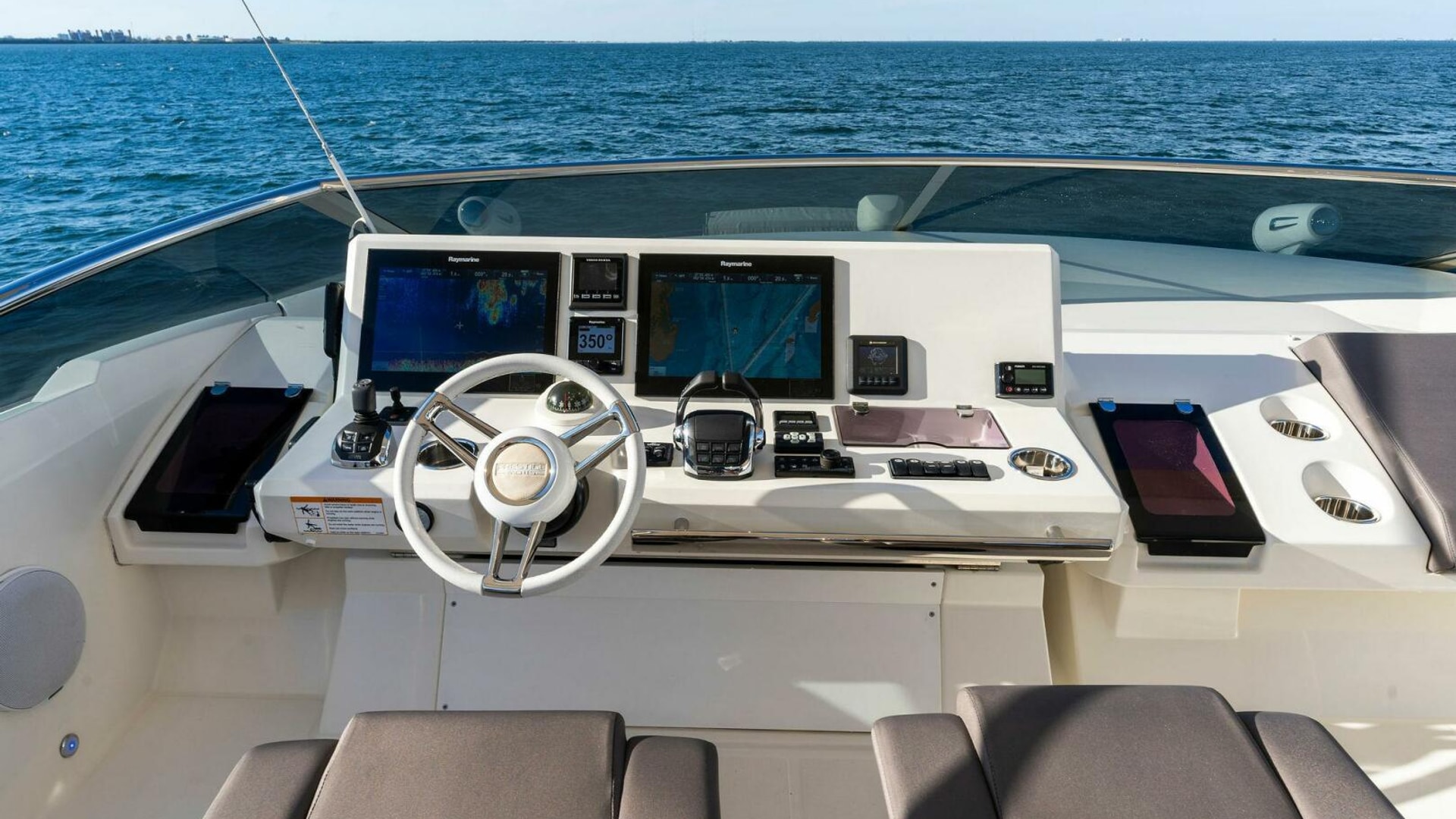 2019 63 Prestige Flybridge - "RT Time" is the only Prestige 630S currently listed for sale in the US. This model offers the best of both worlds with a spacious flybridge and a hydraulic removable bimini top and she transforms into a sleek-looking sport yacht with a large sunroof over the interior helm station.