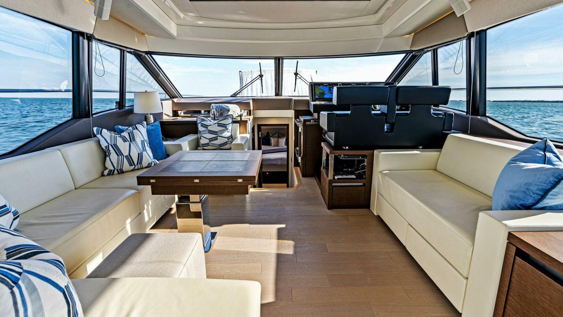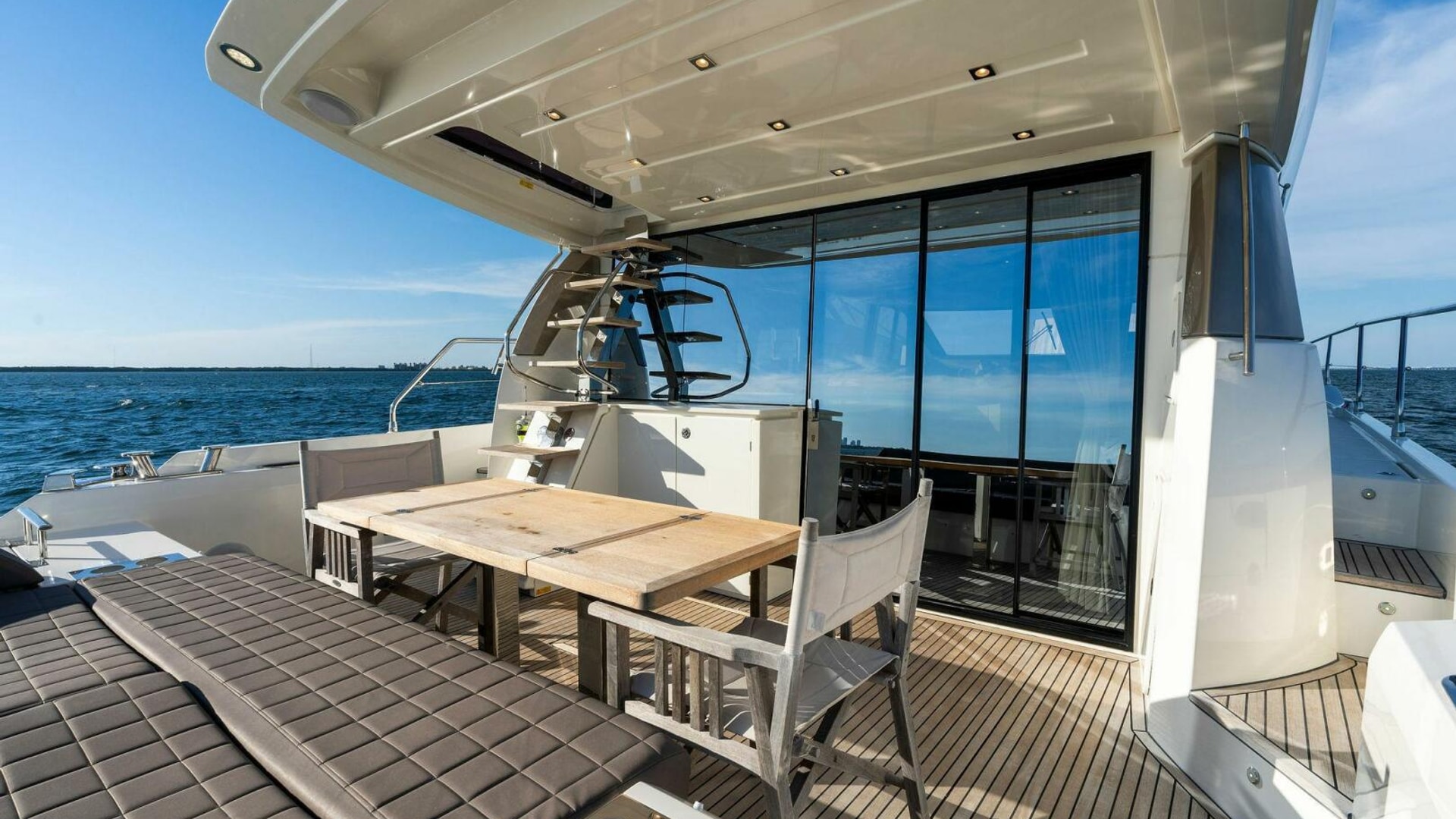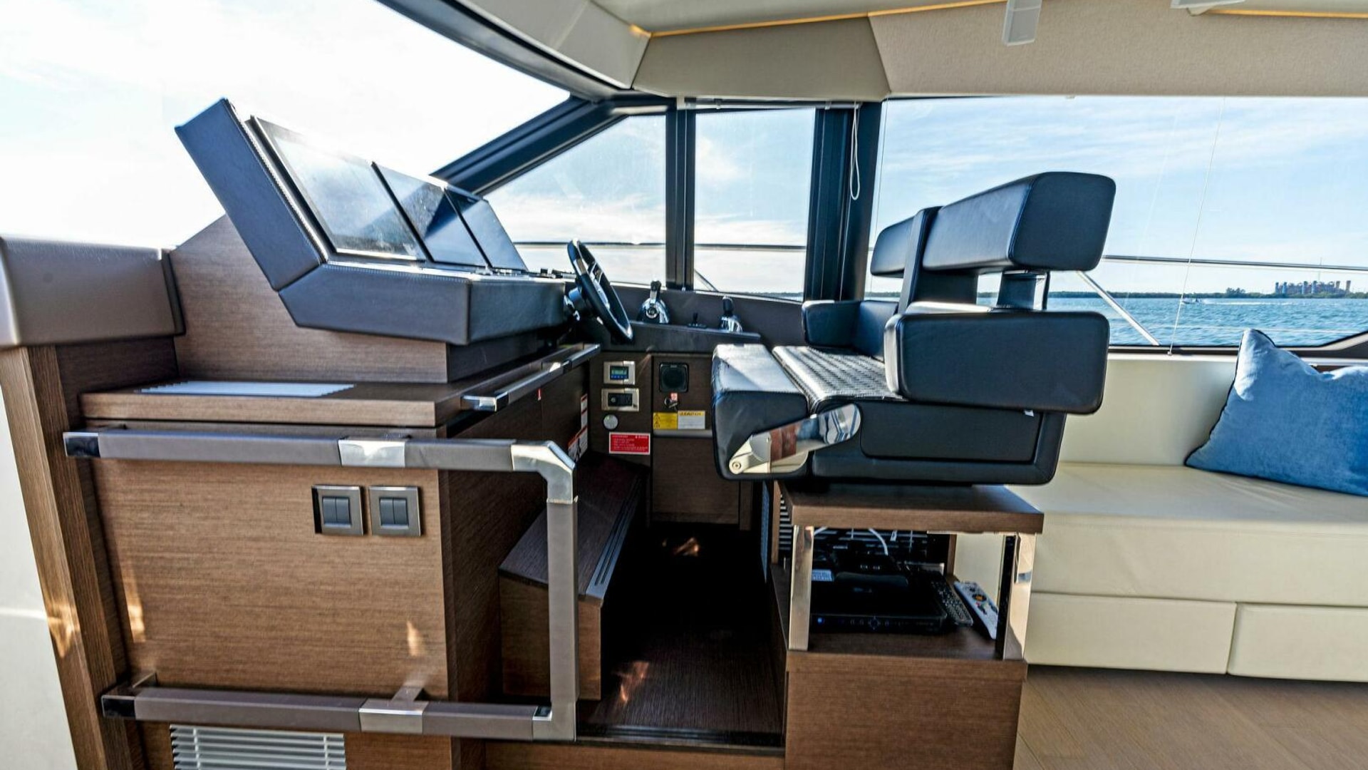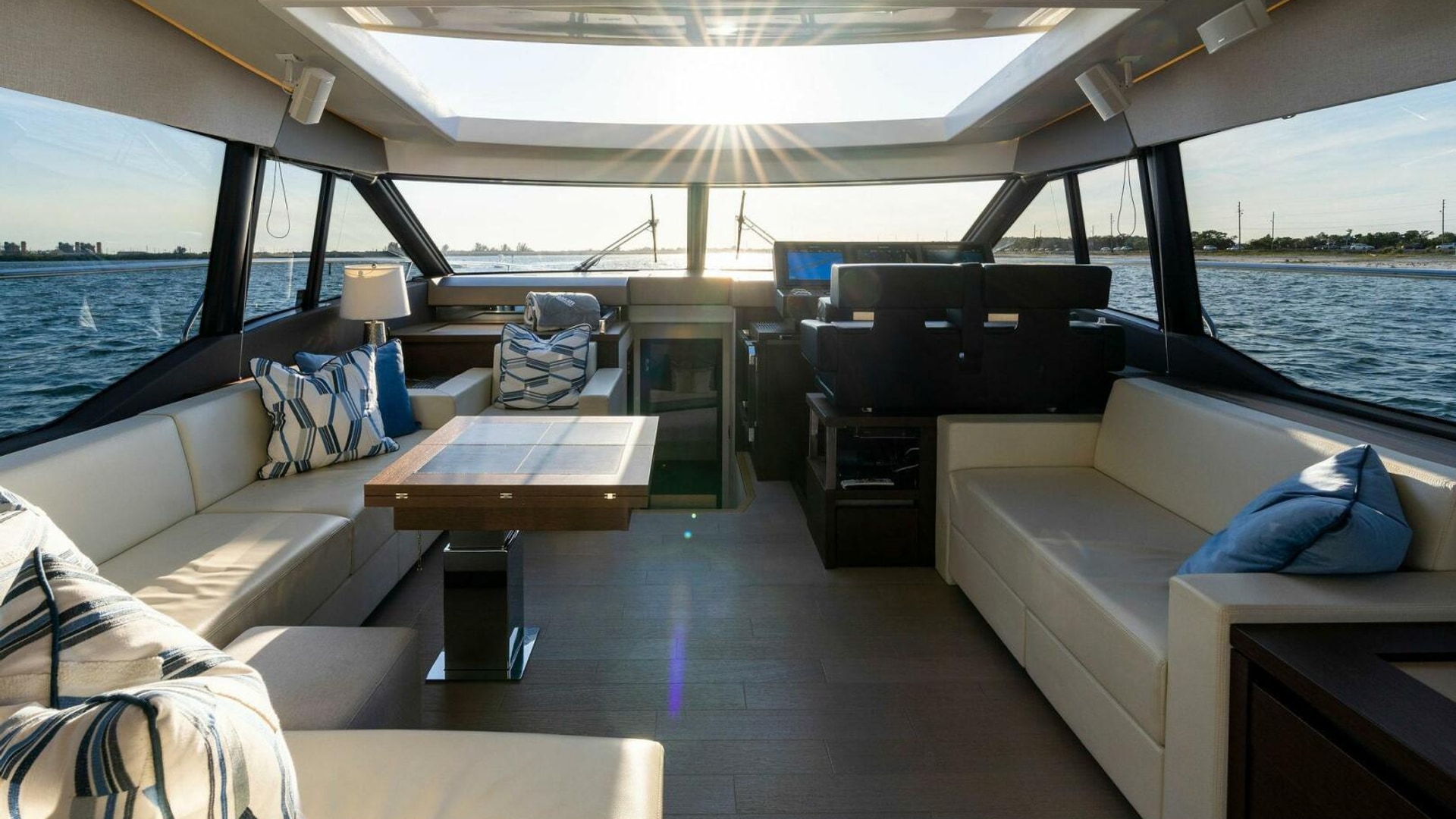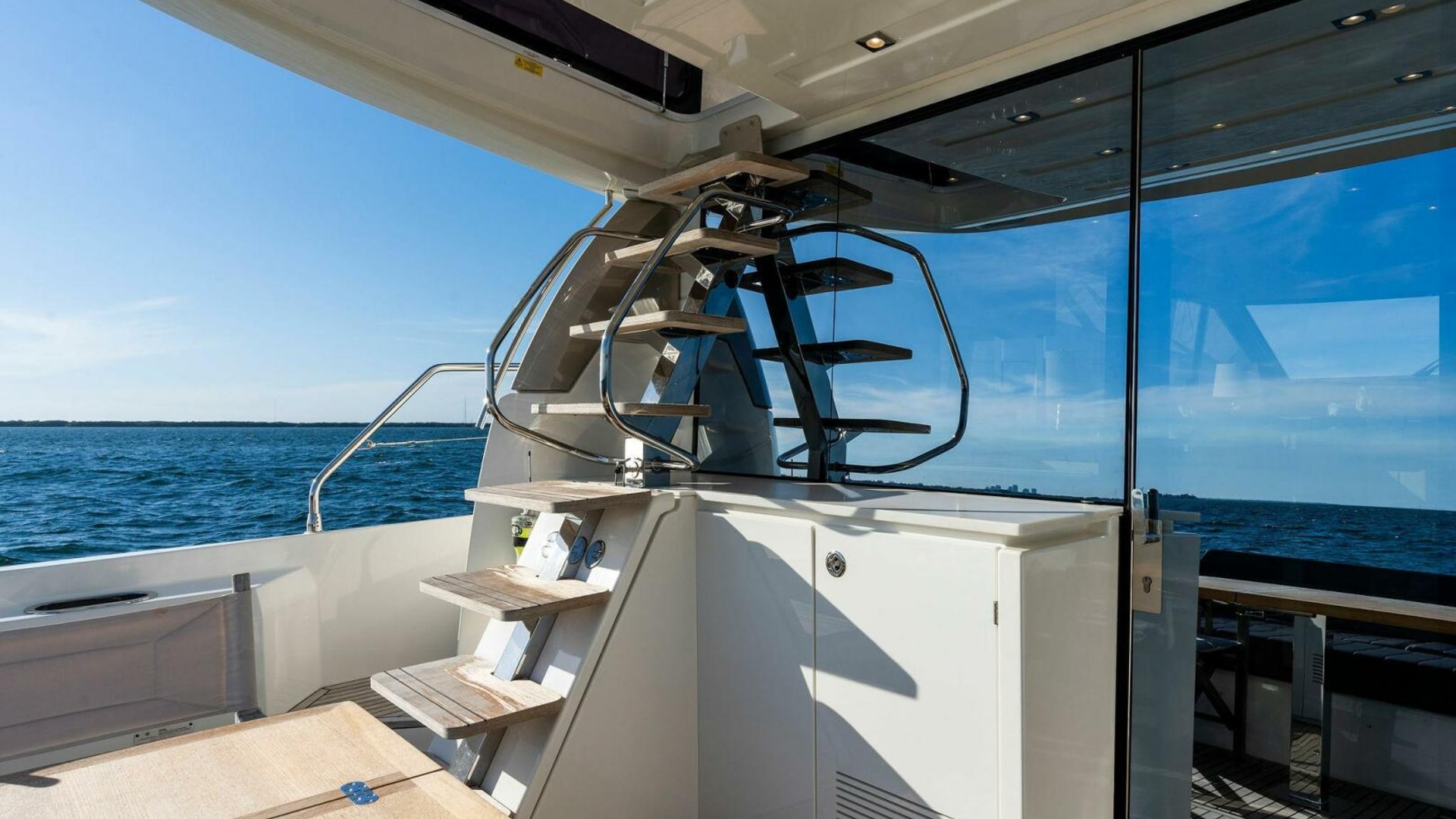2019 63 Prestige Flybridge - "RT Time" is the only Prestige 630S currently listed for sale in the US. This model offers the best of both worlds with a spacious flybridge and a hydraulic removable bimini top and she transforms into a sleek-looking sport yacht with a large sunroof over the interior helm station.