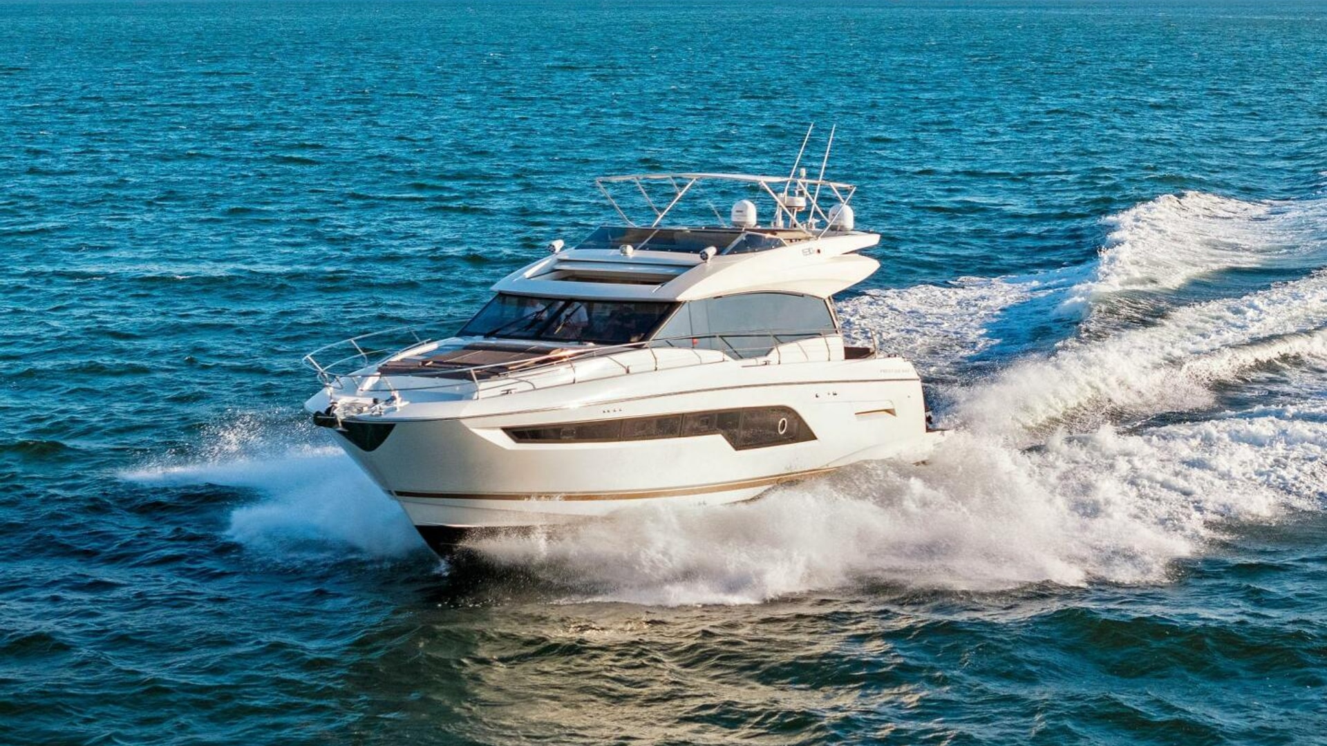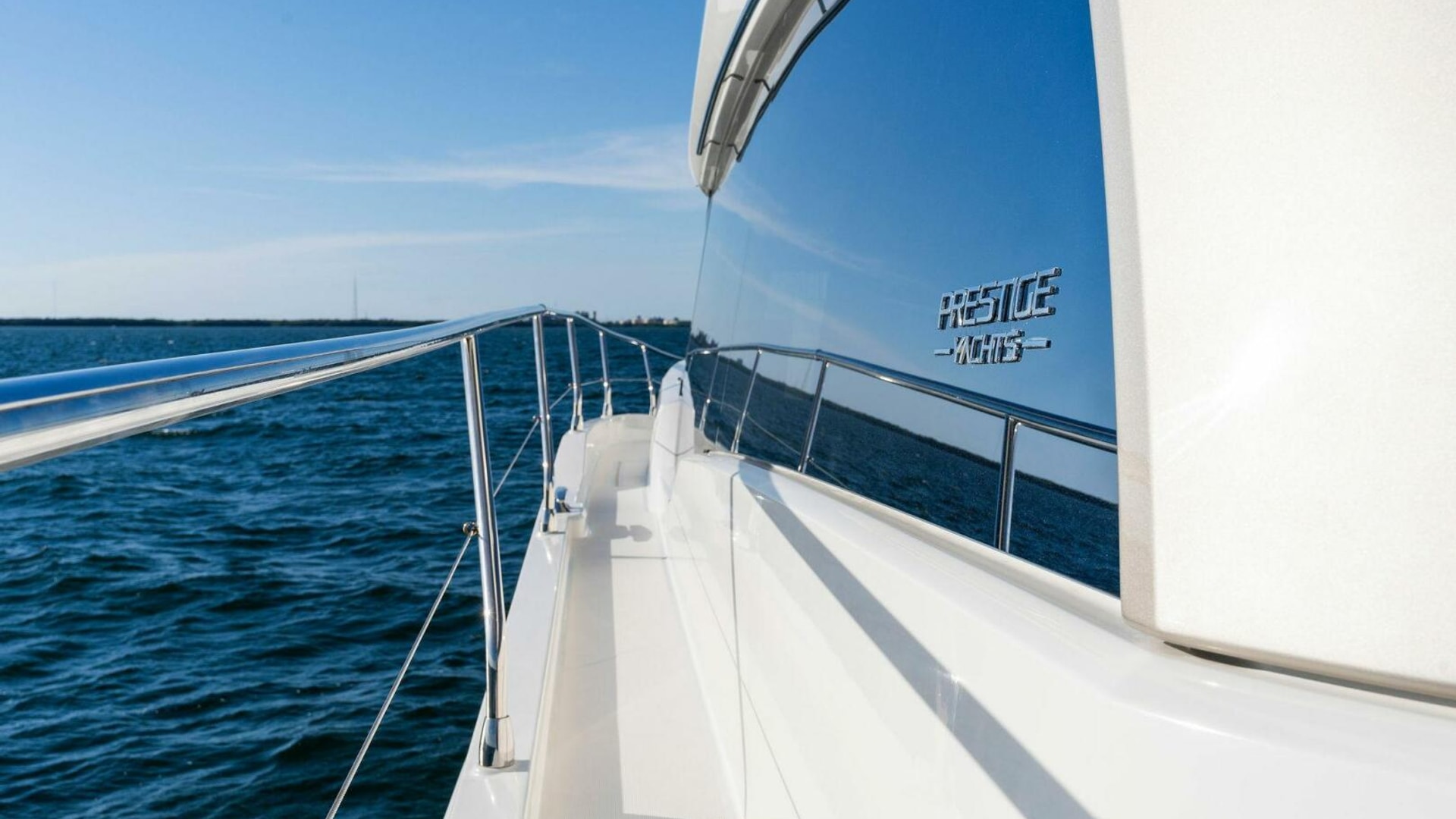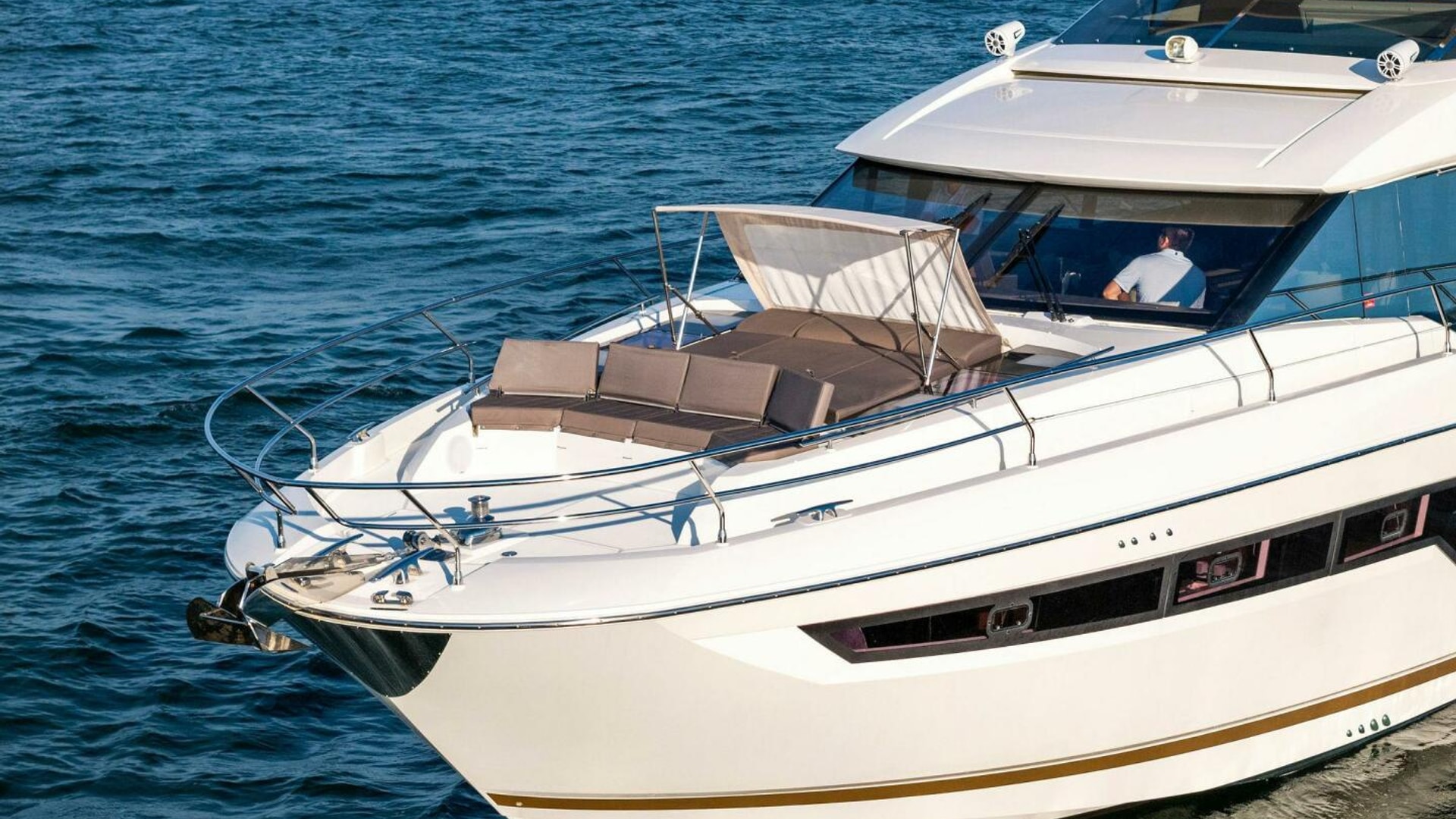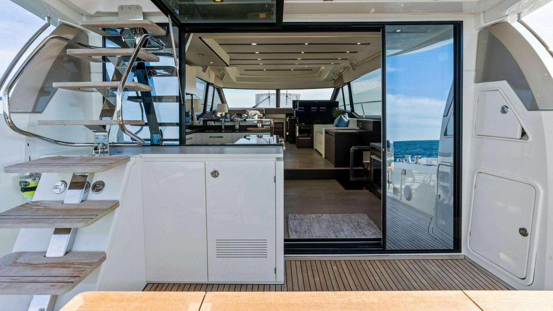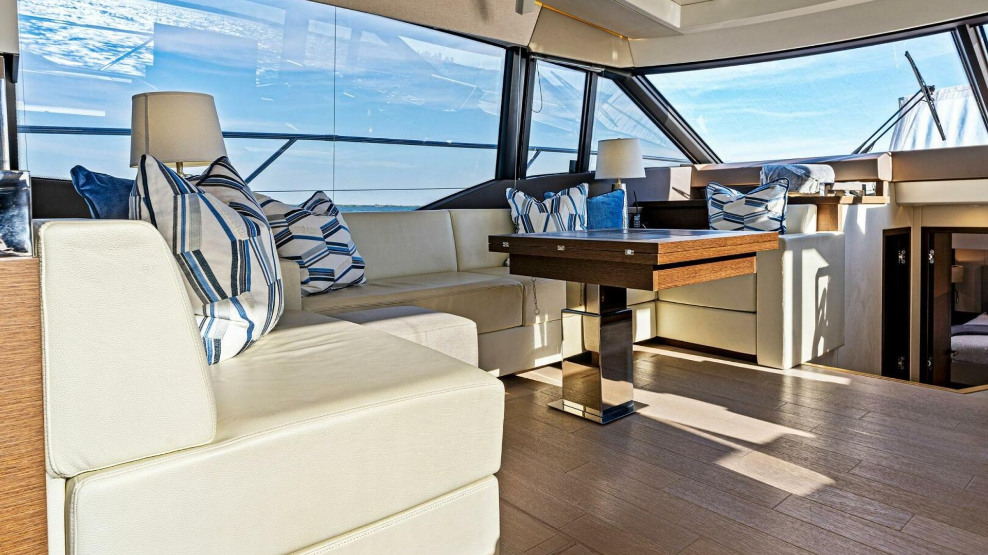 2019 63 Prestige Flybridge - "RT Time" is the only Prestige 630S currently listed for sale in the US. This model offers the best of both worlds with a spacious flybridge and a hydraulic removable bimini top and she transforms into a sleek-looking sport yacht with a large sunroof over the interior helm station.