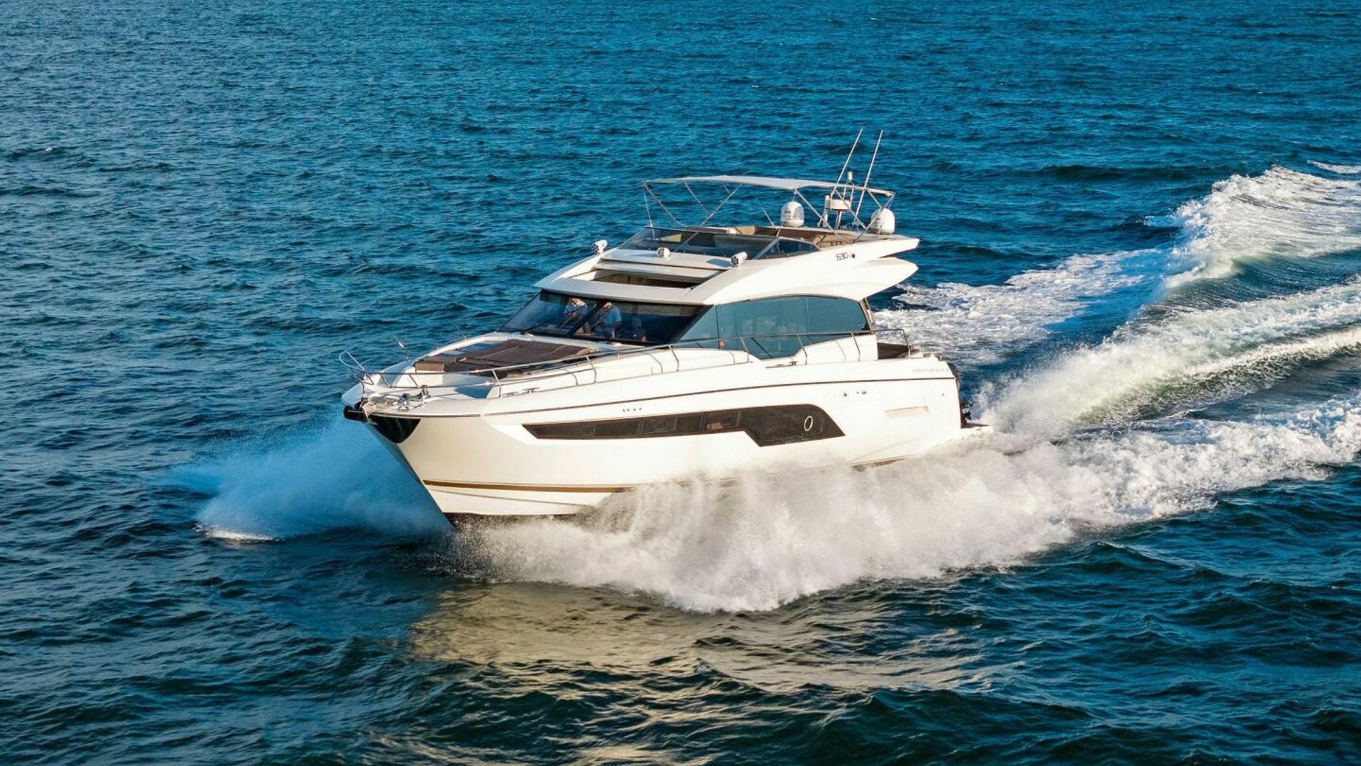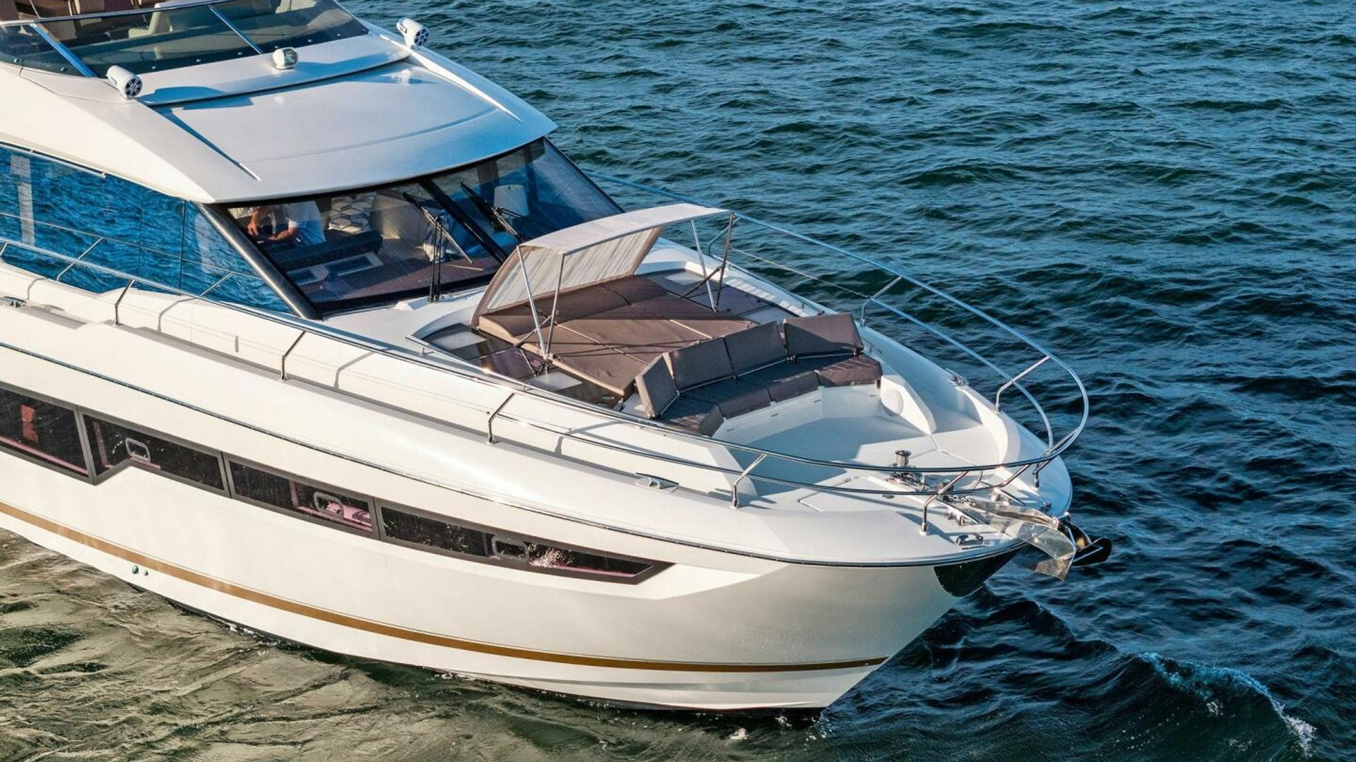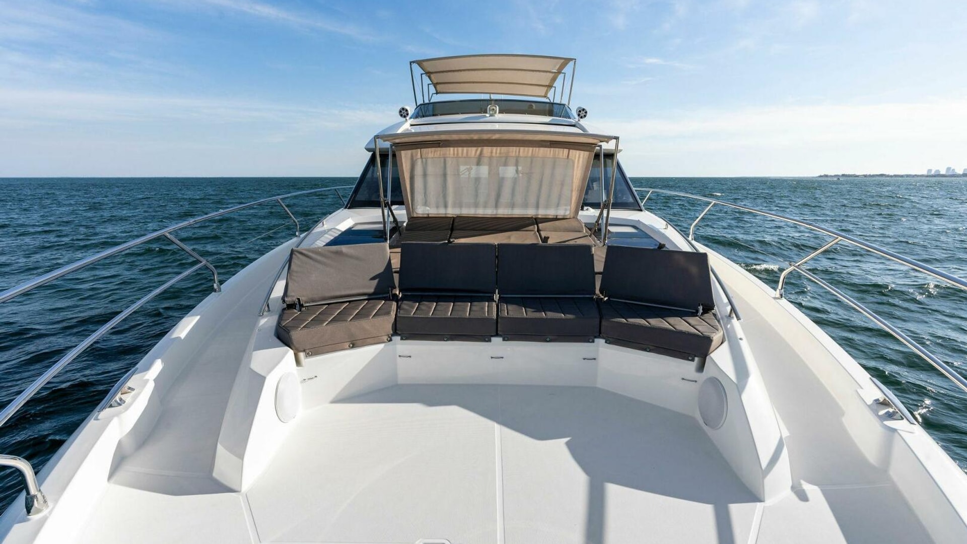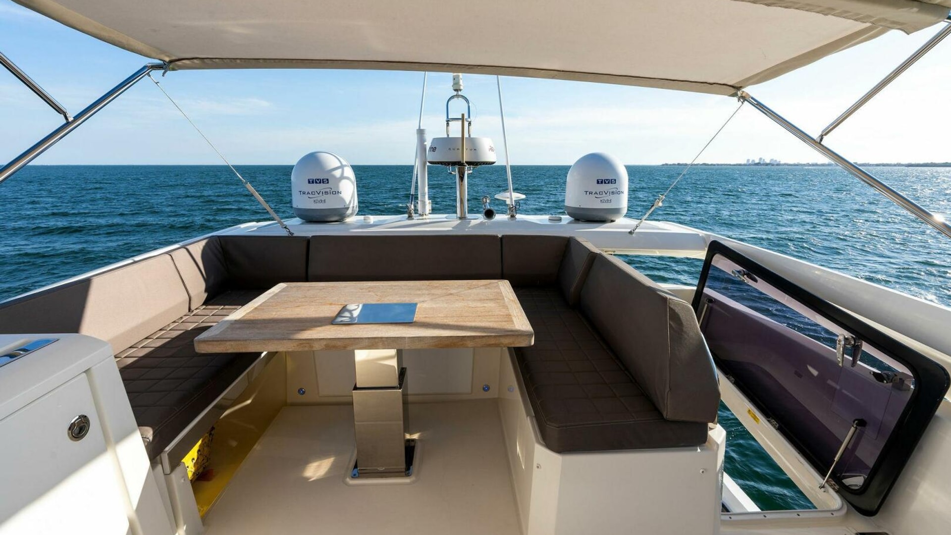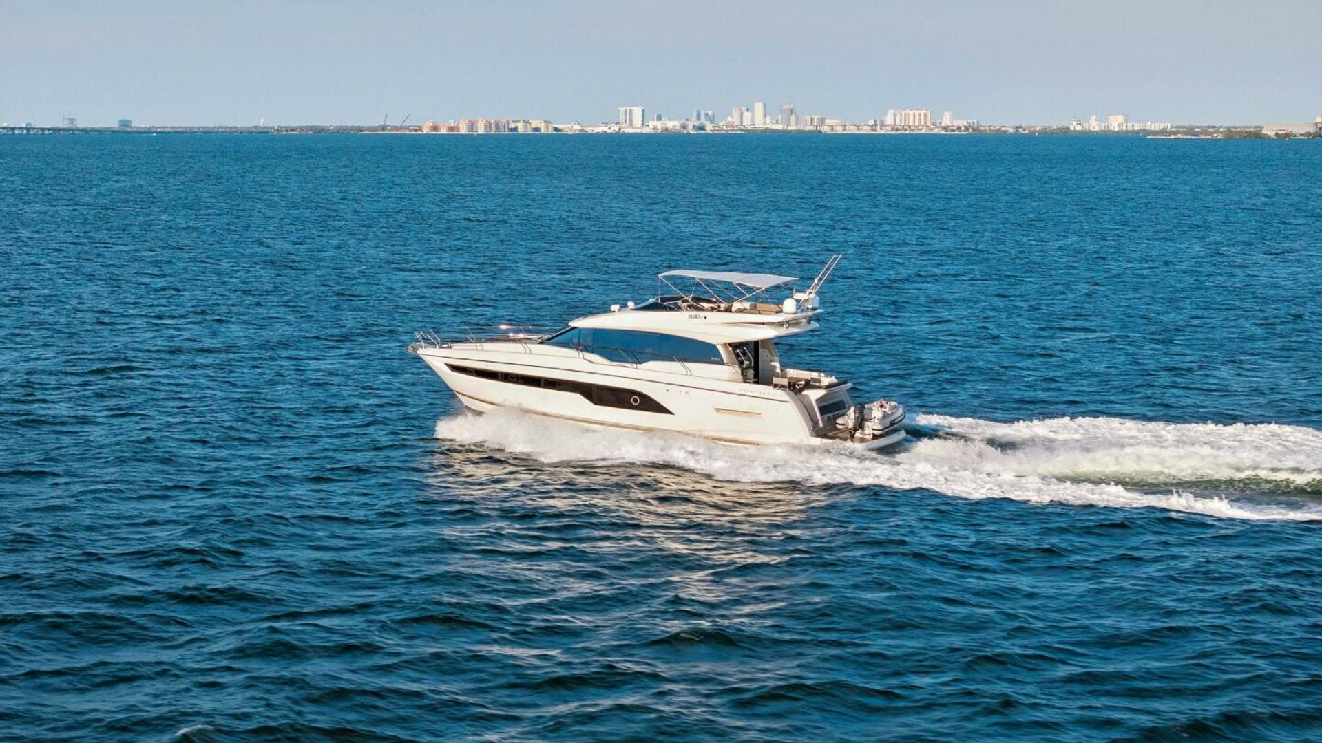 2019 63 Prestige Flybridge - "RT Time" is the only Prestige 630S currently listed for sale in the US. This model offers the best of both worlds with a spacious flybridge and a hydraulic removable bimini top and she transforms into a sleek-looking sport yacht with a large sunroof over the interior helm station.