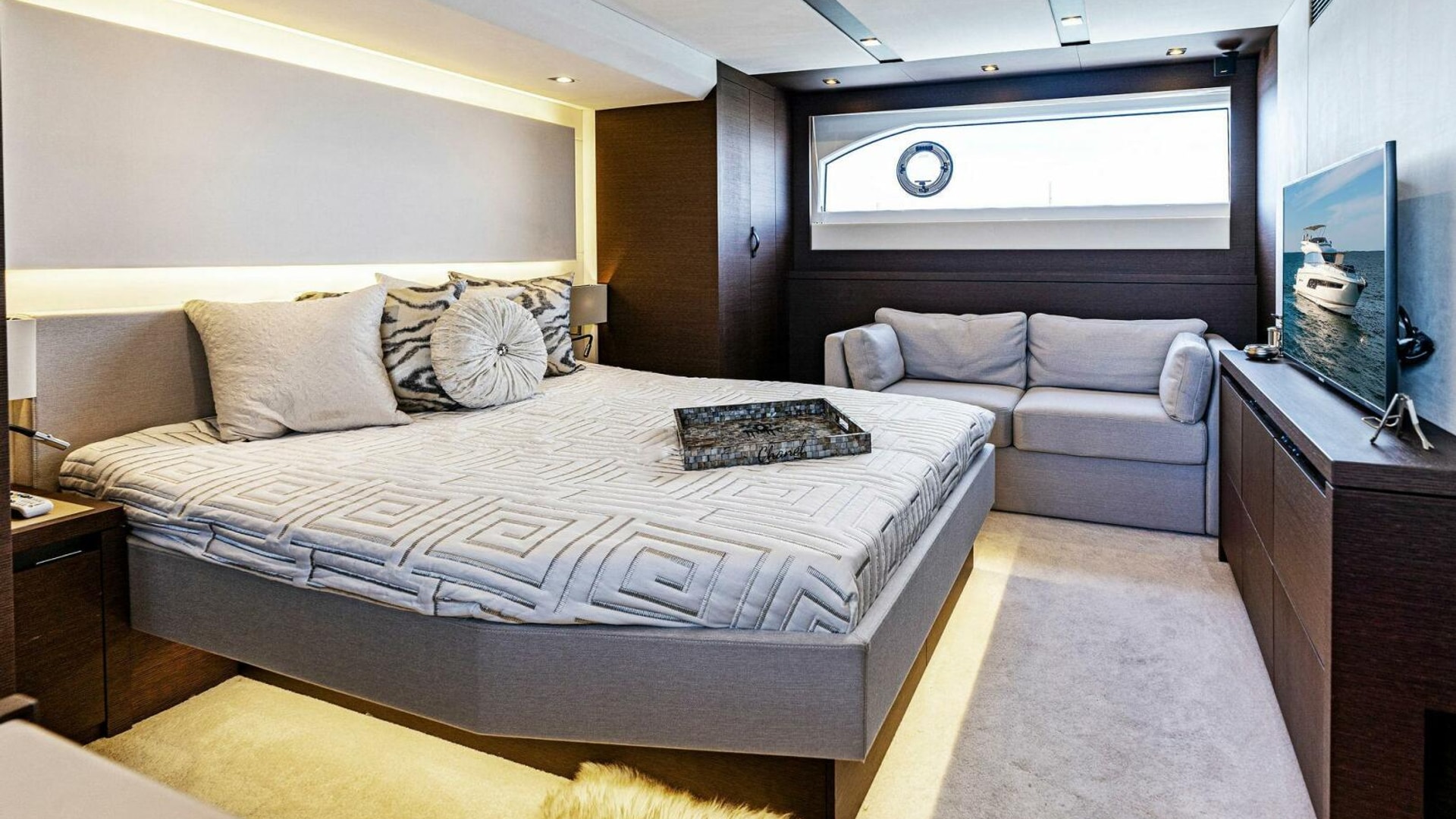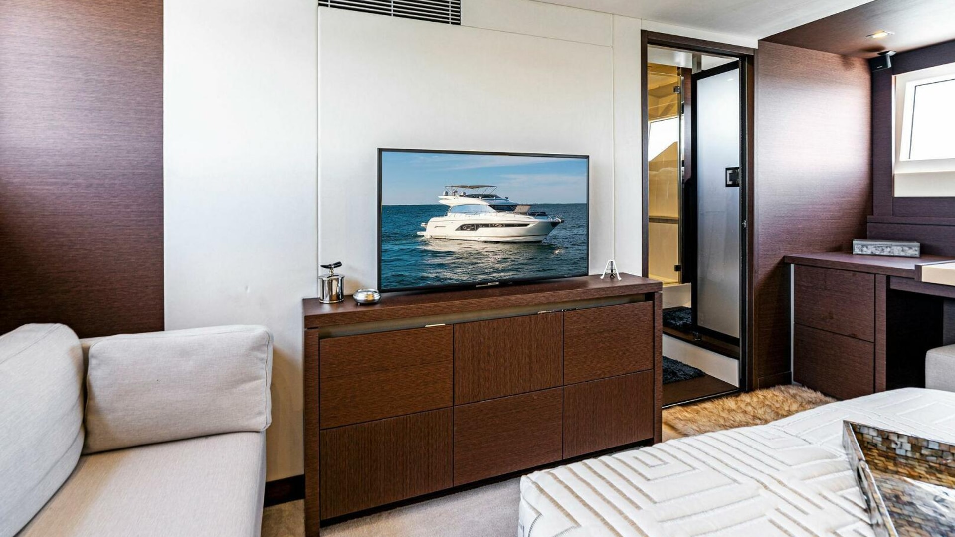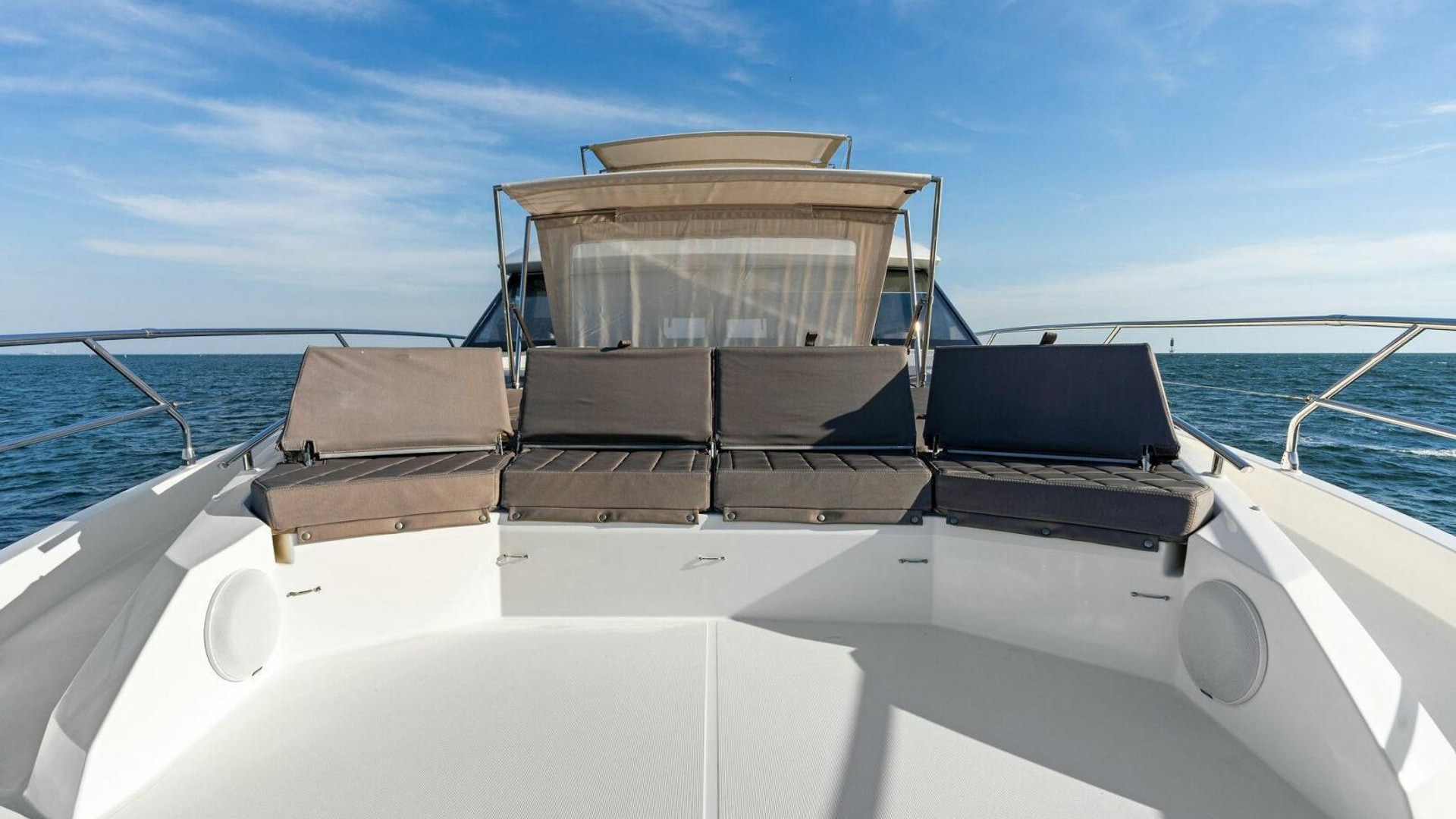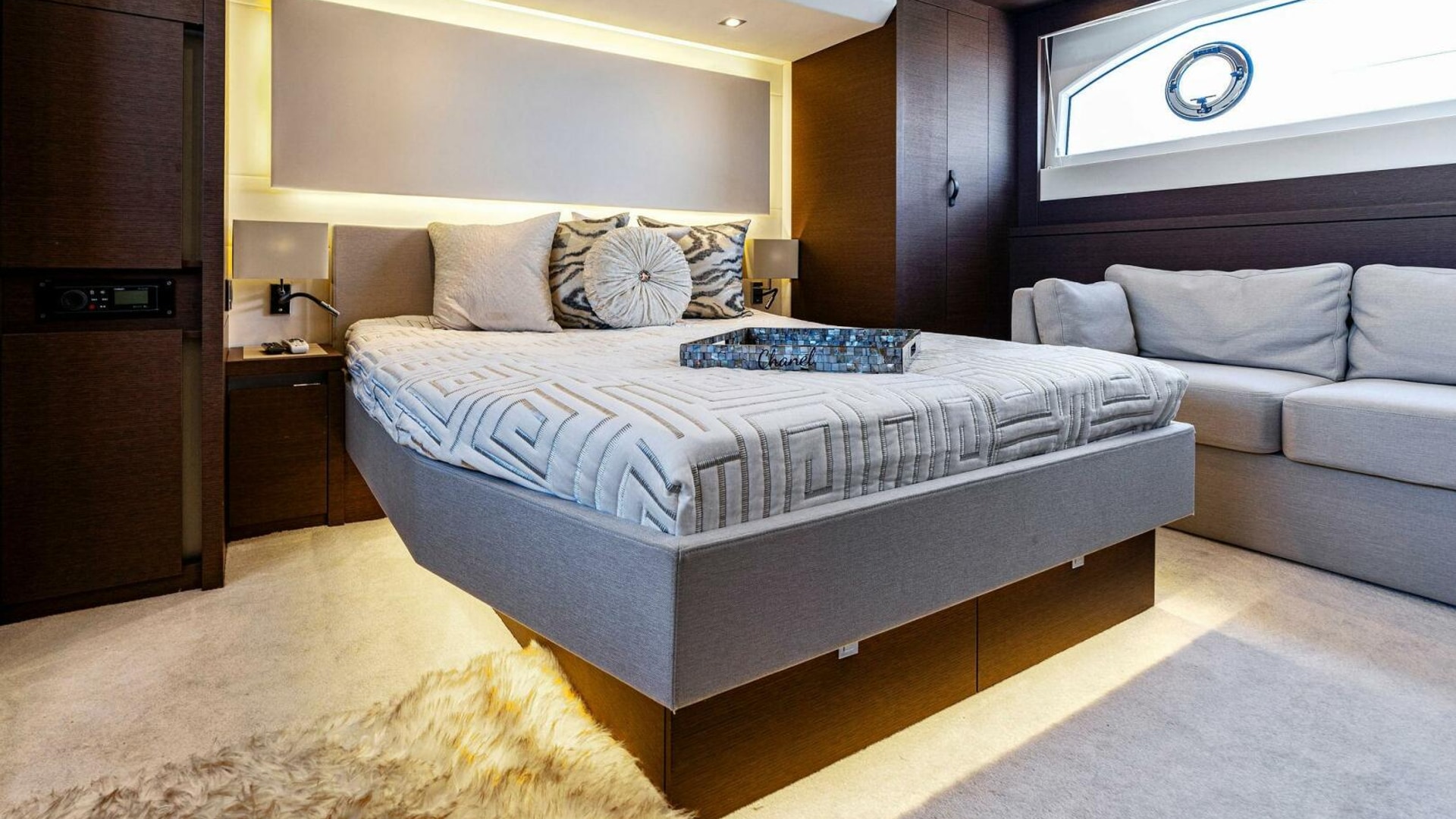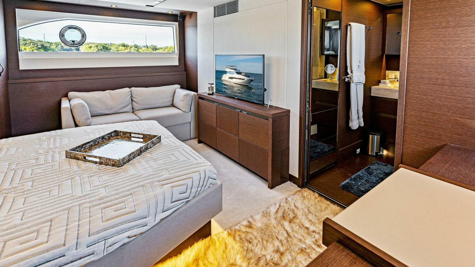 2019 63 Prestige Flybridge - "RT Time" is the only Prestige 630S currently listed for sale in the US. This model offers the best of both worlds with a spacious flybridge and a hydraulic removable bimini top and she transforms into a sleek-looking sport yacht with a large sunroof over the interior helm station.