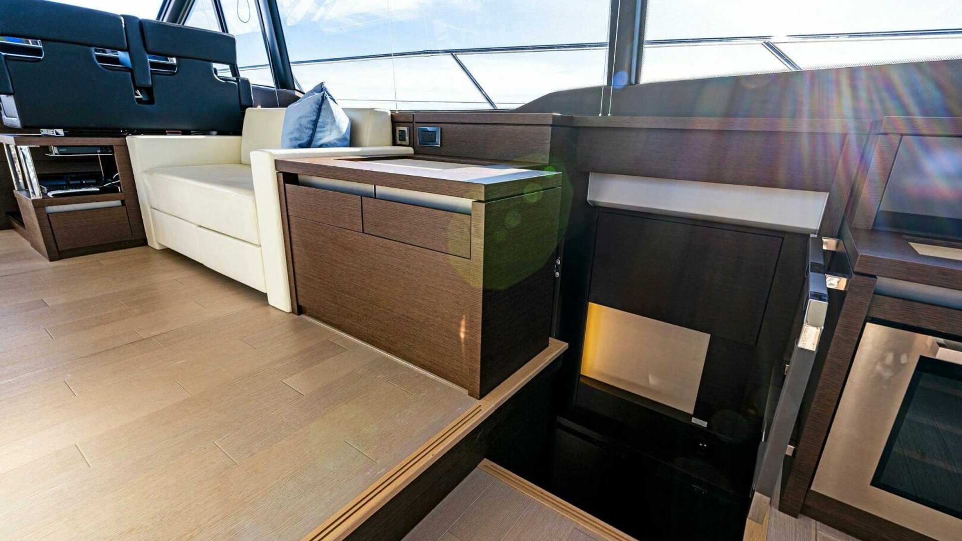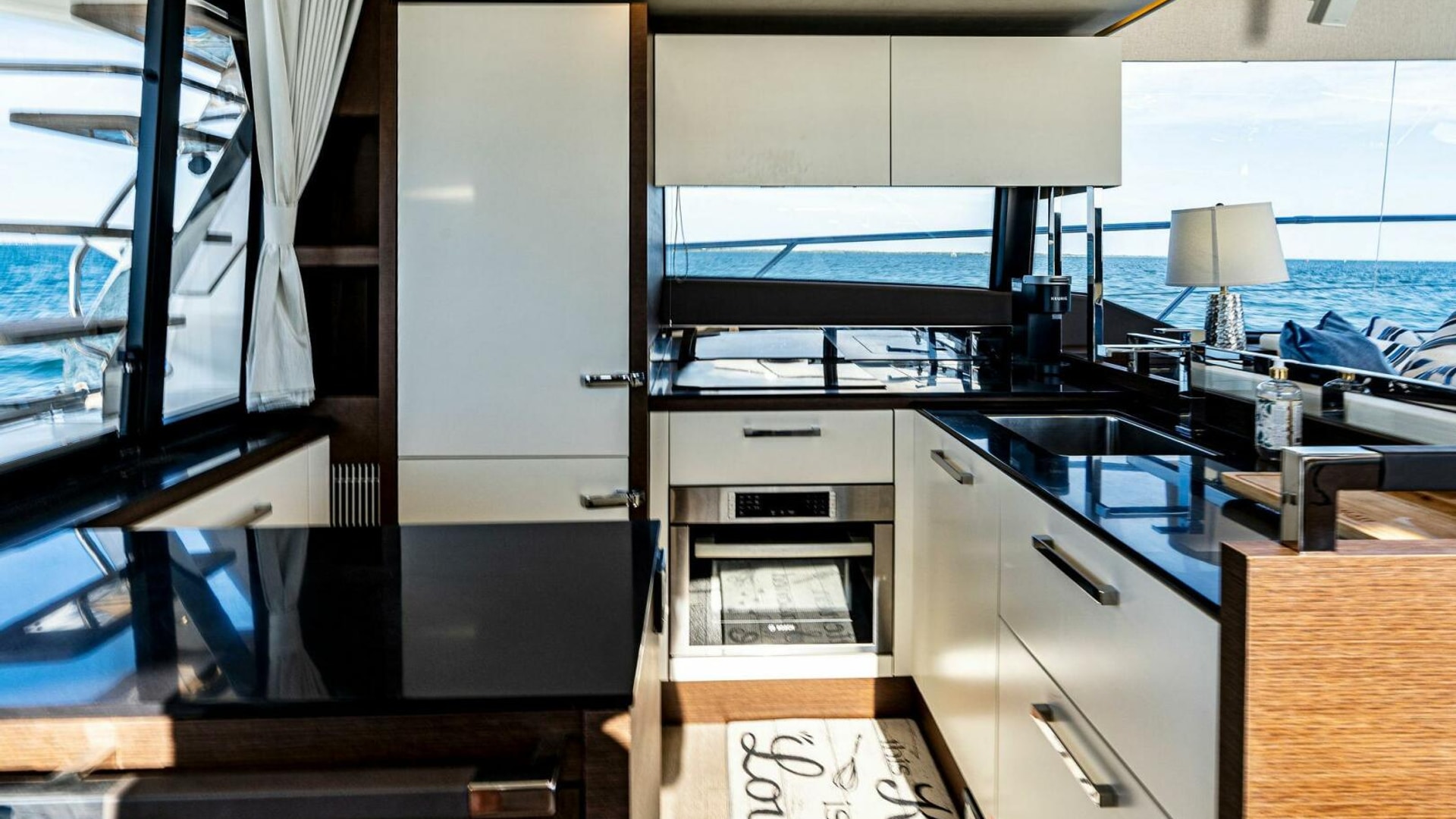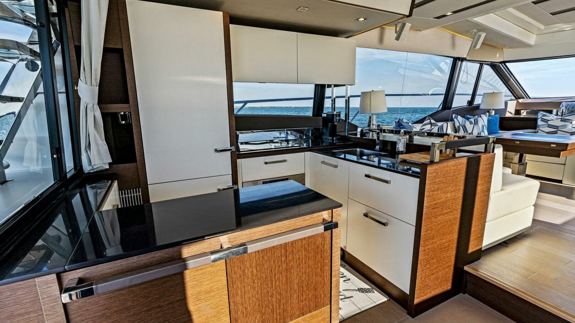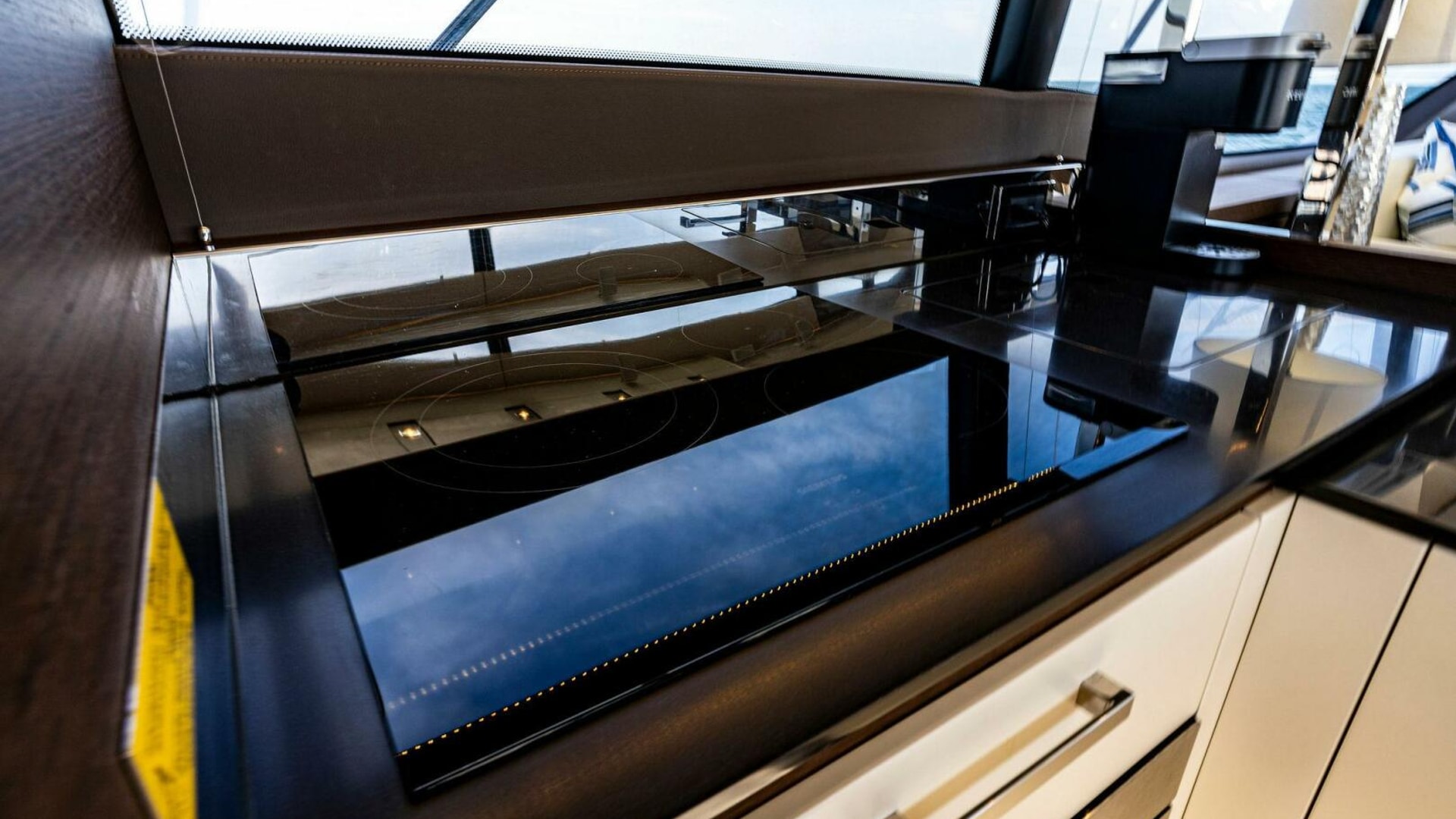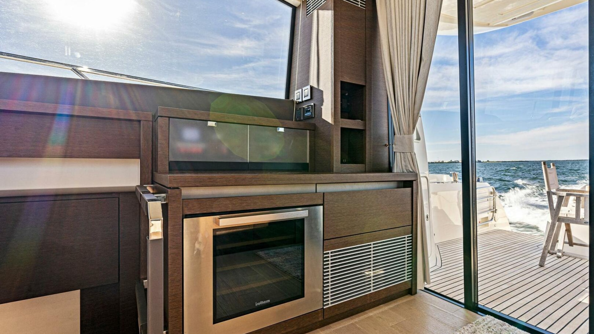- Flybridge galley has Kenyon electric grill, stainless steel cupholders, prep sink, and serving bar
