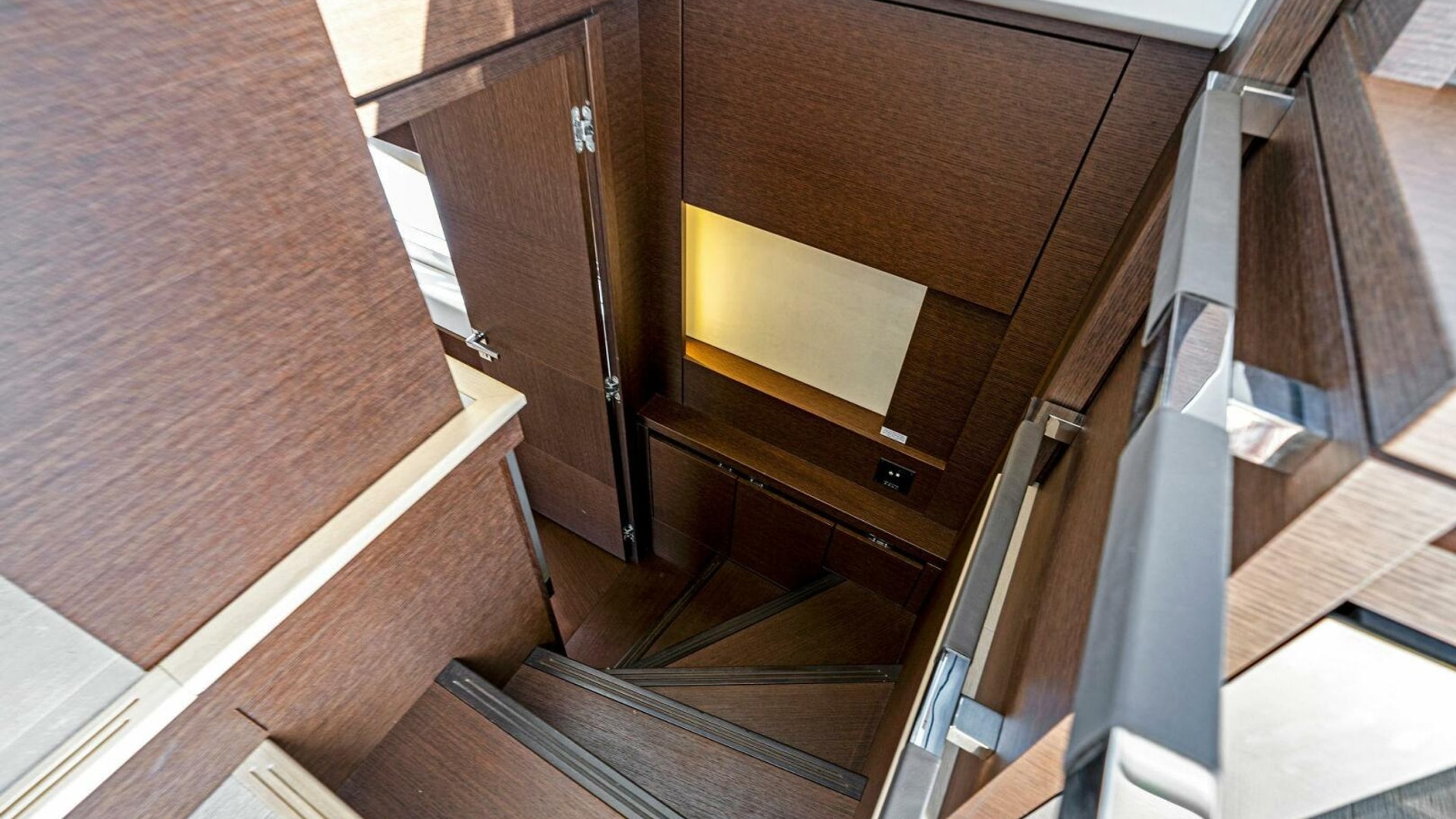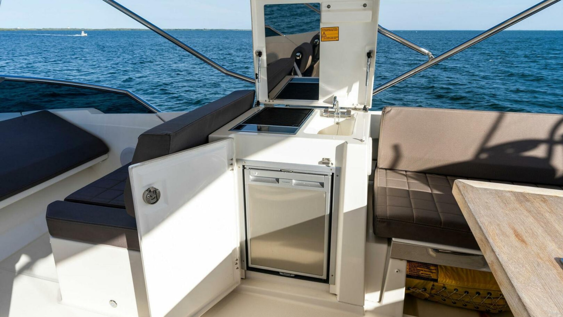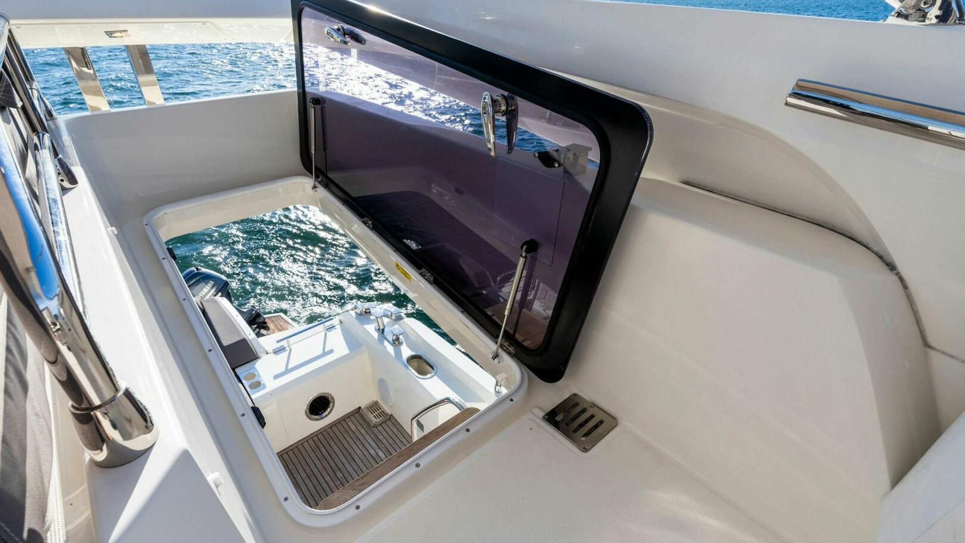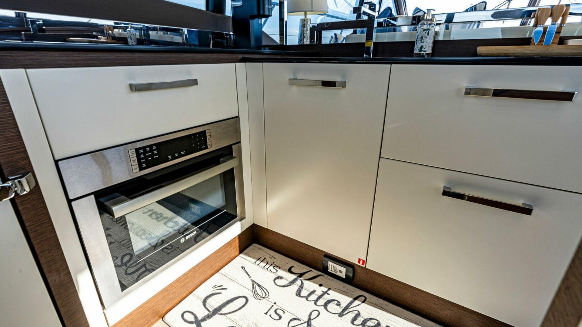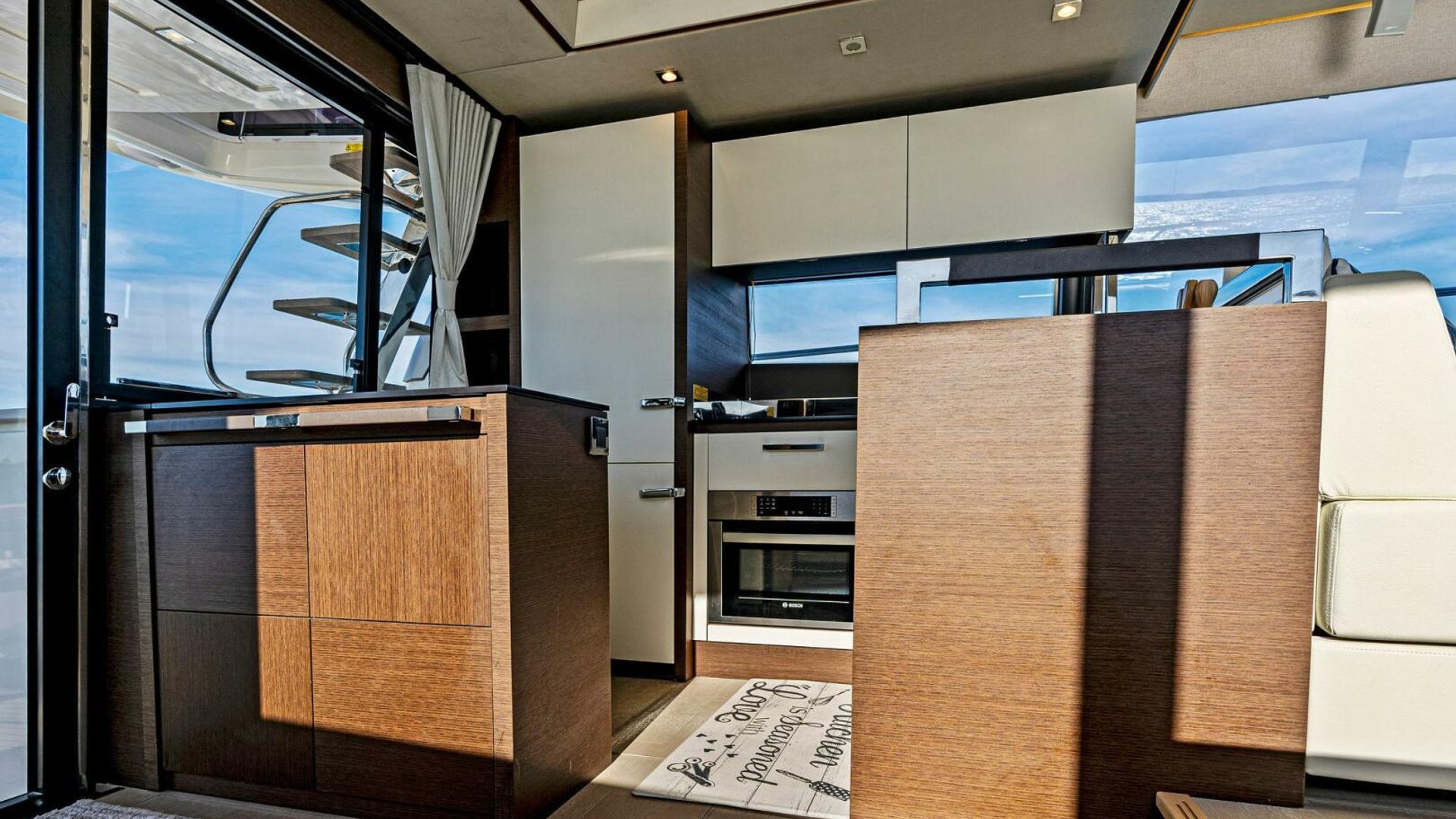 - Flybridge galley has Kenyon electric grill, stainless steel cupholders, prep sink, and serving bar