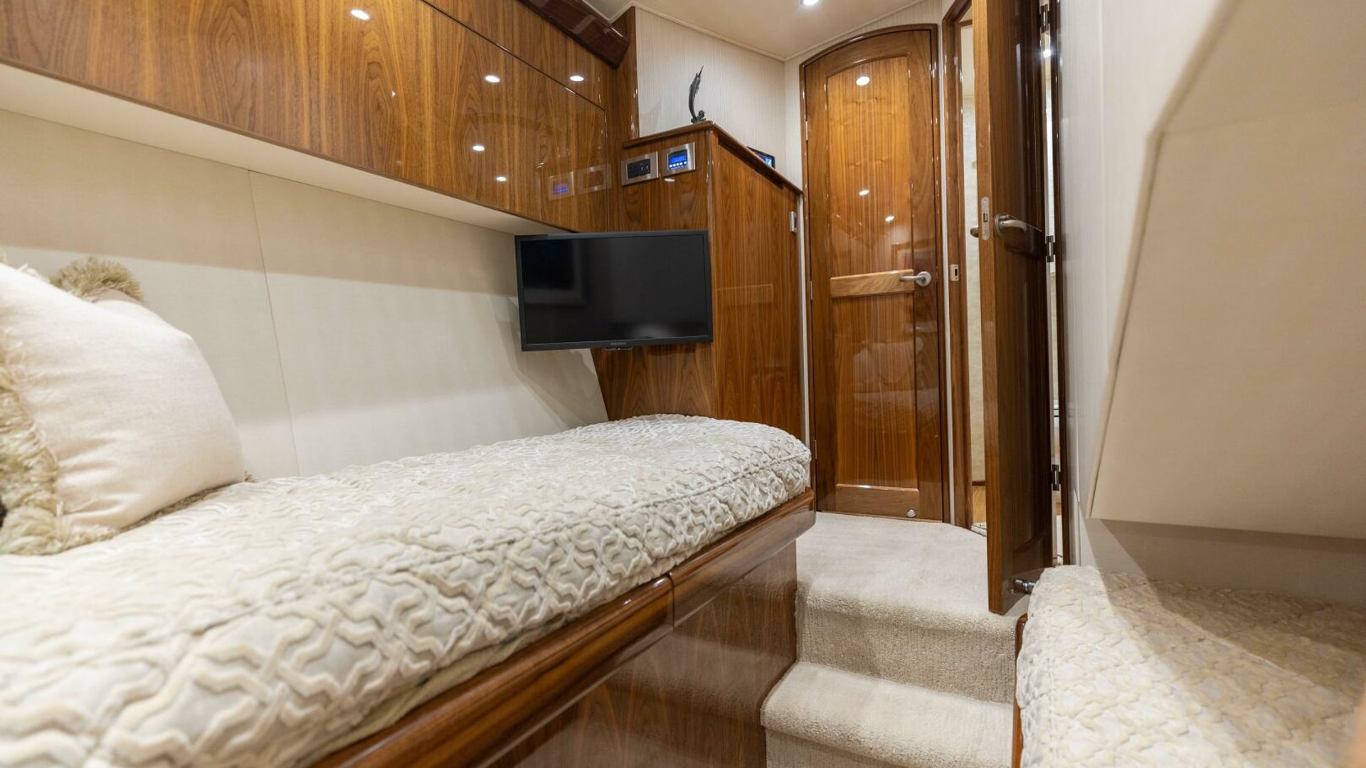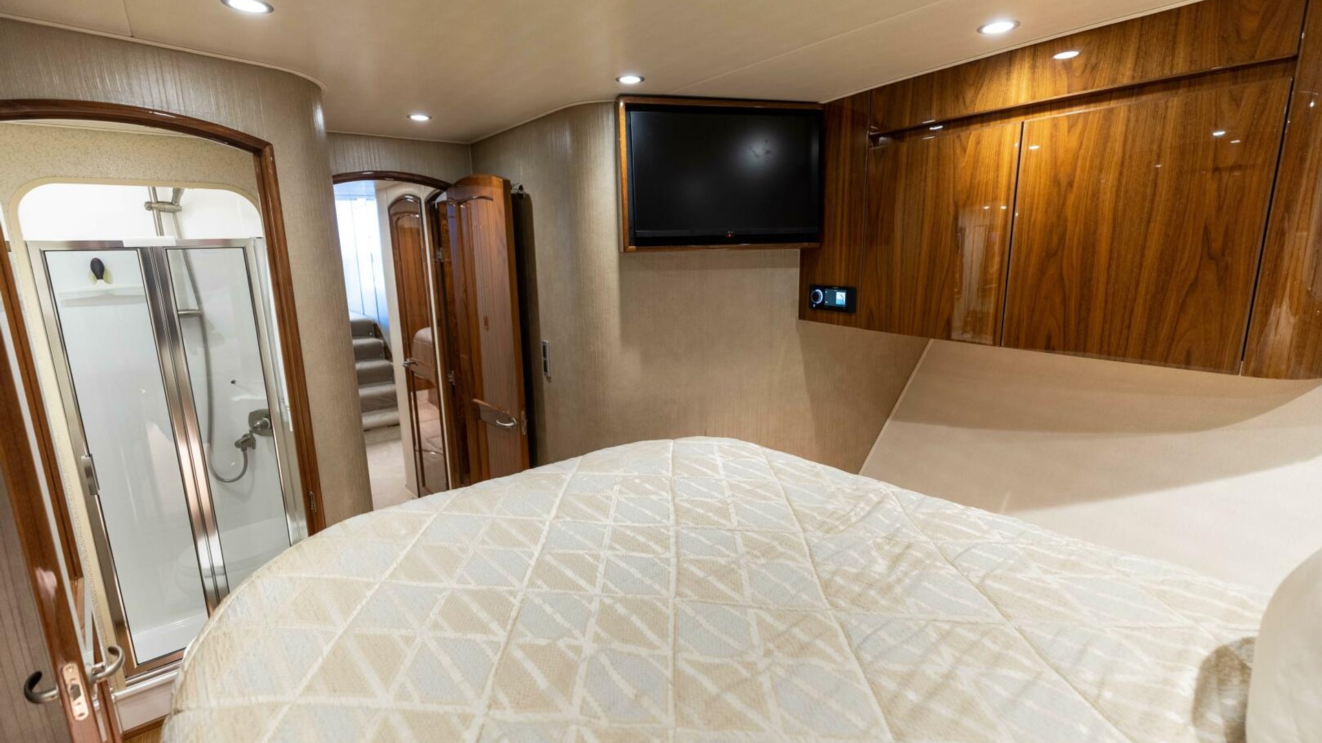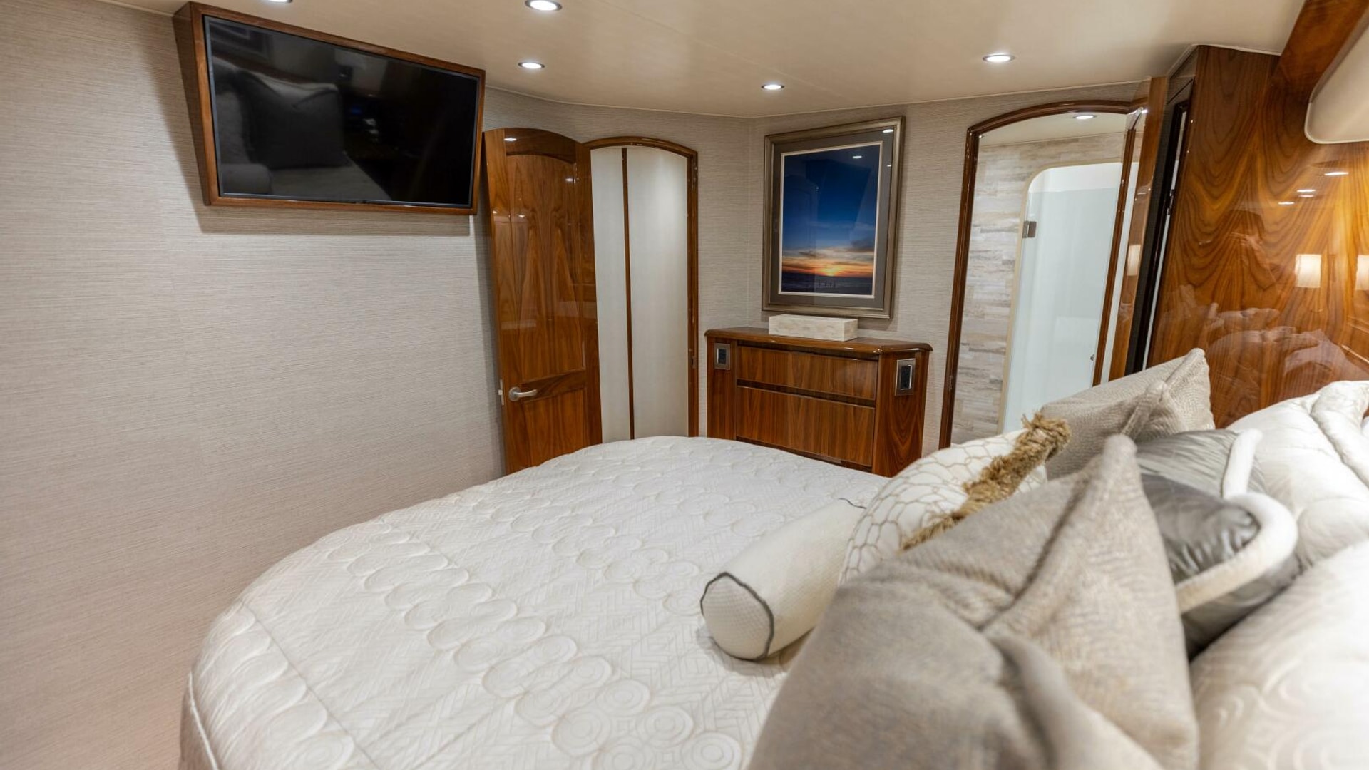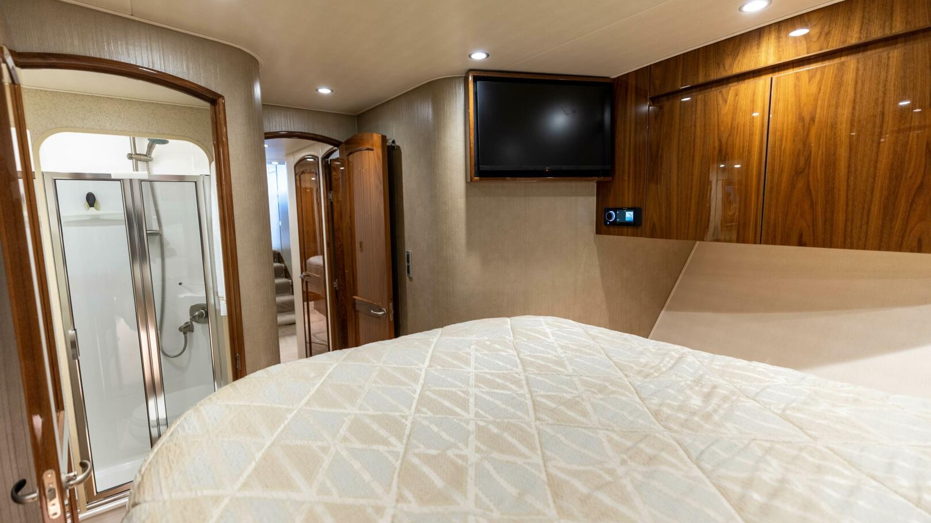 Four-stateroom layout, the two port staterooms share the port head. While all of the staterooms offer generous accommodations, including System #1 innerspring mattresses, excellent stowage and privacy, each has its own special take and is uniquely designed to maximize comfort and function. The forward stateroom offers a queen size walk around berth. The port stateroom has side-by-side berths and the fourth stateroom features upper and lower berths. The master stateroom is amidships with an athwart ships queen-size walk around bed, an upholstered headboard, flanking night tables, a credenza, a 32-inch flat screen television, and a pair of floor to ceiling maple-lined hanging lockers.