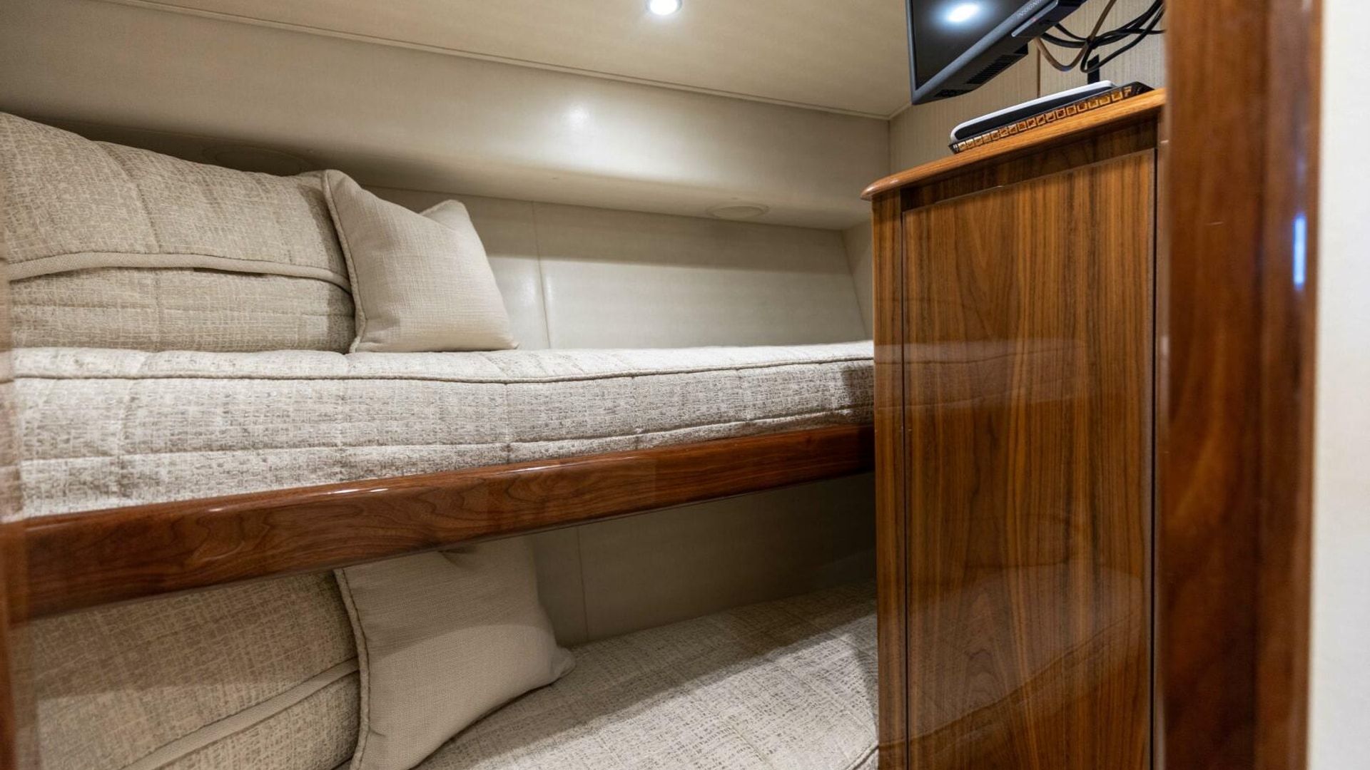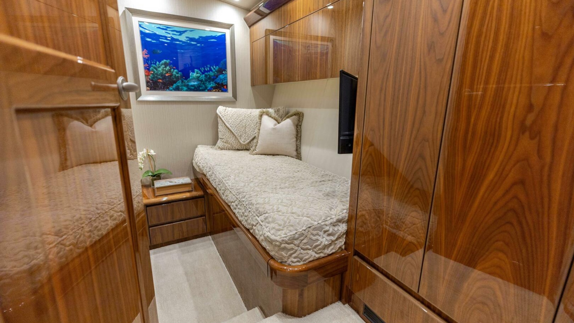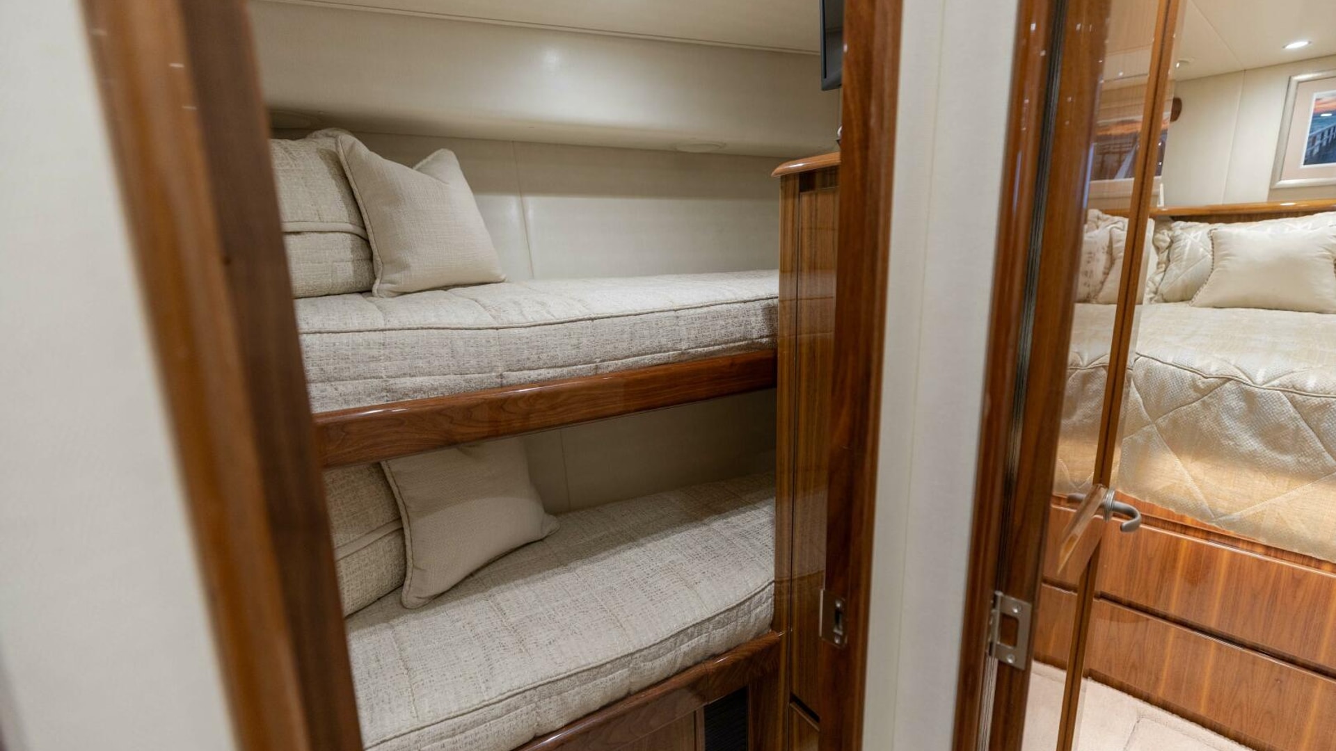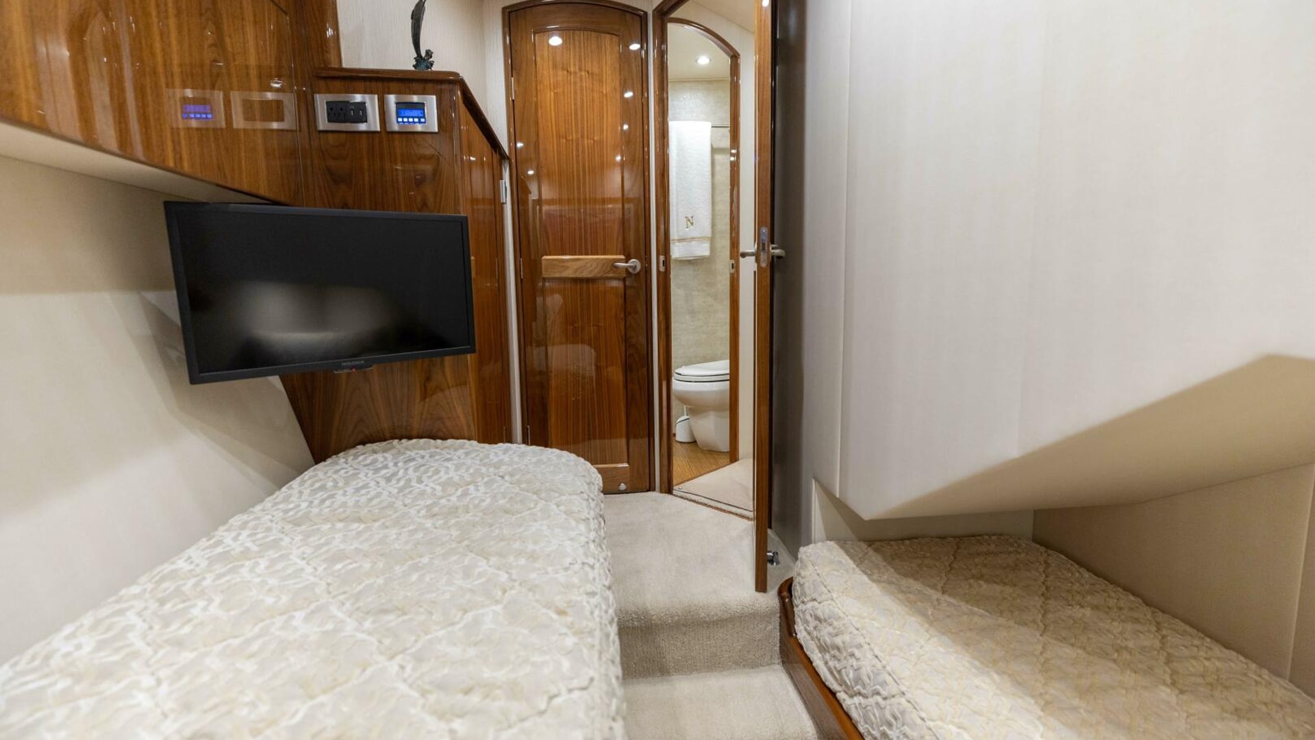 Four-stateroom layout, the two port staterooms share the port head. While all of the staterooms offer generous accommodations, including System #1 innerspring mattresses, excellent stowage and privacy, each has its own special take and is uniquely designed to maximize comfort and function. The forward stateroom offers a queen size walk around berth. The port stateroom has side-by-side berths and the fourth stateroom features upper and lower berths. The master stateroom is amidships with an athwart ships queen-size walk around bed, an upholstered headboard, flanking night tables, a credenza, a 32-inch flat screen television, and a pair of floor to ceiling maple-lined hanging lockers.