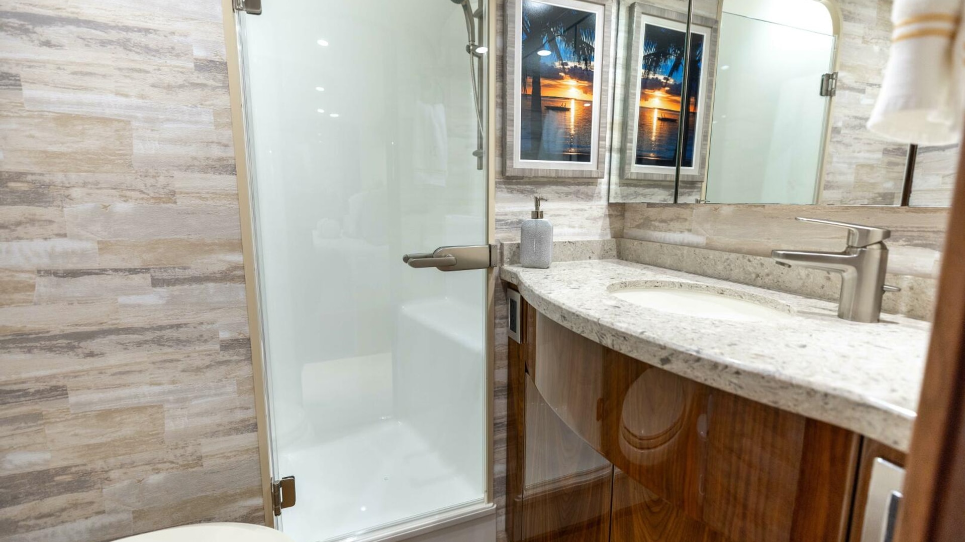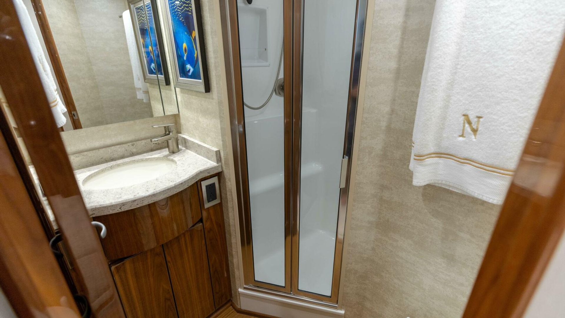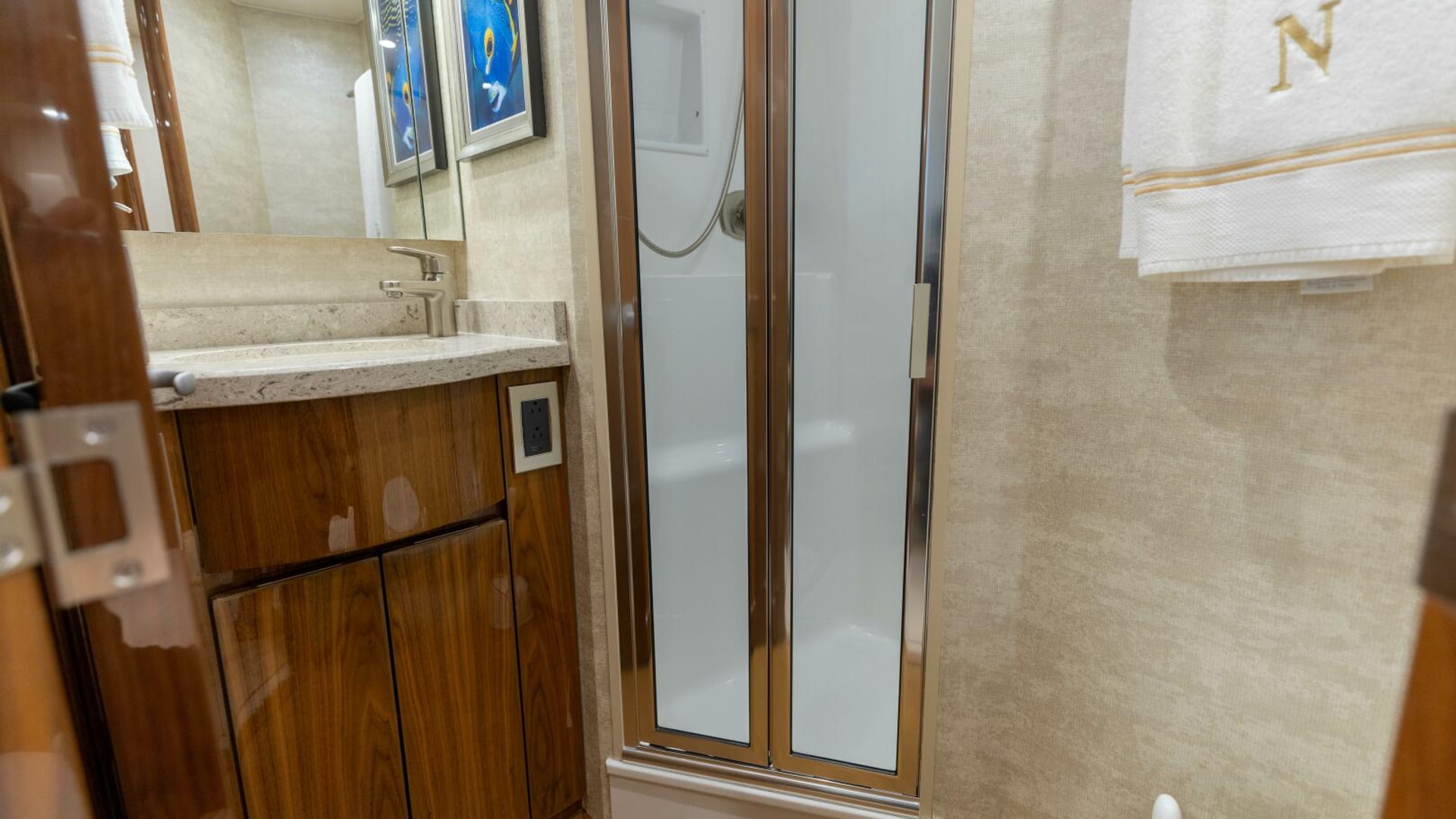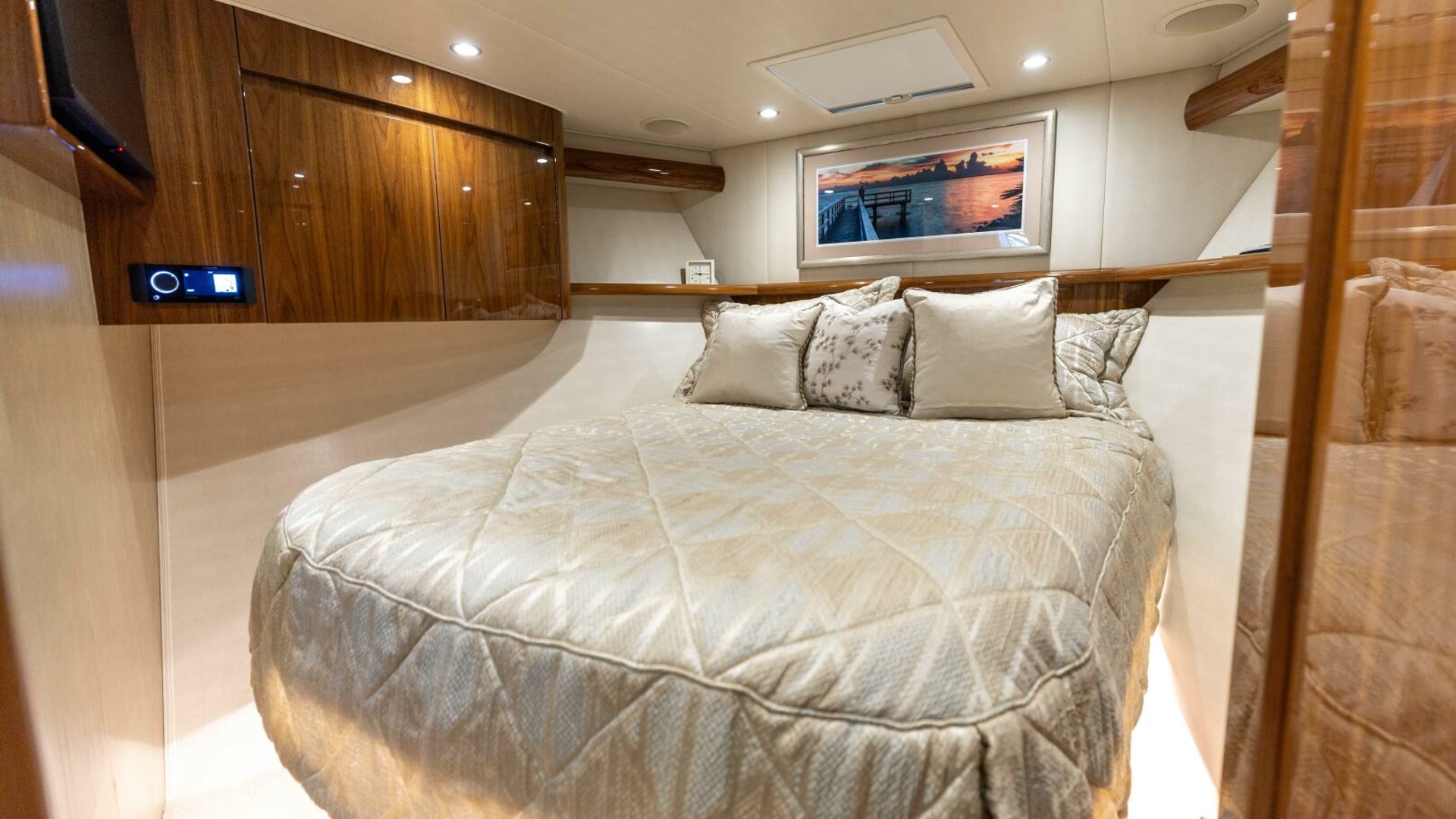 Four-stateroom layout, the two port staterooms share the port head. While all of the staterooms offer generous accommodations, including System #1 innerspring mattresses, excellent stowage and privacy, each has its own special take and is uniquely designed to maximize comfort and function. The forward stateroom offers a queen size walk around berth. The port stateroom has side-by-side berths and the fourth stateroom features upper and lower berths. The master stateroom is amidships with an athwart ships queen-size walk around bed, an upholstered headboard, flanking night tables, a credenza, a 32-inch flat screen television, and a pair of floor to ceiling maple-lined hanging lockers.