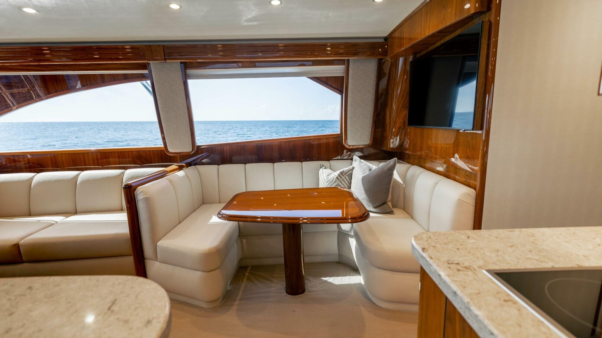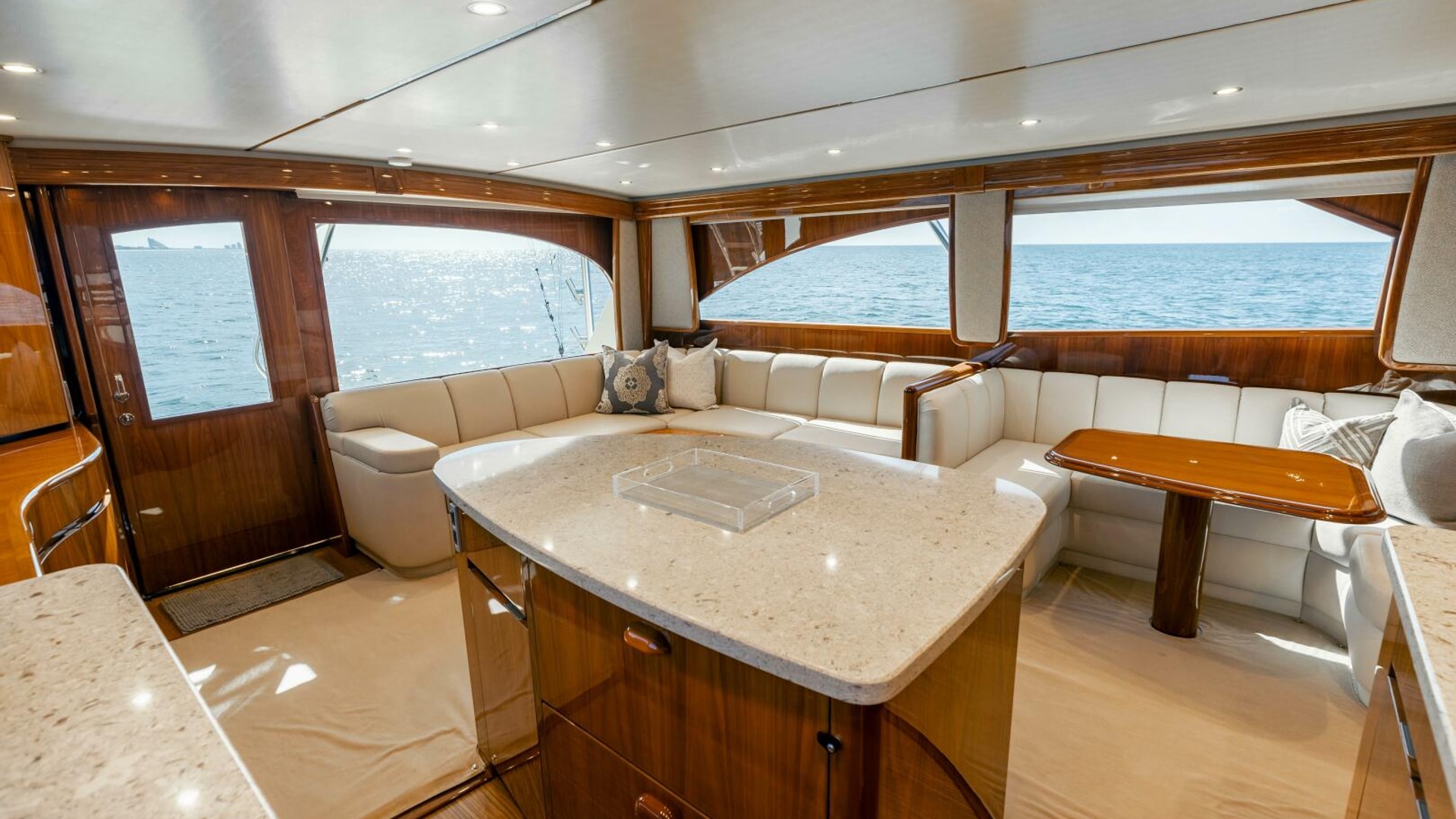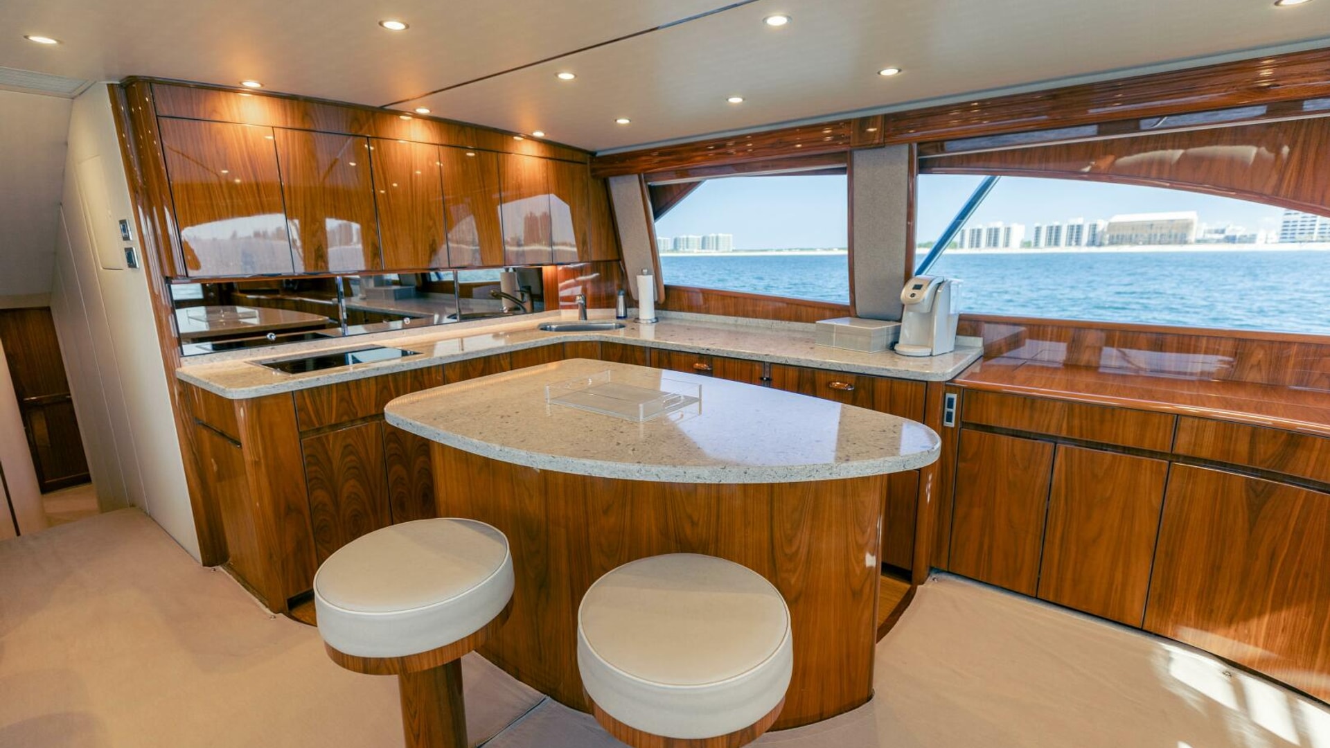 Walking into the salon is a delight to the senses and your first impression will be that you are aboard a much larger yacht. With nearly 19 feet of beam, the expanse resembles a stately great room, lush with individually chosen planks of random, natural teak each one featuring a tight, fine grain that defines the area with sense of richness and custom appointments. A home theater system includes a 46-inch flat screen television, which rises from the teak cabinetry and an audiophile Bose system. The serving island, a Viking innovation, is topped with custom granite, as are all of the counters in the L-shaped galley. The island is ideal for prepping meals at the dock or under way, and allows more freedom of movement throughout the area with two egress points. Drawer-style under counter refrigeration and world class appliances will bring smiles to even the most demanding chefs.
