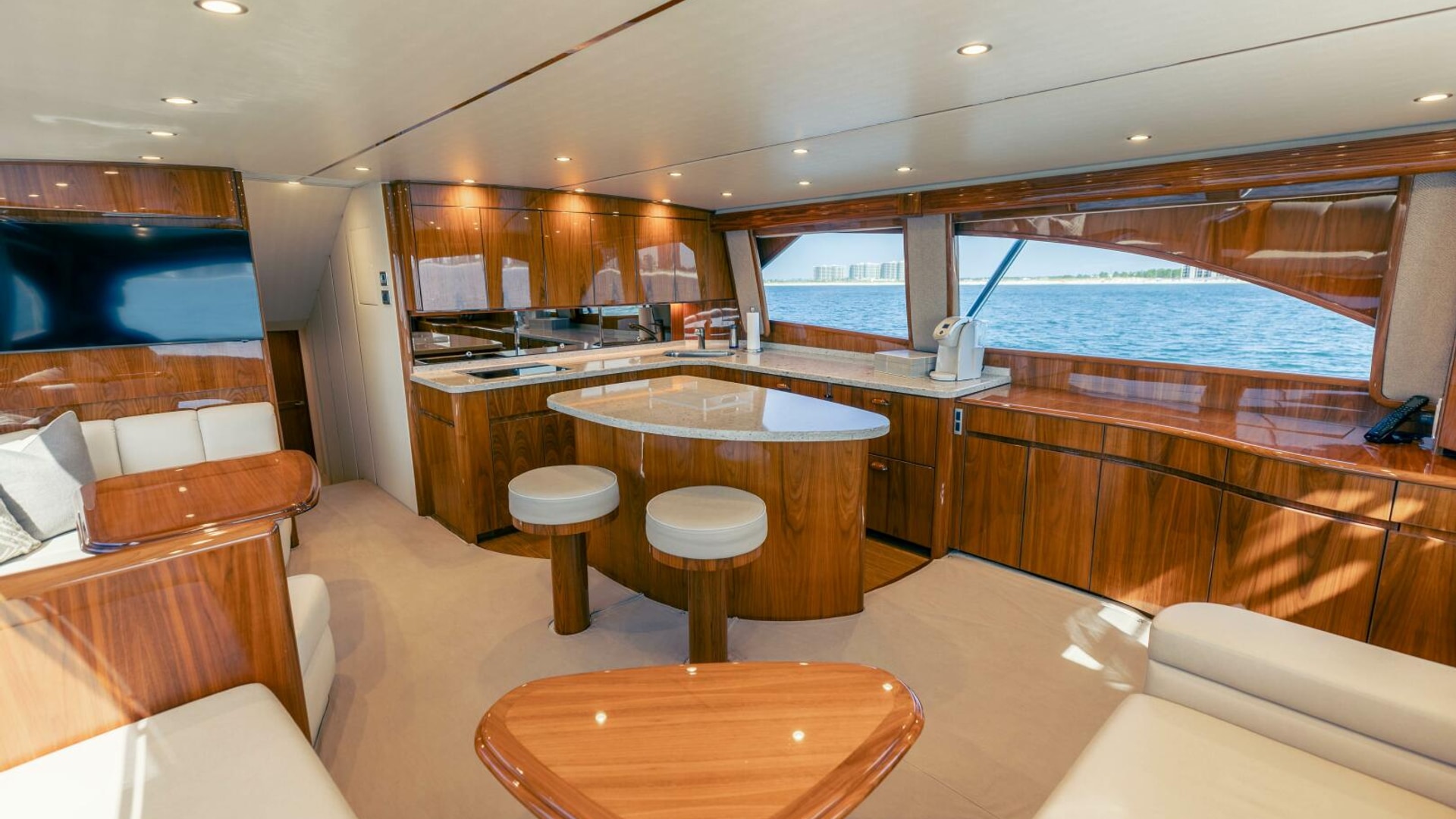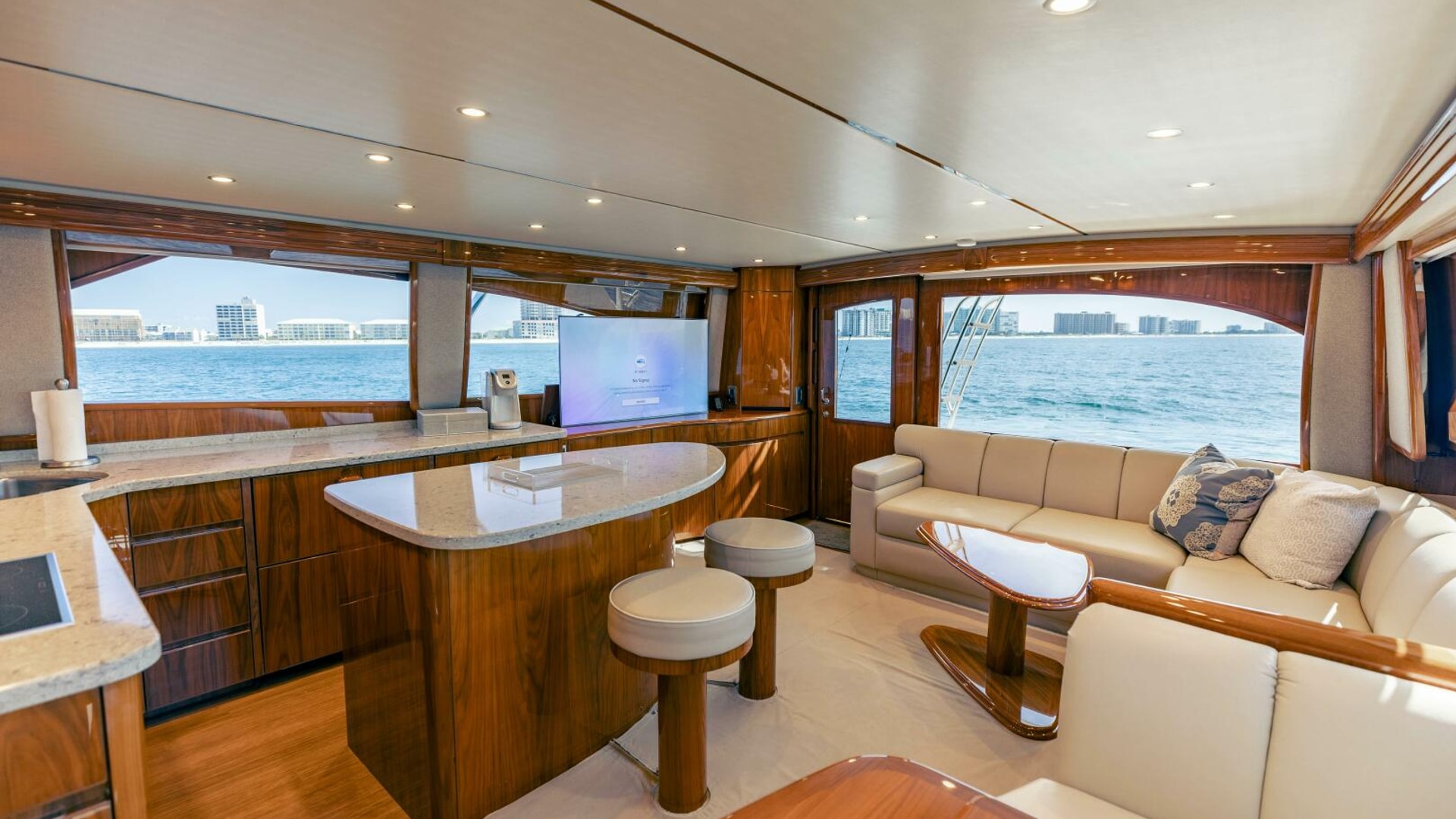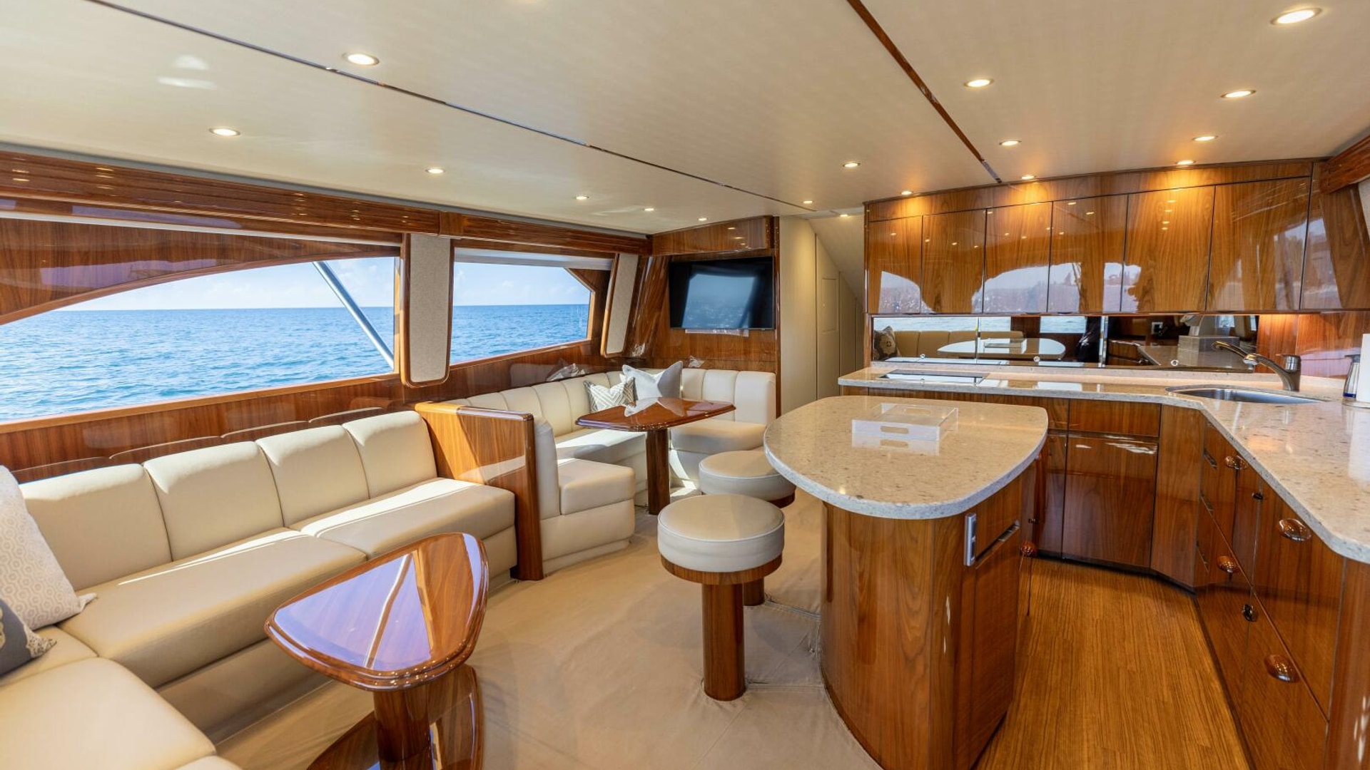 Walking into the salon is a delight to the senses and your first impression will be that you are aboard a much larger yacht. With nearly 19 feet of beam, the expanse resembles a stately great room, lush with individually chosen planks of random, natural teak each one featuring a tight, fine grain that defines the area with sense of richness and custom appointments. A home theater system includes a 46-inch flat screen television, which rises from the teak cabinetry and an audiophile Bose system. The serving island, a Viking innovation, is topped with custom granite, as are all of the counters in the L-shaped galley. The island is ideal for prepping meals at the dock or under way, and allows more freedom of movement throughout the area with two egress points. Drawer-style under counter refrigeration and world class appliances will bring smiles to even the most demanding chefs.