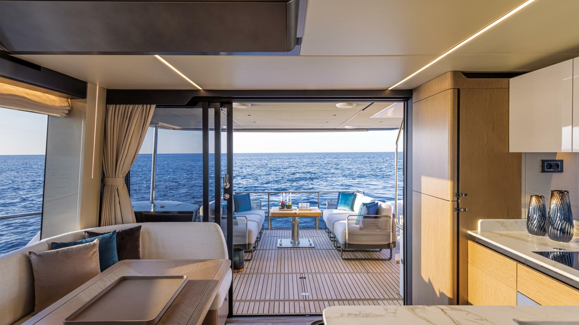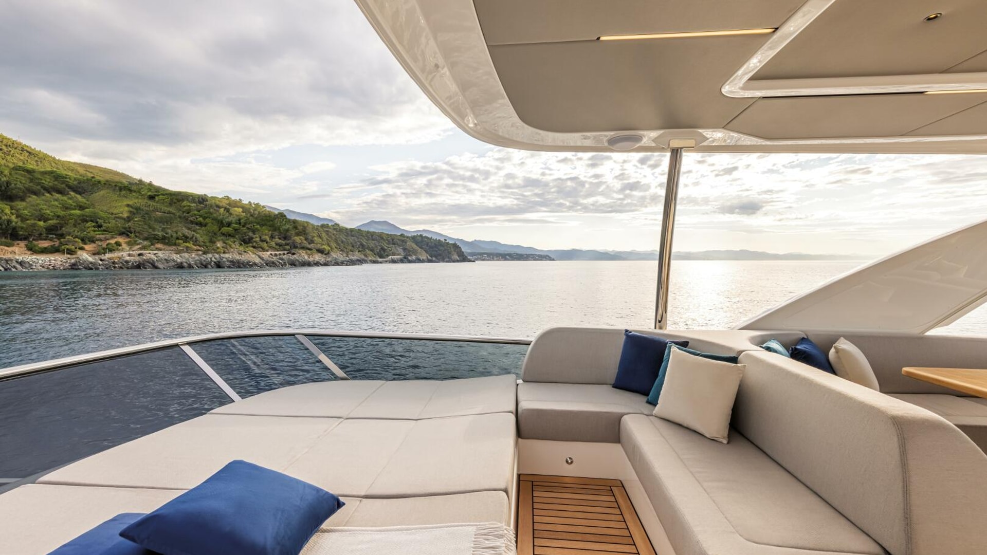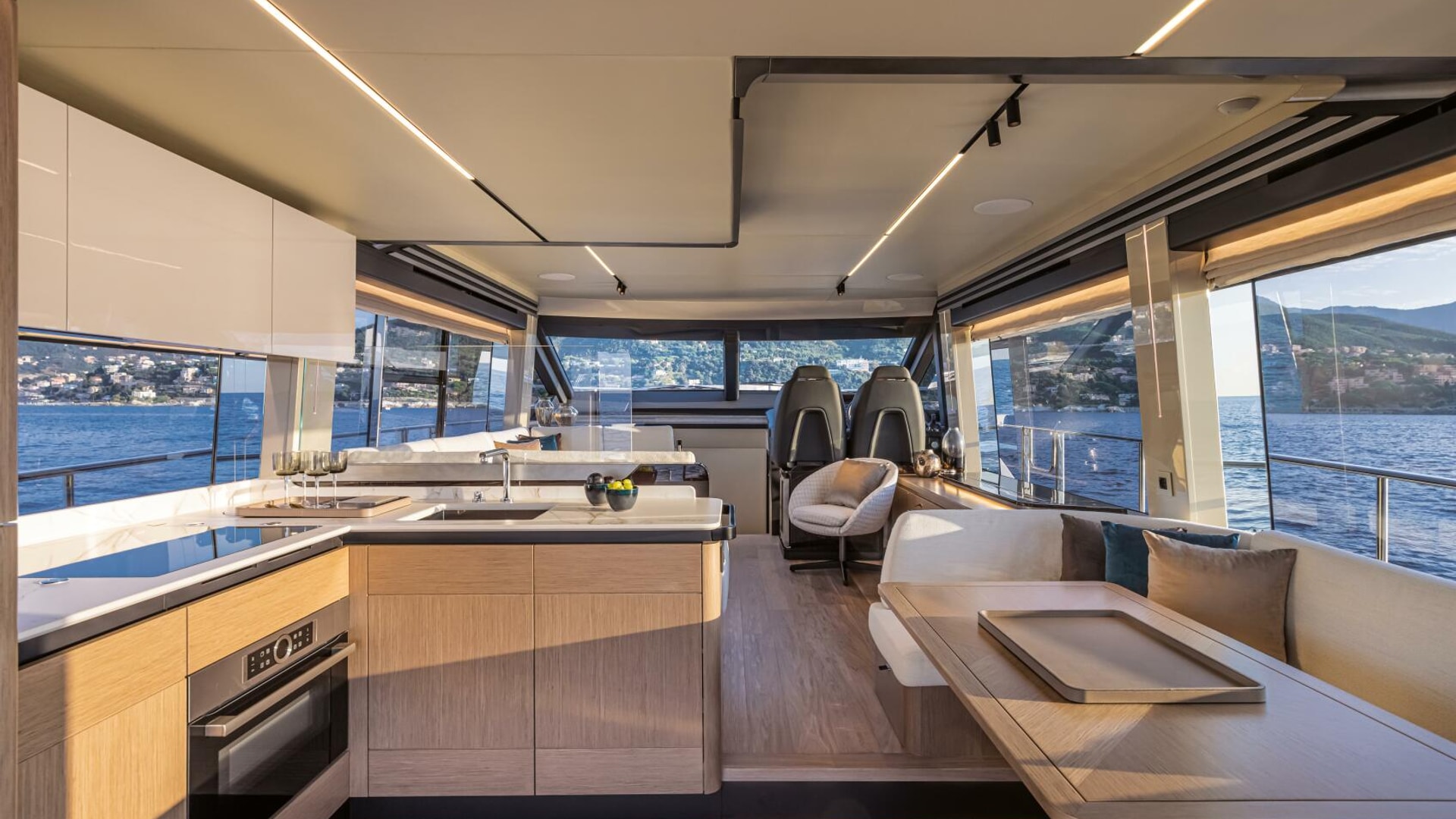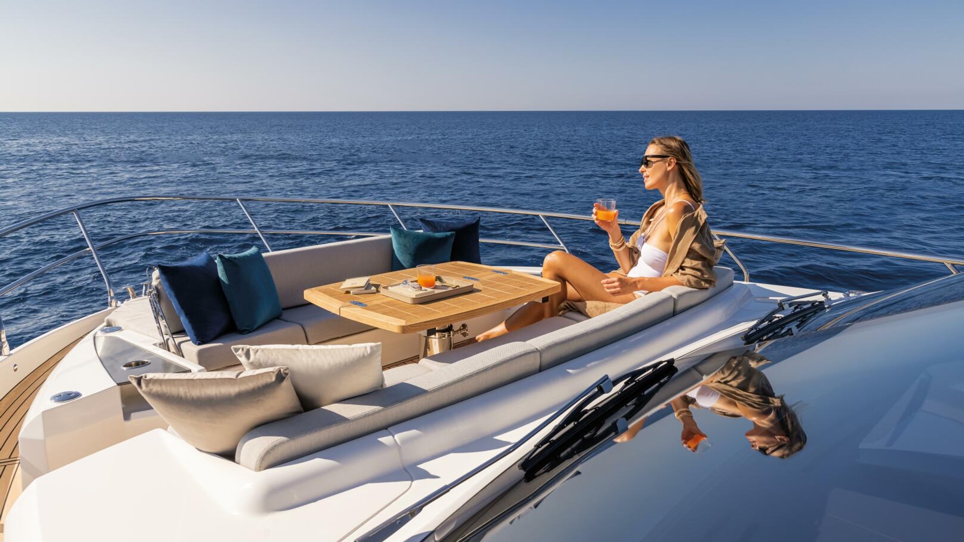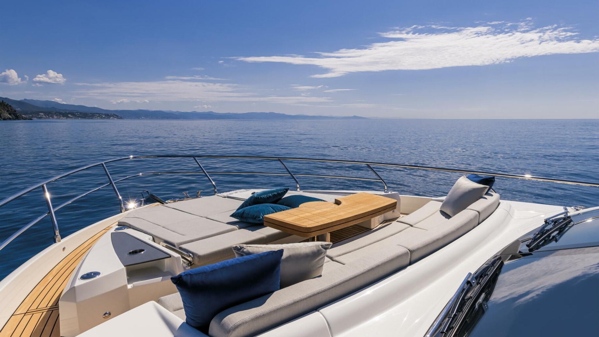 The flybridge acts as a second outdoor living room, perfect for sunbathing, cocktails, and socializing, and includes a galley, dining areas, and an advanced helm station. The versatile bow area offers a sunbathing zone and a comfortable sofa with a table for day and night enjoyment.