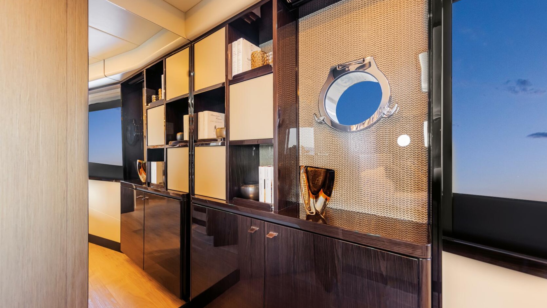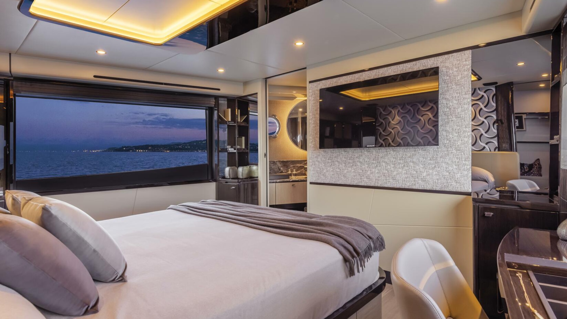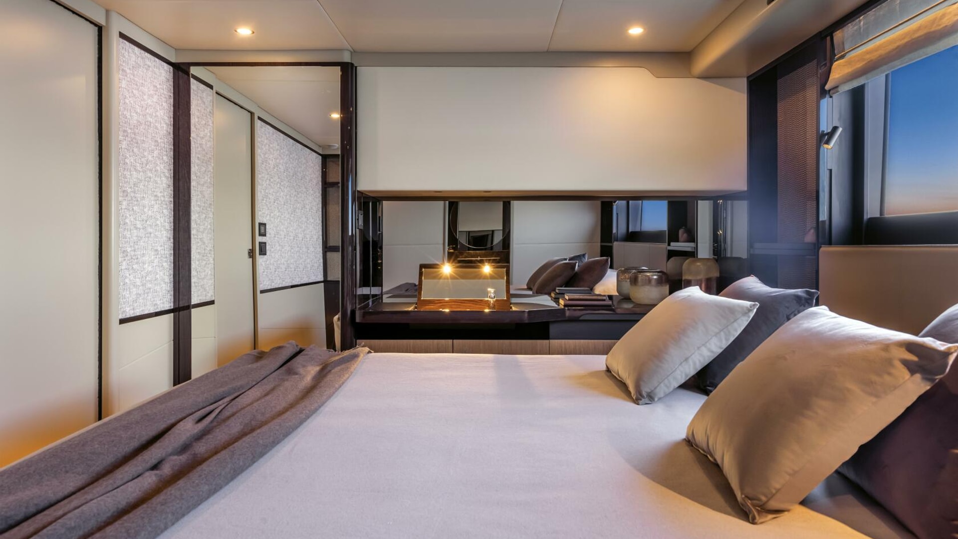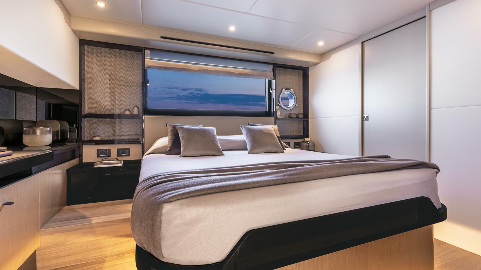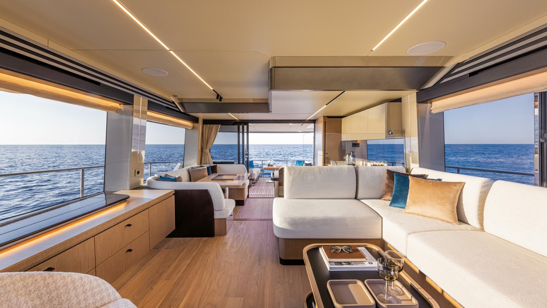 The flybridge acts as a second outdoor living room, perfect for sunbathing, cocktails, and socializing, and includes a galley, dining areas, and an advanced helm station. The versatile bow area offers a sunbathing zone and a comfortable sofa with a table for day and night enjoyment.