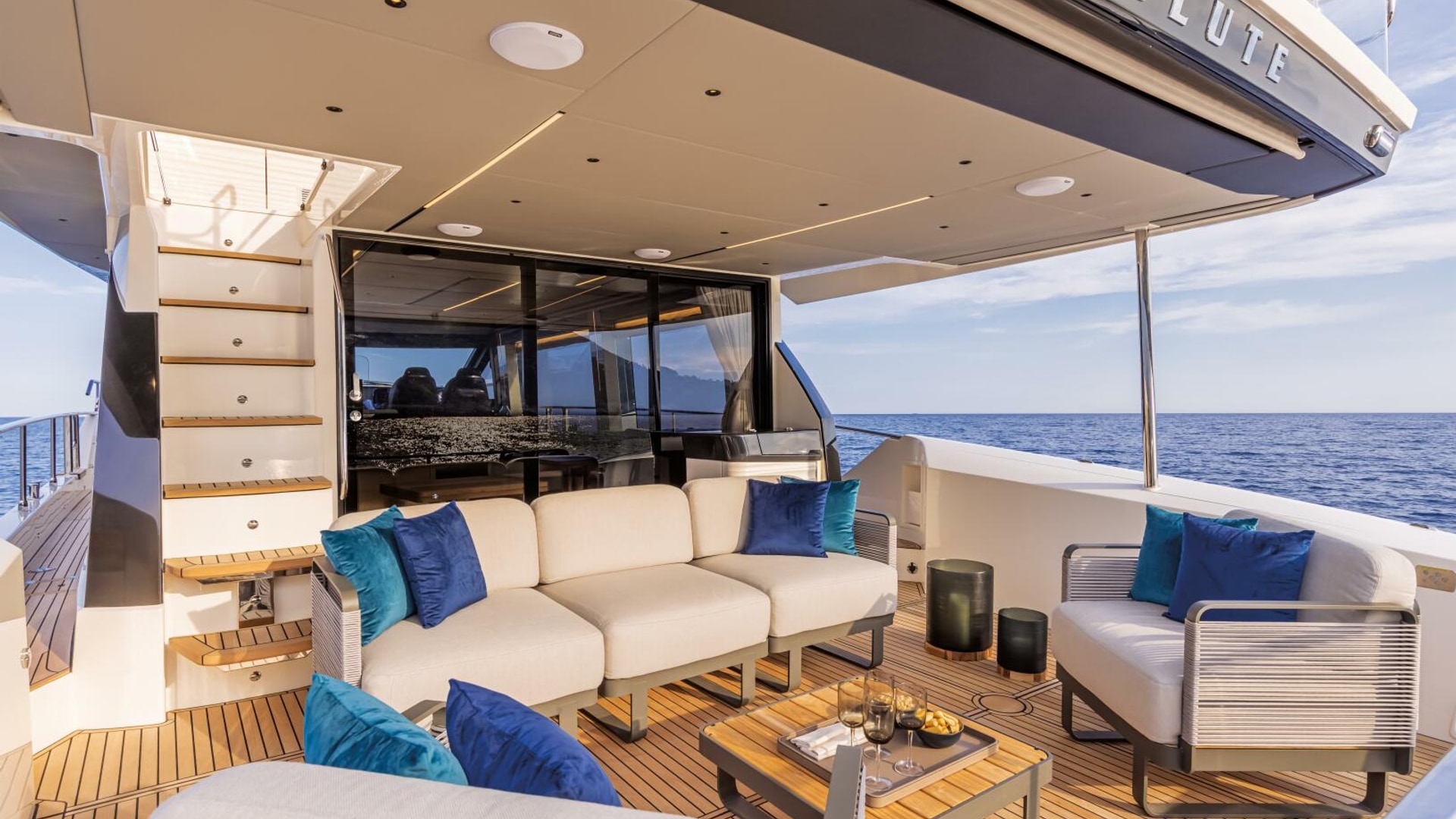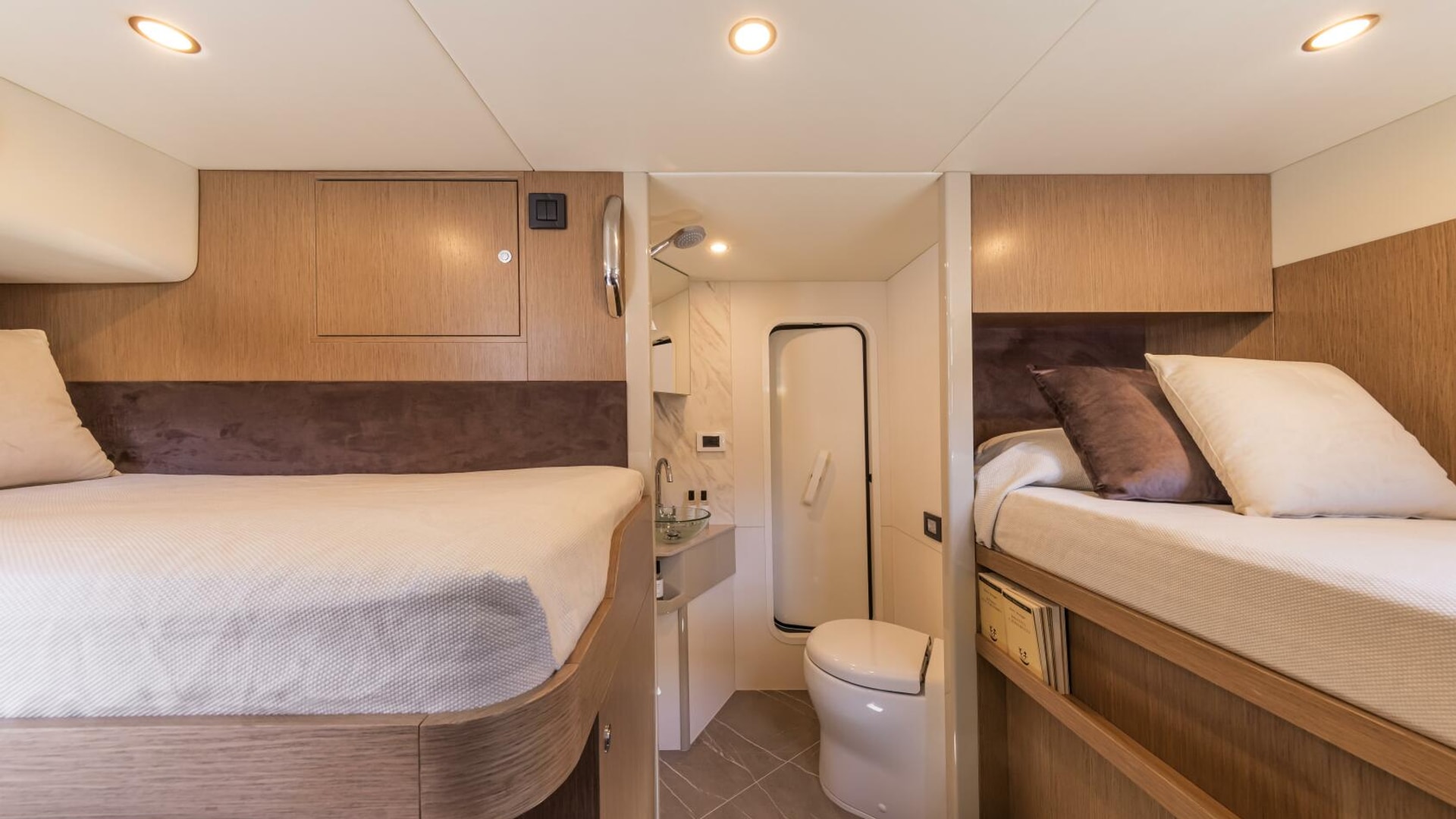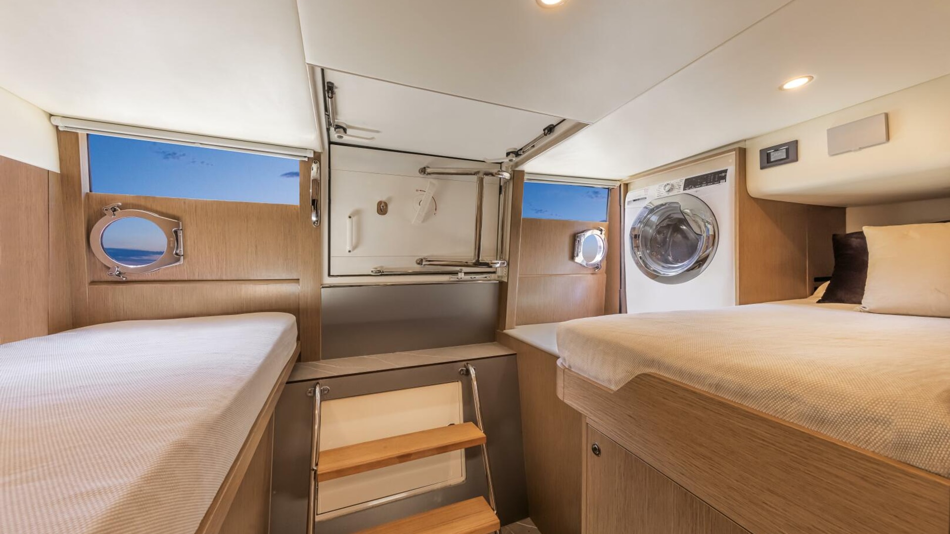 - Fourth aft cabin with bathroom (WC, basin, and shower), accessible from the aft platform, instead of the aft storage compartment