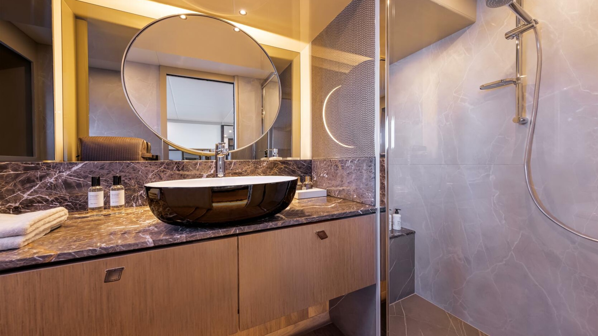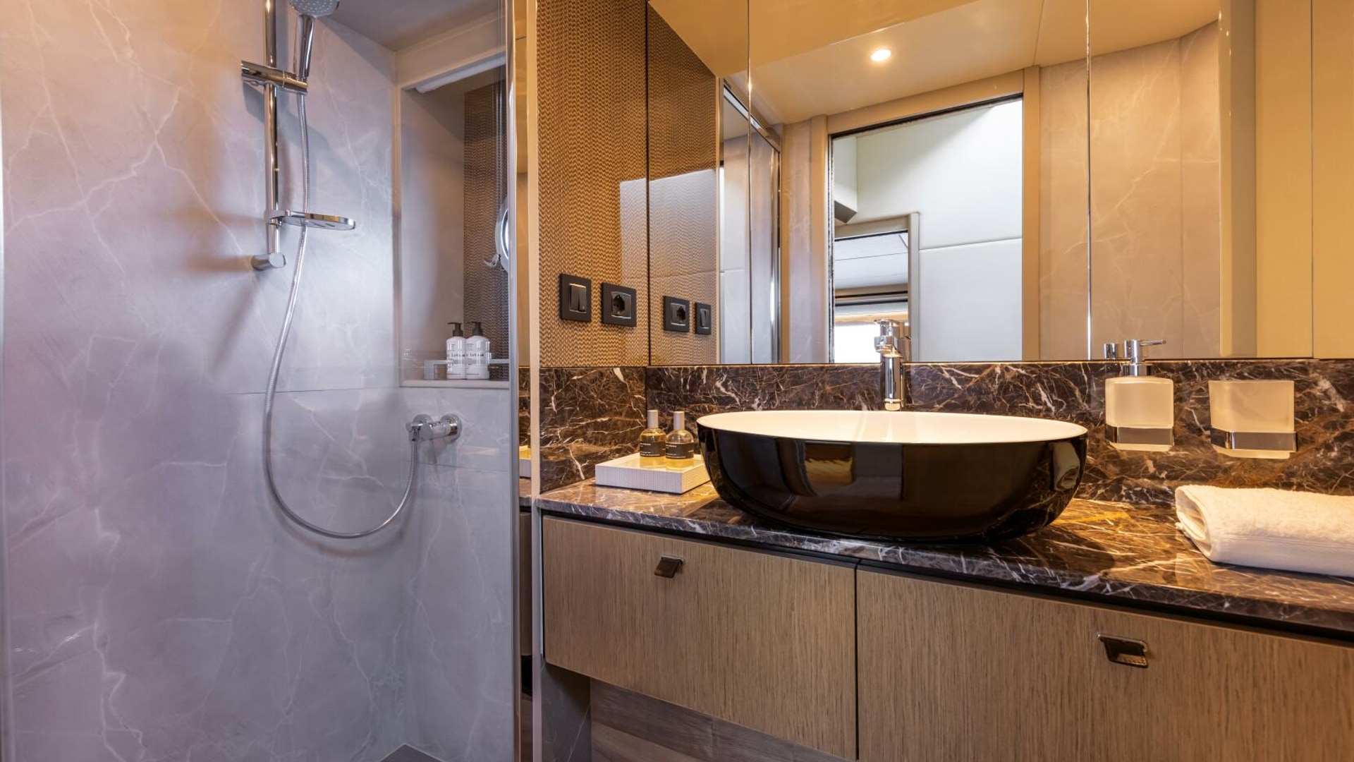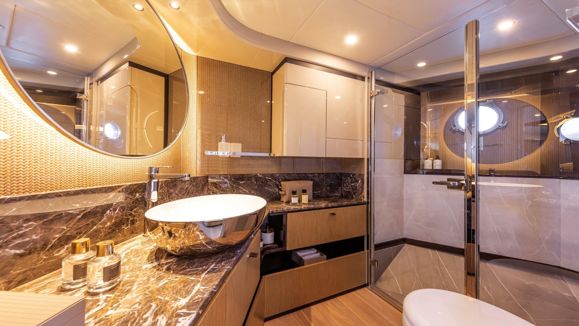 - Fourth aft cabin with bathroom (WC, basin, and shower), accessible from the aft platform, instead of the aft storage compartment