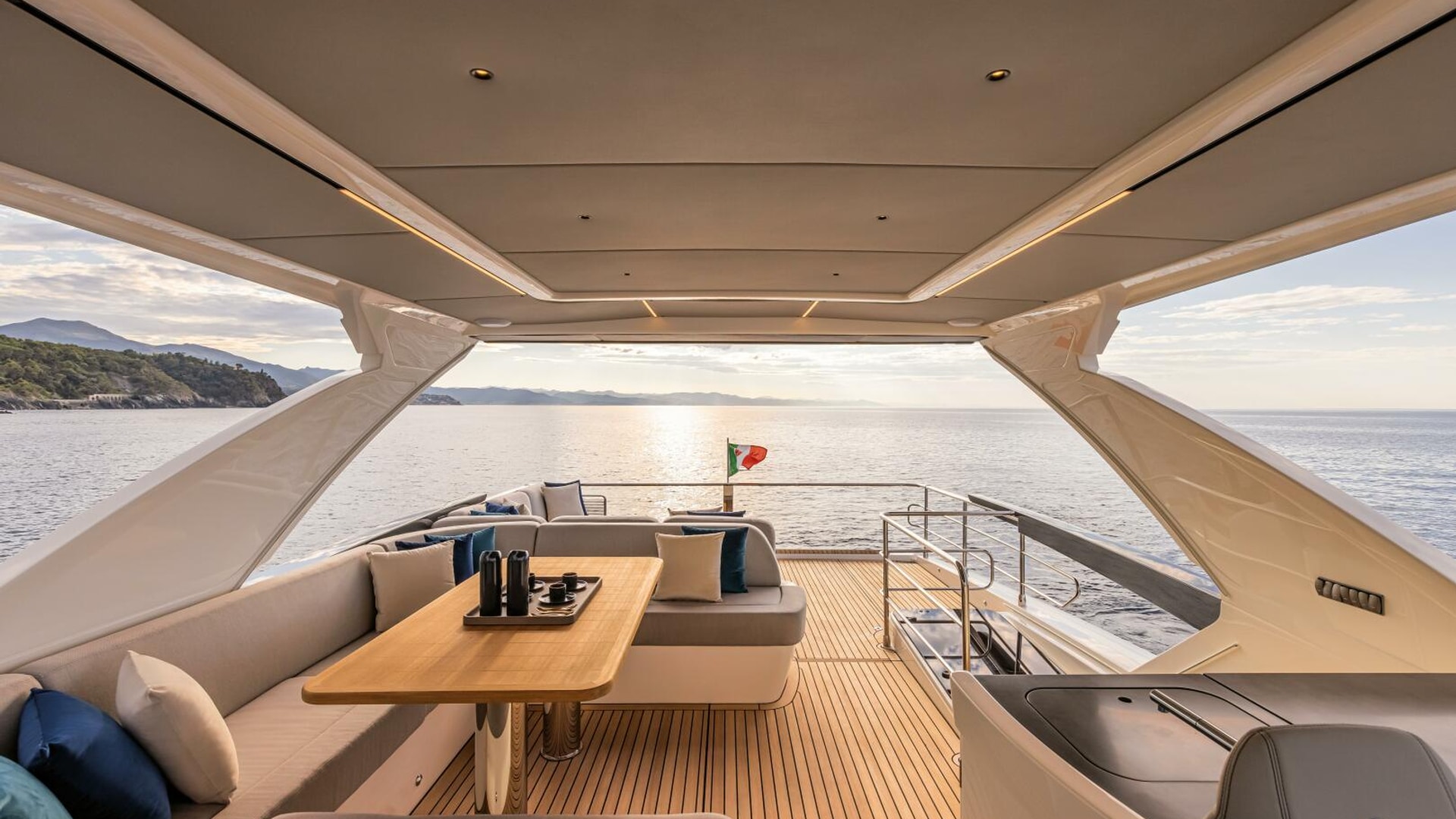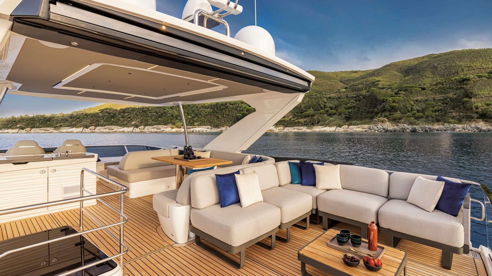 State-of-the-art technology includes modern dashboards and helm stations on both the main deck and flybridge, with an optional third mooring station. Solar panels in the hard top provide environmental benefits and greater autonomy.