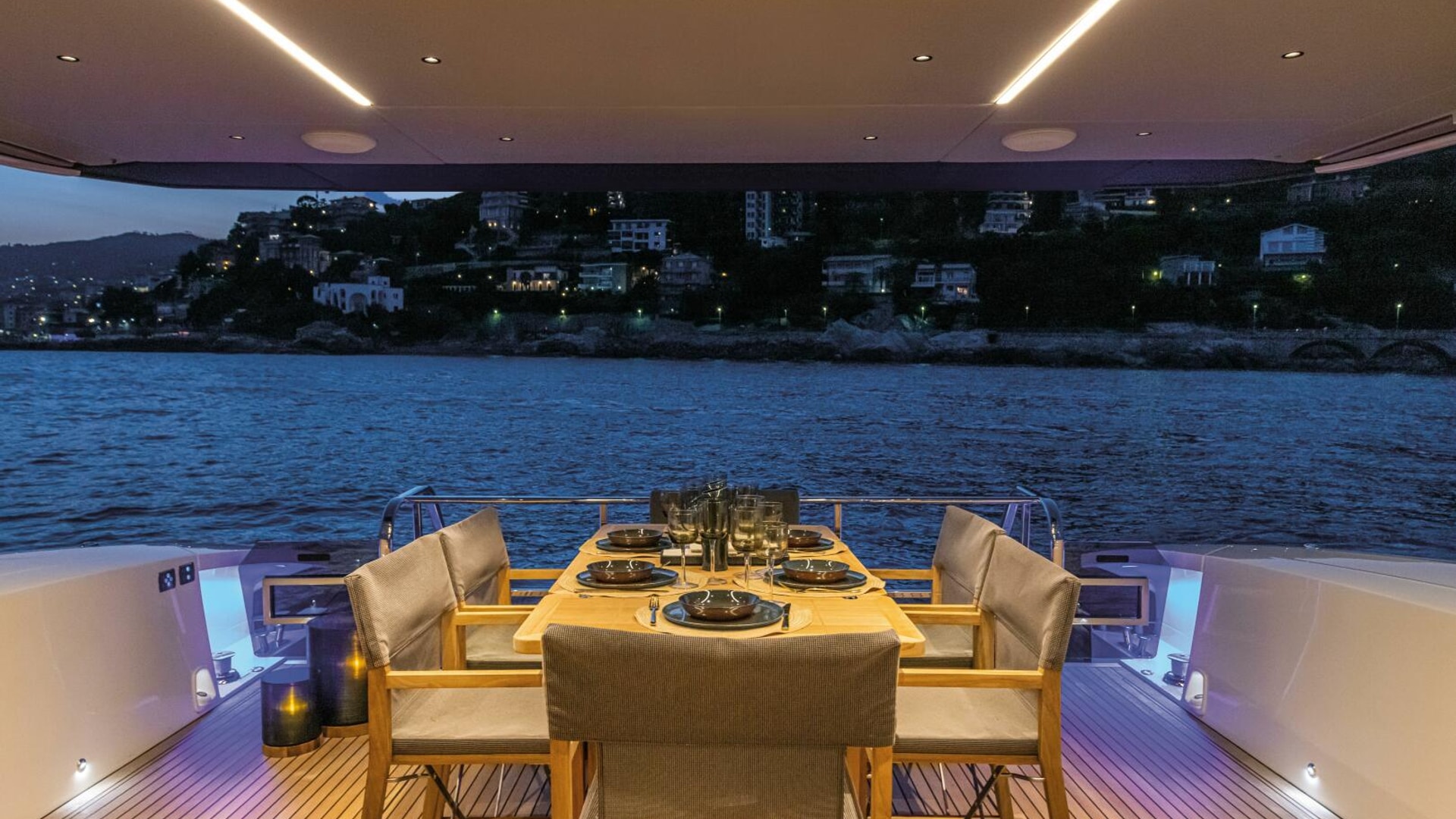 - LED lighting kit (courtesy lights all along the floor, on the deck and flybridge, mooring lights (2), retractable bow decorative lights (2)