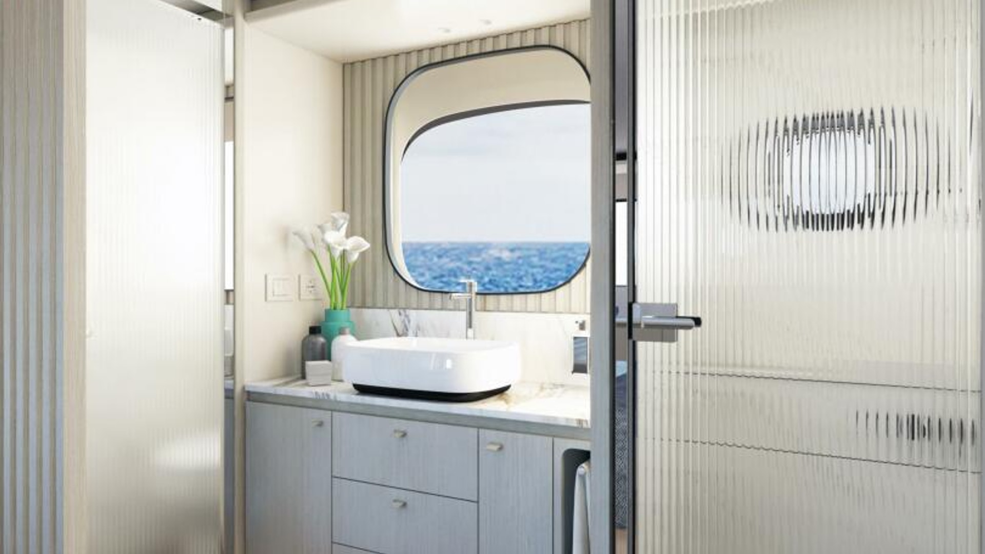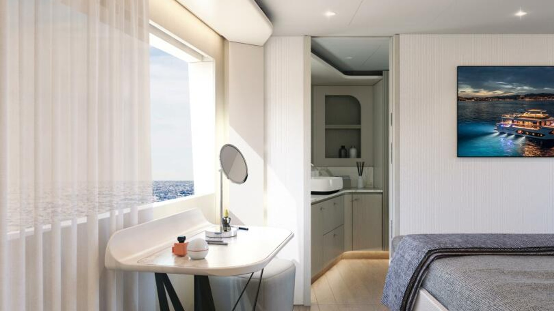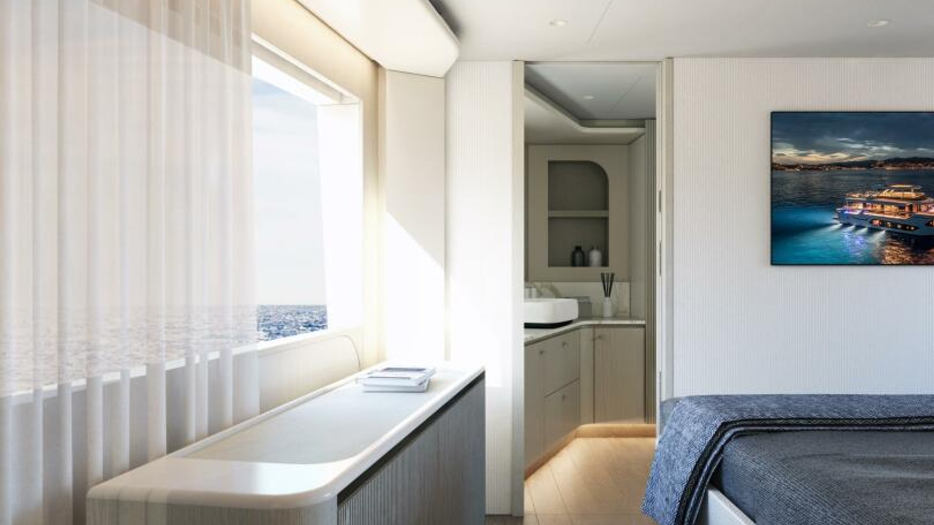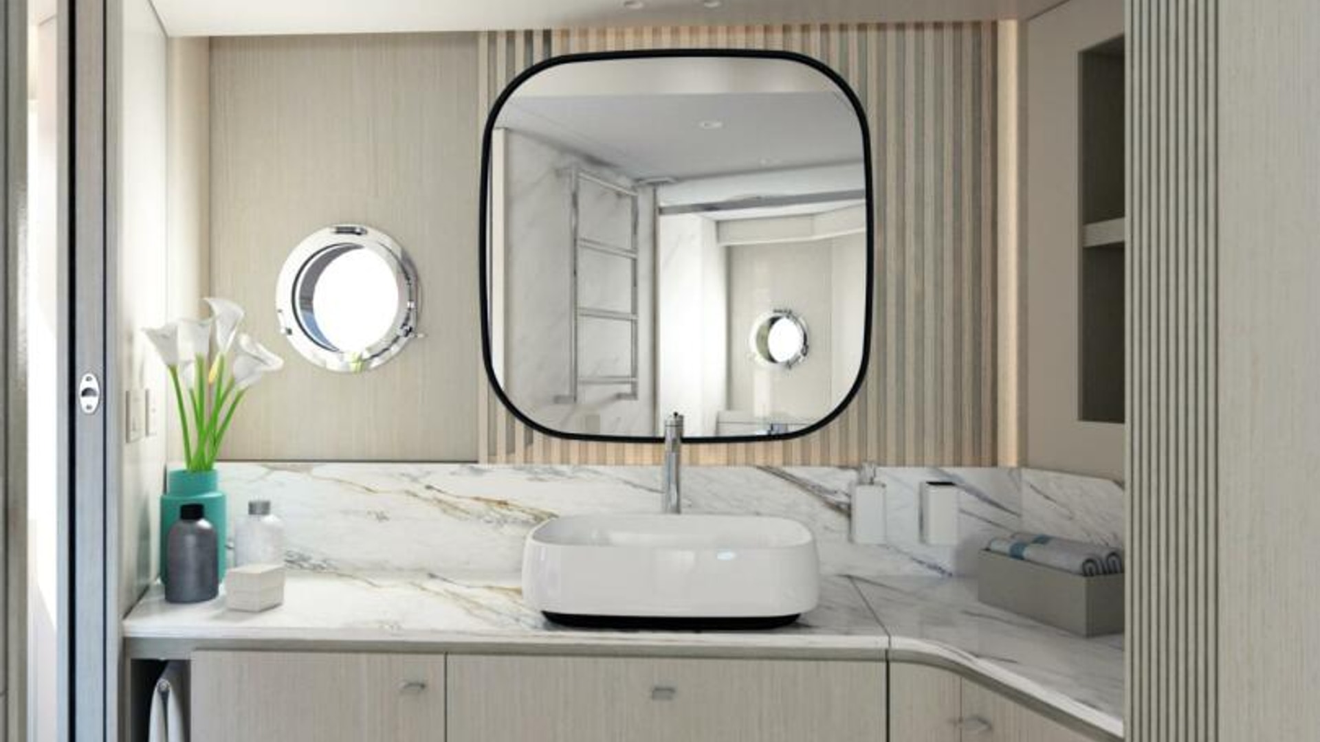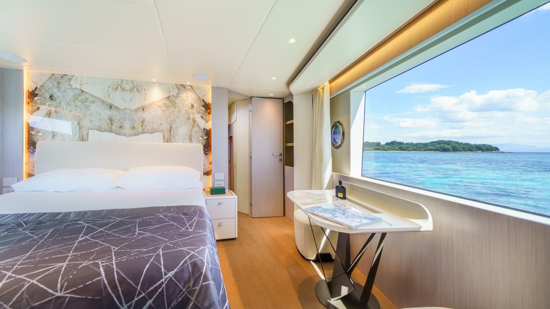- Luxury Pack: salon dining table with ceramic surface, wall behind the headboard in bow master cabin in marble-effect ceramic and wall behind the headboard in VIP cabin with geometric pattern fabric