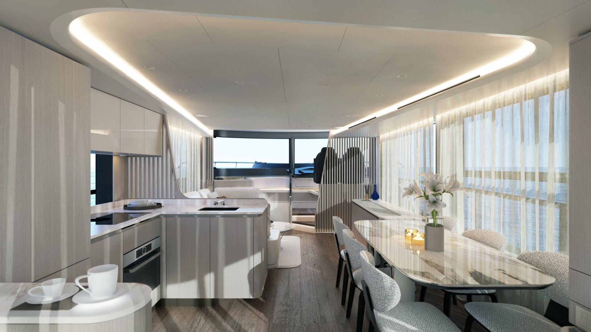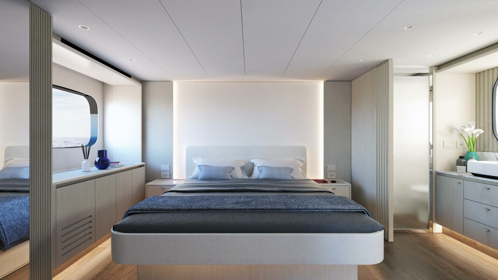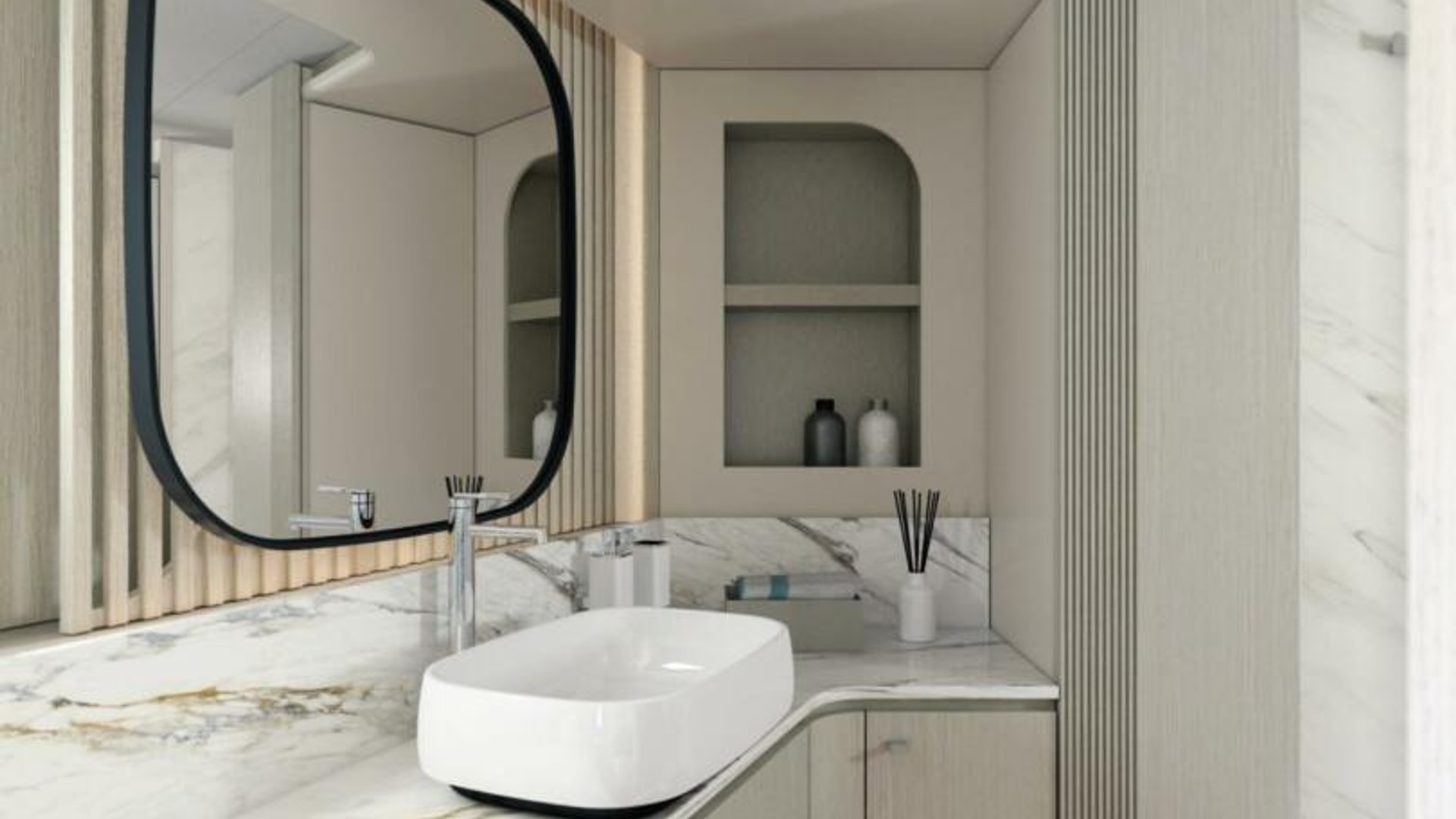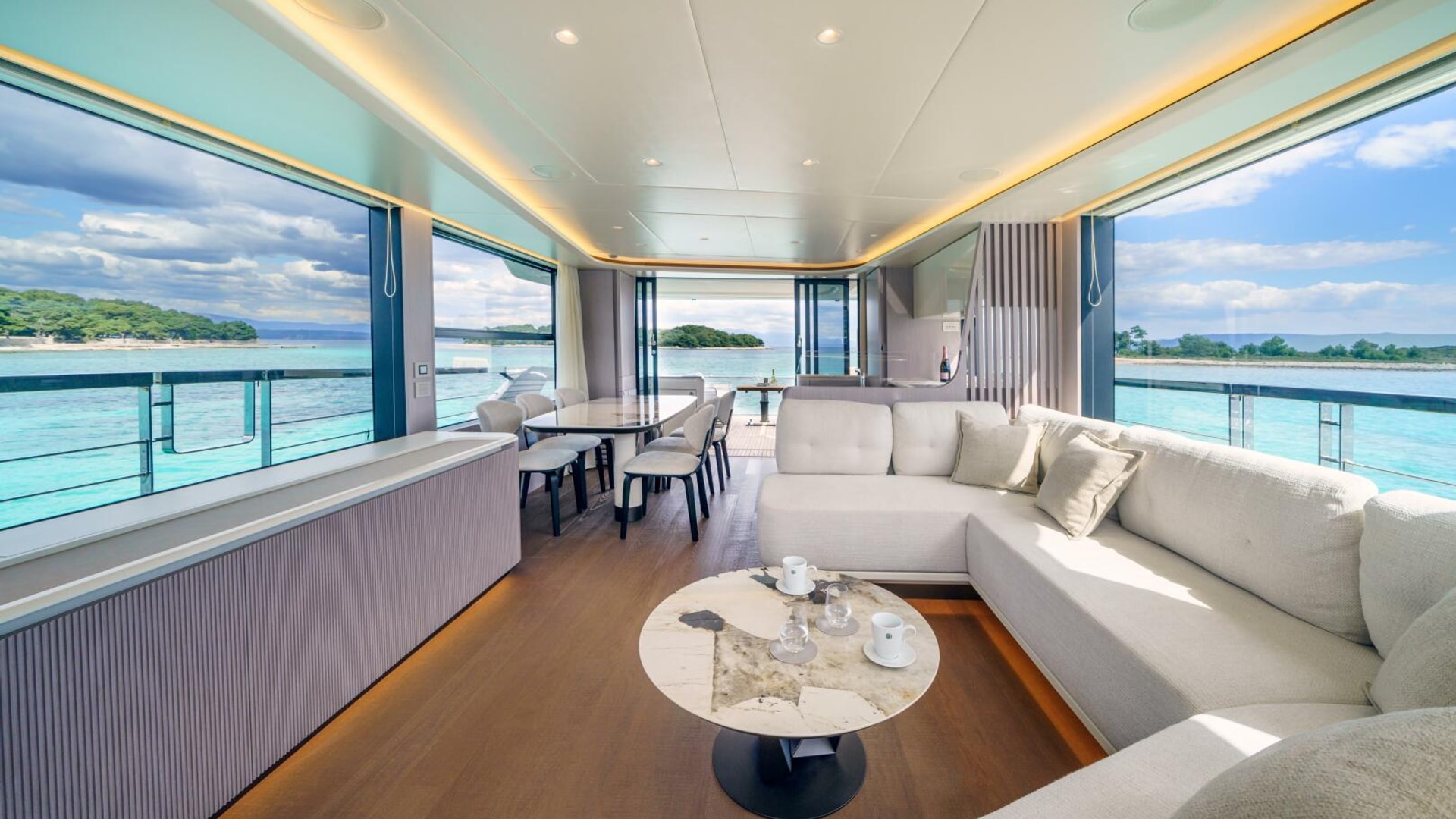 - Luxury Pack: salon dining table with ceramic surface, wall behind the headboard in bow master cabin in marble-effect ceramic and wall behind the headboard in VIP cabin with geometric pattern fabric