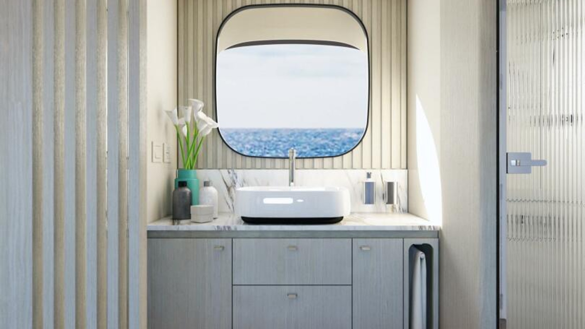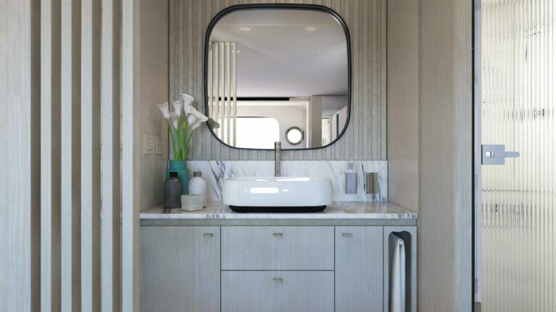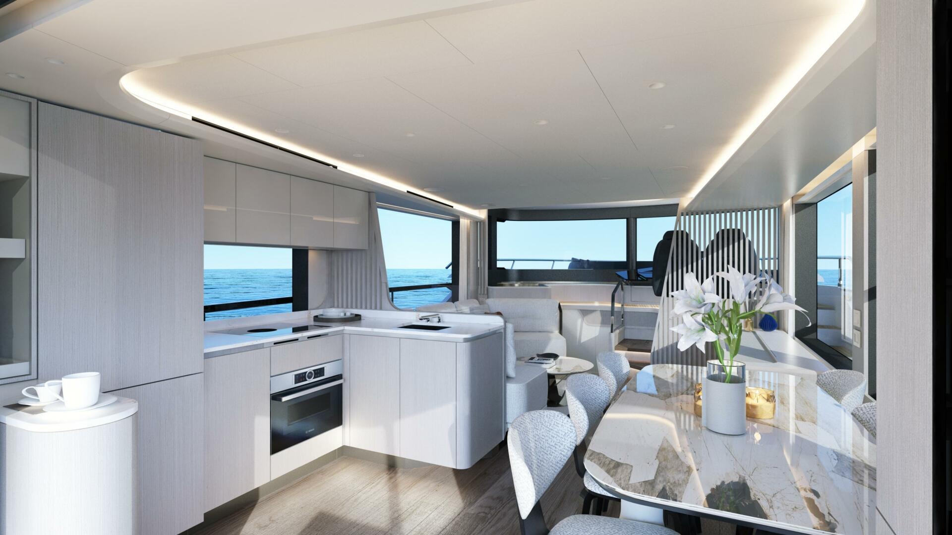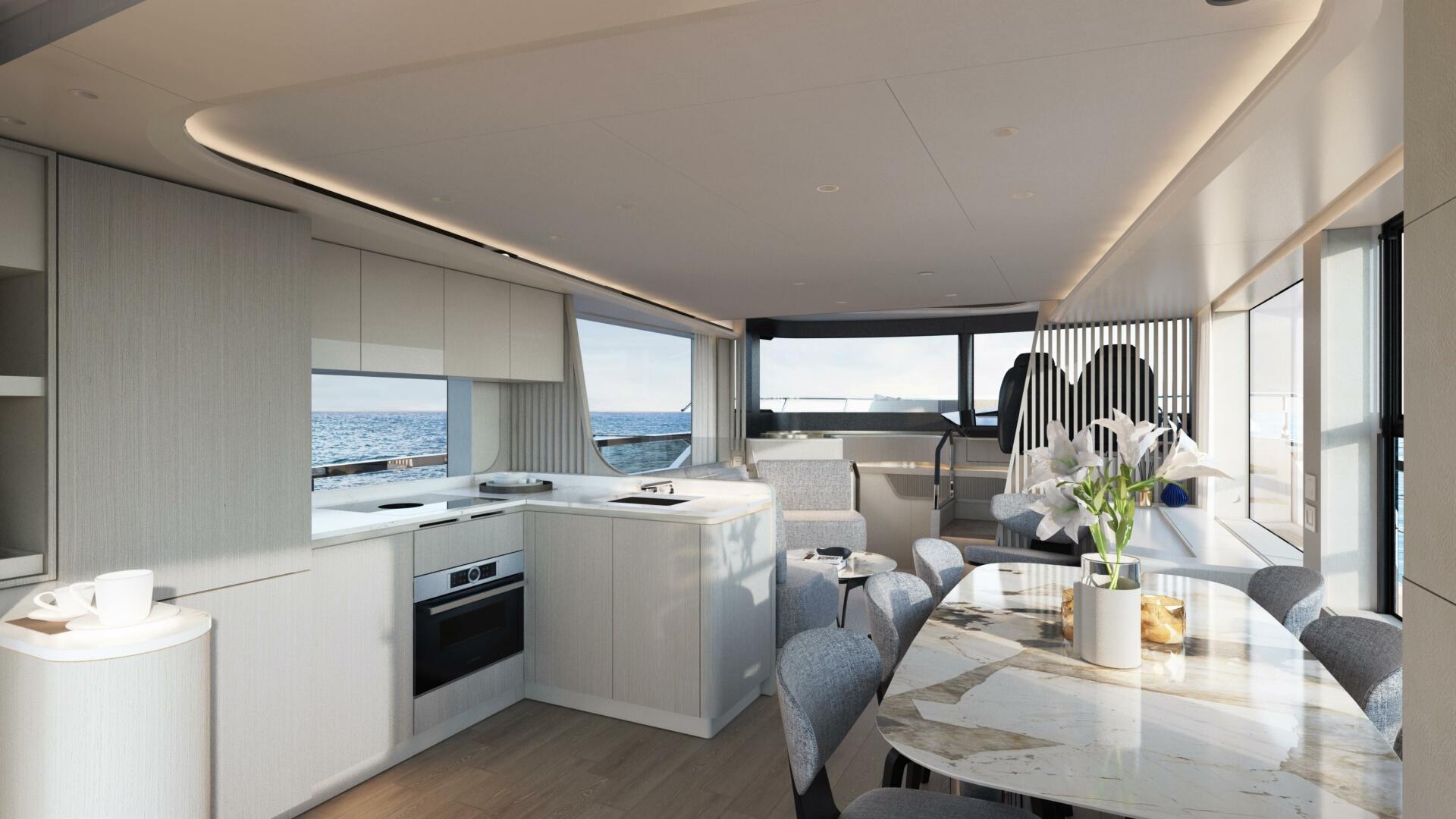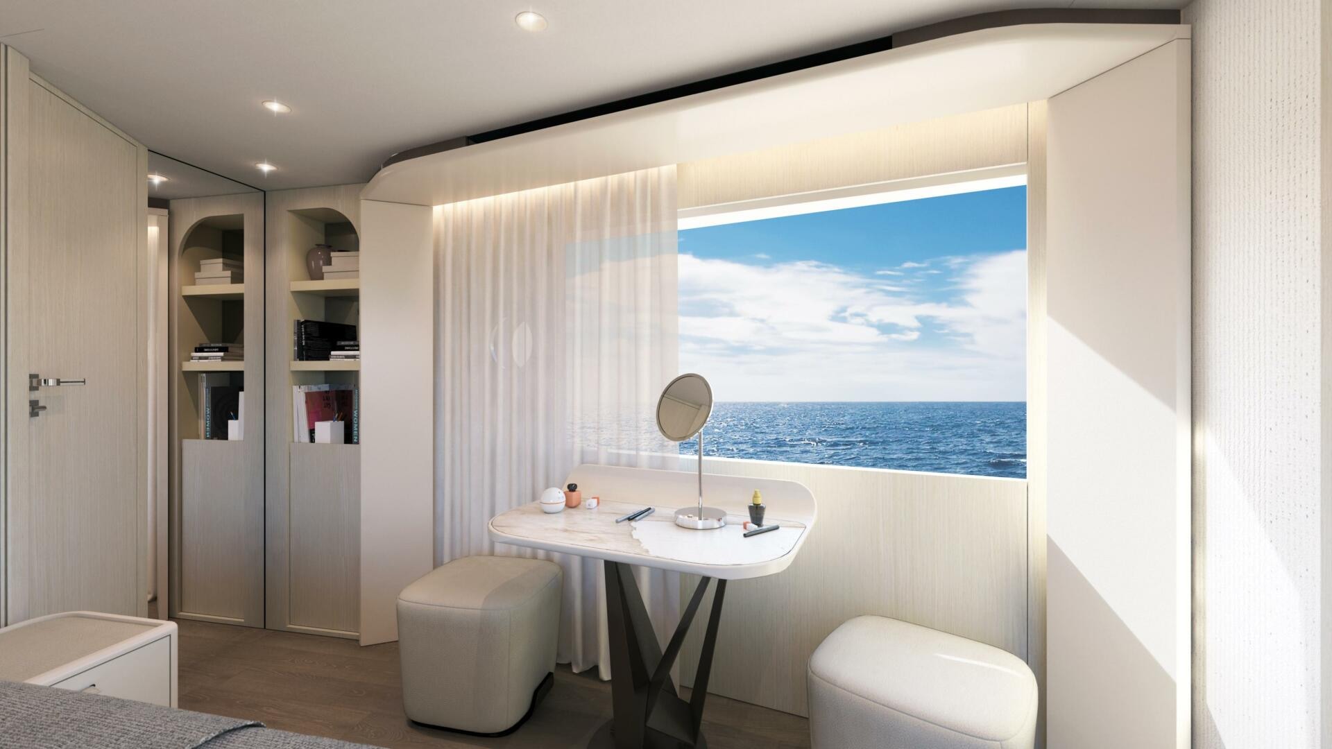 - Luxury Pack: salon dining table with ceramic surface, wall behind the headboard in bow master cabin in marble-effect ceramic and wall behind the headboard in VIP cabin with geometric pattern fabric