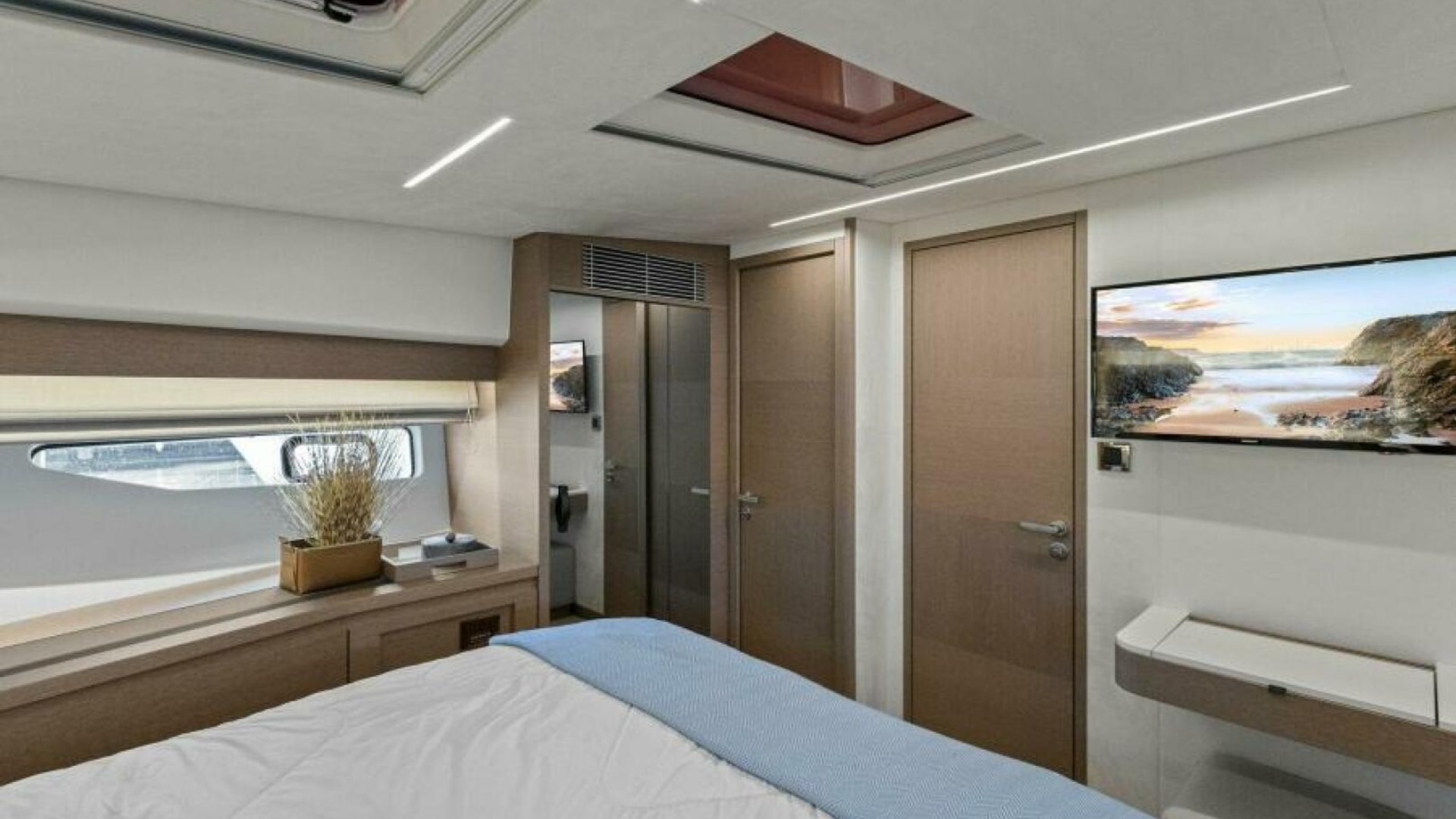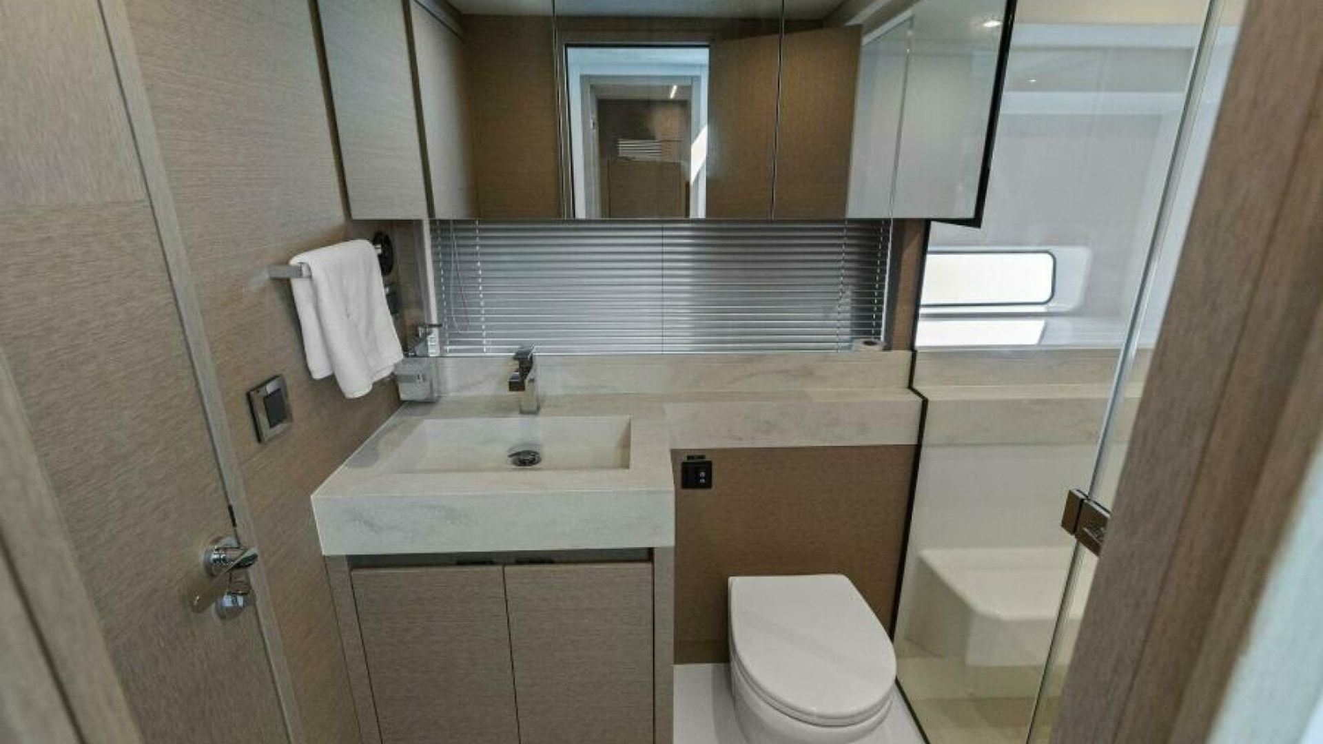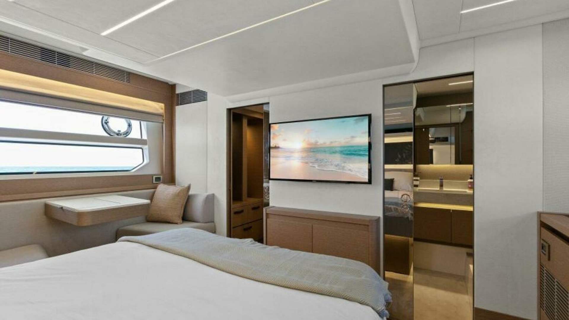 Completely Separate and private from the forward Guest Accommodations is the Full-Beam Master Stateroom. Exiting the Port Guest stateroom heading aft up the companionway stairs through the Salon towards the Galley is the private access stairwell to starboard leading down into the Master. This stairwell is positioned directly across from the Galley. This allows the Owner to have the utmost privacy when travelling aboard with family or guests making the Prestige 590 a highly sought after model in the Prestige Yachts lineup. Moving down the stairwell into the Master suite you will immediately notice how voluminous the room is. Full-beam across, it showcases a Large Island style berth w/ custom built-in end tables, and independent reading lamps. The Booth Style seating console to port is an excellent workspace, but doubles into a flip up vanity top with mirror and built-in storage. Large hull-side windows to port and starboard fill the space with natural light. The windows also have custom blackout shades for increased privacy. Plush Elegance carpeting throughout. Forward in the space is the dual entry into the head and walk-in closet space. Walking into the Master Head you can access the walk-in closet through the centerline walk in shower. The shower has doors on each side allowing you to exit into the head area or out the other side of the shower into the walk-in closet. The walk-in closet has a well thought out His/Her sides with custom built-in hanging space and integrated drawer storage. You can also exit the walk-in closet directly into the master stateroom via the Walk-in closet entry door which is forward and to port in the suite.