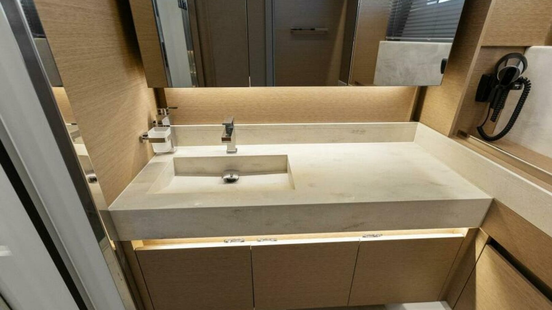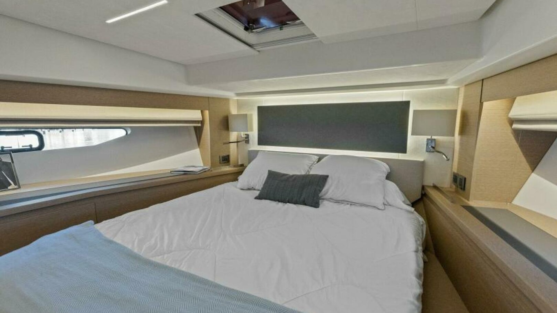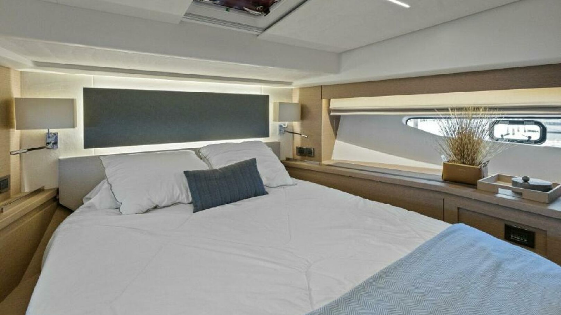 Completely Separate and private from the forward Guest Accommodations is the Full-Beam Master Stateroom. Exiting the Port Guest stateroom heading aft up the companionway stairs through the Salon towards the Galley is the private access stairwell to starboard leading down into the Master. This stairwell is positioned directly across from the Galley. This allows the Owner to have the utmost privacy when travelling aboard with family or guests making the Prestige 590 a highly sought after model in the Prestige Yachts lineup. Moving down the stairwell into the Master suite you will immediately notice how voluminous the room is. Full-beam across, it showcases a Large Island style berth w/ custom built-in end tables, and independent reading lamps. The Booth Style seating console to port is an excellent workspace, but doubles into a flip up vanity top with mirror and built-in storage. Large hull-side windows to port and starboard fill the space with natural light. The windows also have custom blackout shades for increased privacy. Plush Elegance carpeting throughout. Forward in the space is the dual entry into the head and walk-in closet space. Walking into the Master Head you can access the walk-in closet through the centerline walk in shower. The shower has doors on each side allowing you to exit into the head area or out the other side of the shower into the walk-in closet. The walk-in closet has a well thought out His/Her sides with custom built-in hanging space and integrated drawer storage. You can also exit the walk-in closet directly into the master stateroom via the Walk-in closet entry door which is forward and to port in the suite.