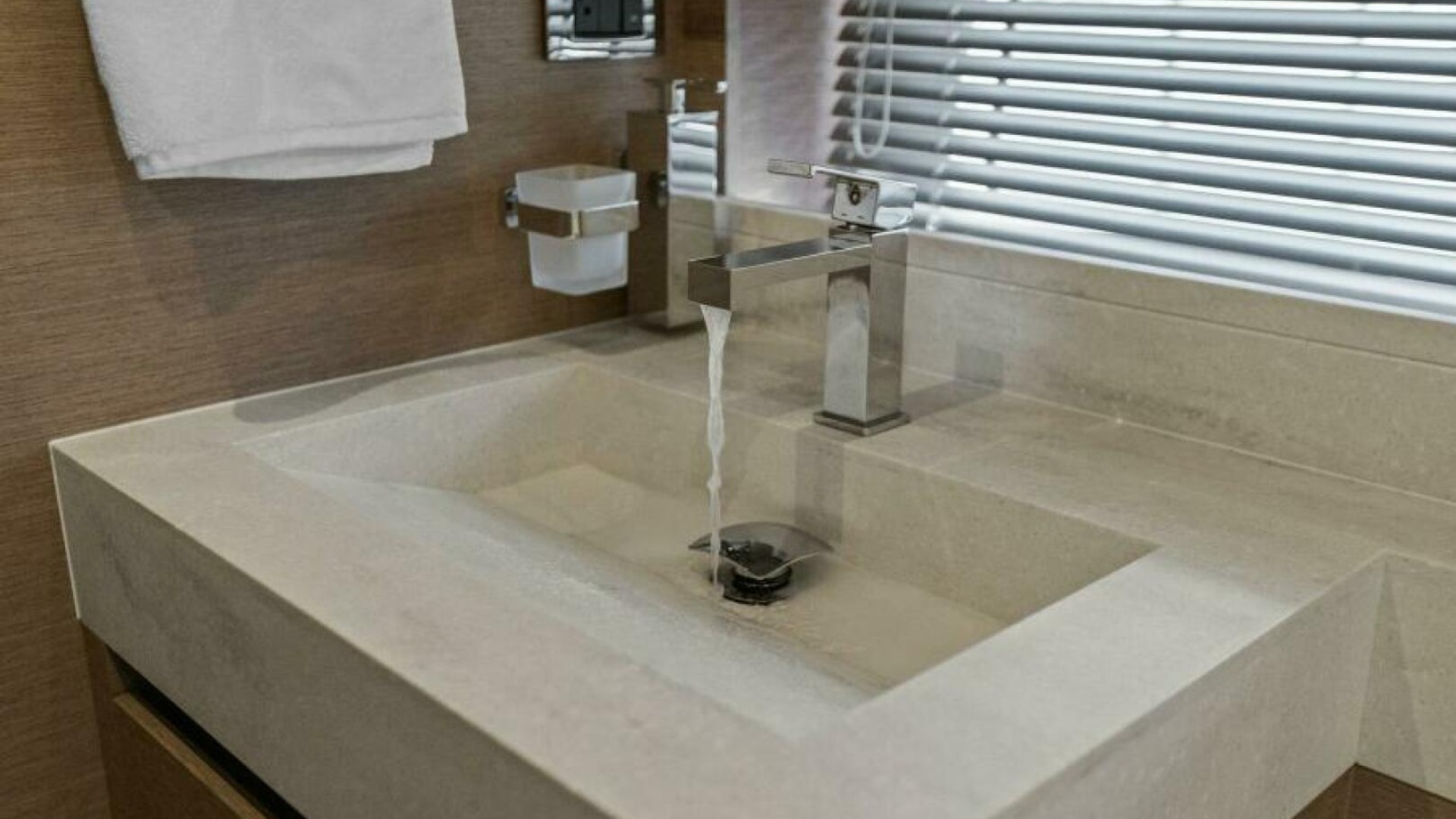 Forward of the Salon you will find yourself descending down the companionway stairwell to the Forward accommodations of the 590. Directly forward is the VIP Stateroom sporting a Queen-Island style berth with the option to split the berth into a two single sleeper arrangement. The forward VIP has private ensuite access to the starboard guest head. The stateroom is finished in Grey Oak Cabinetry, plush carpeting throughout, and ample hanging locker storage for the extended trips at sea. Natural lighting prevalent due to the large glass Hull-side windows to port and starboard.