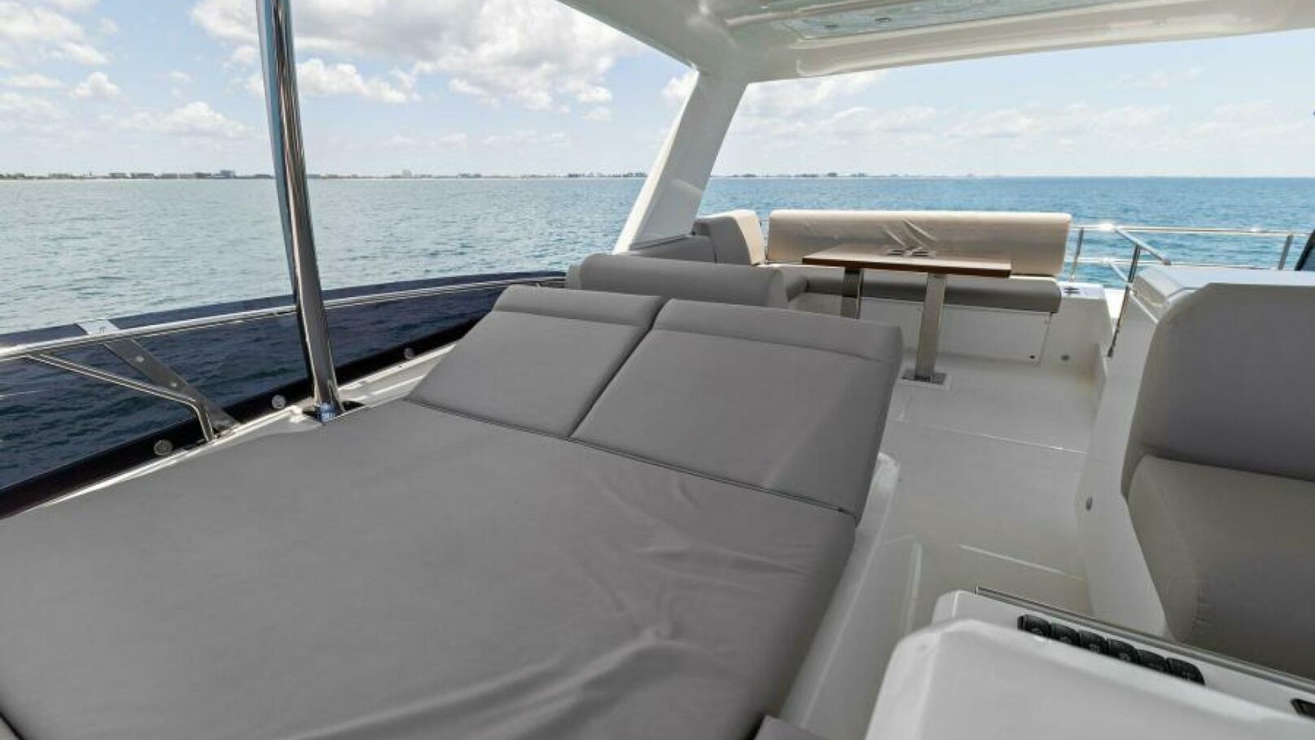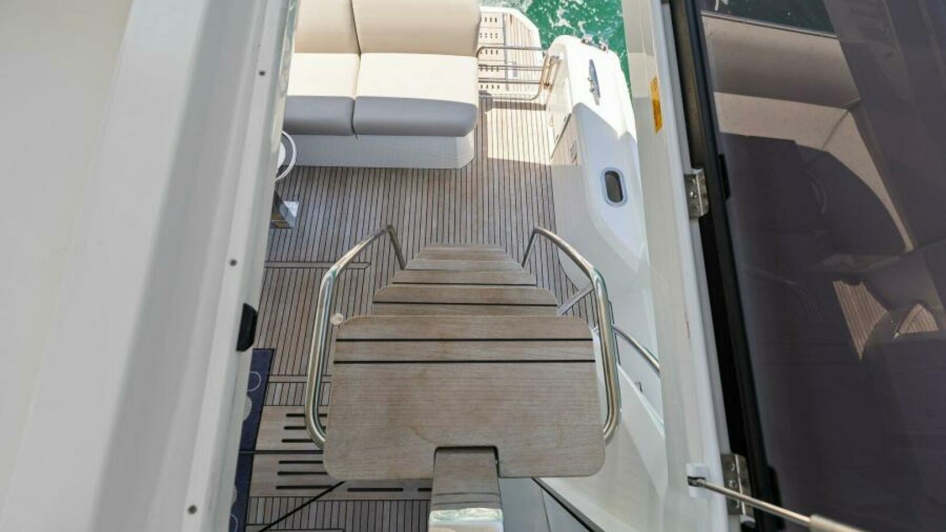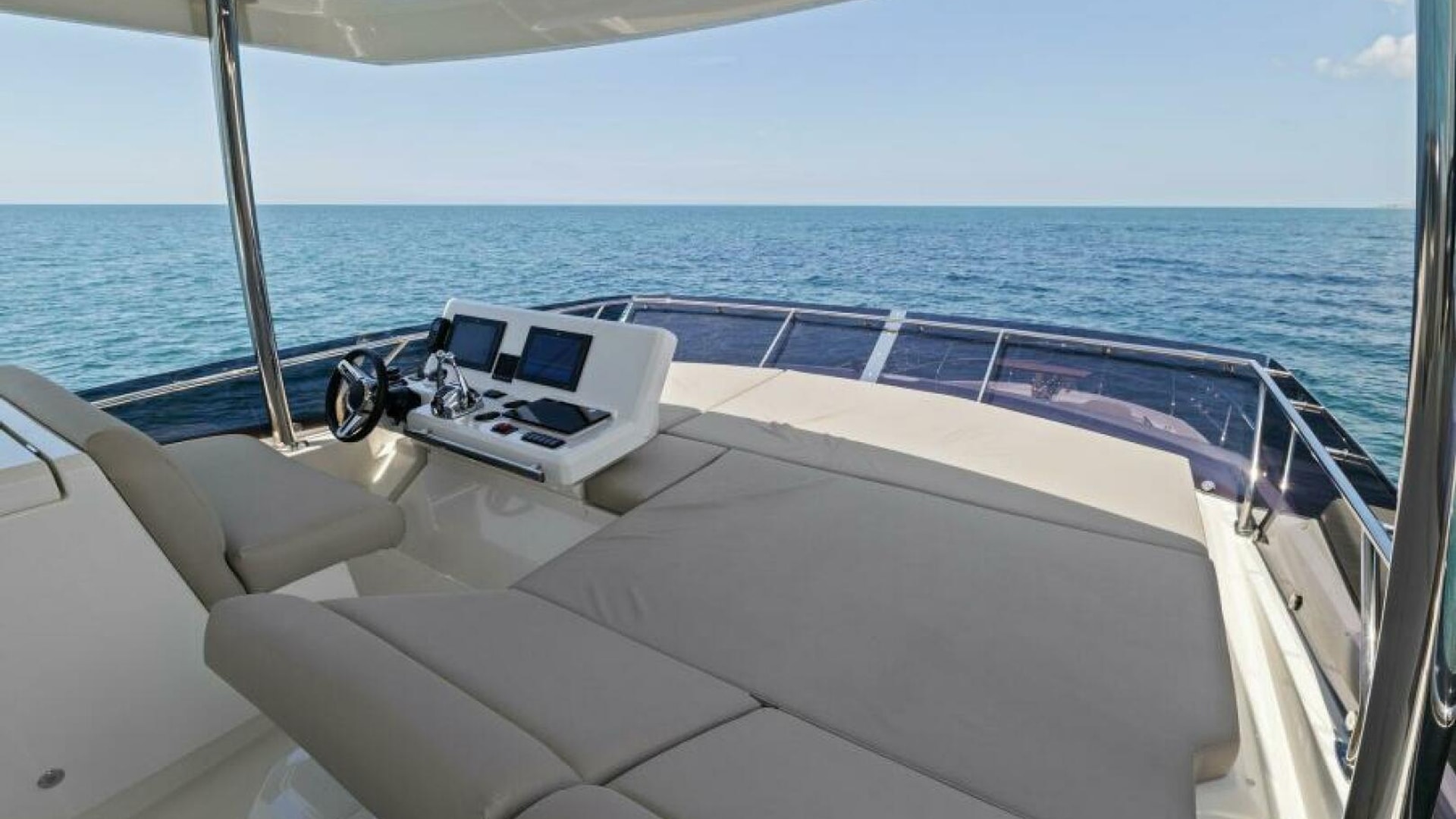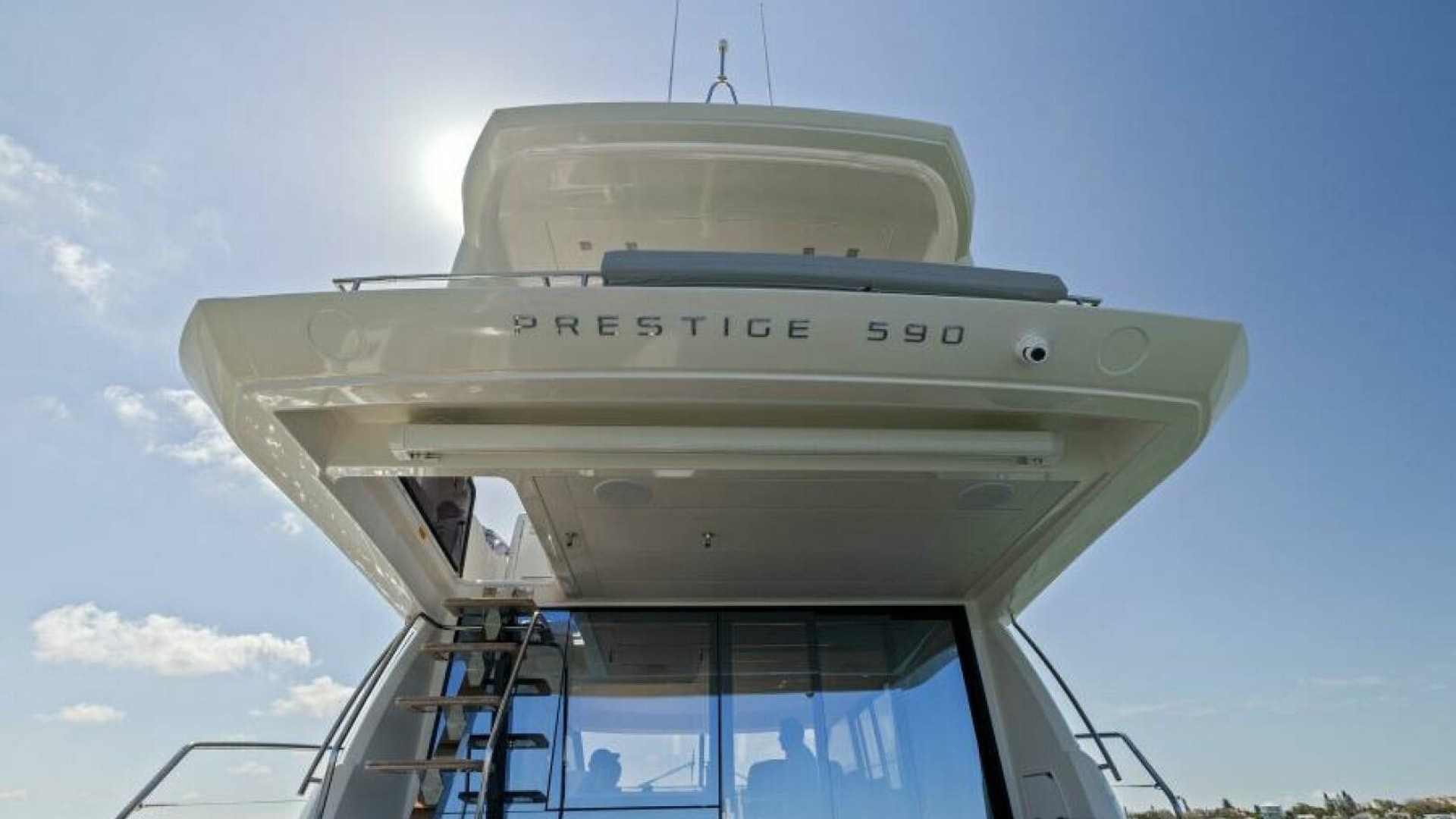 Stepping aboard onto the Swim platform of this 2022 Prestige 590 Fly you immediately feel the transition from land to the open ocean when your feet touch the teak decking. You will immediately notice the vastness of the swim platform area and its conveniently located railing system for easy movement throughout the space.