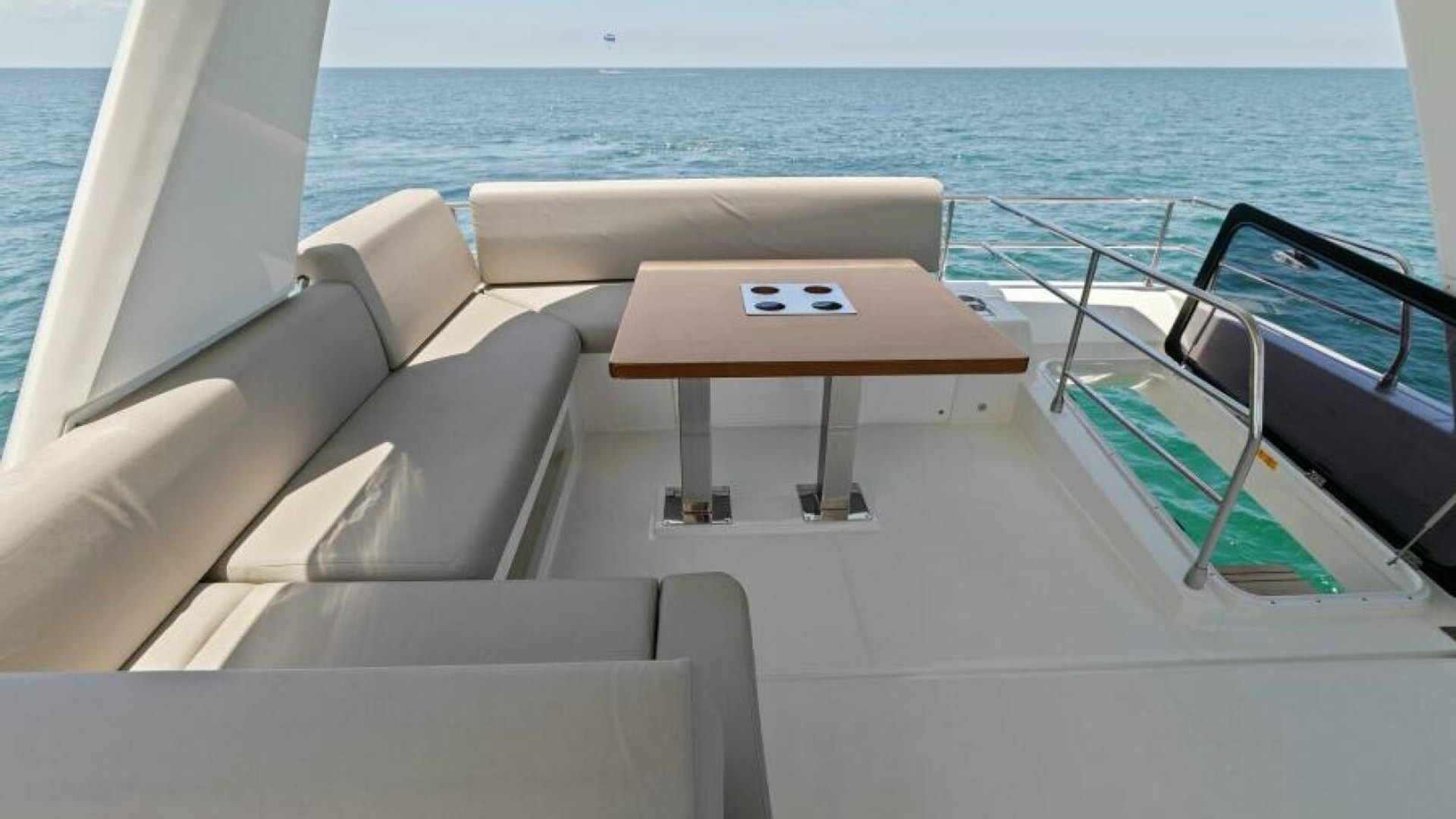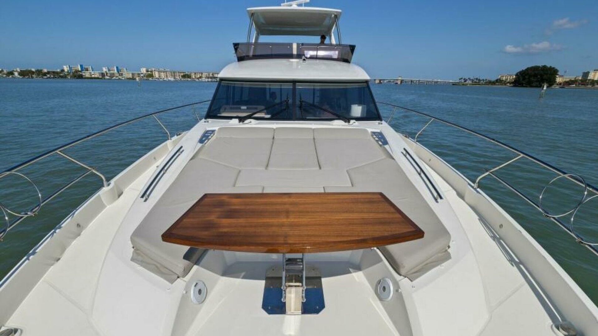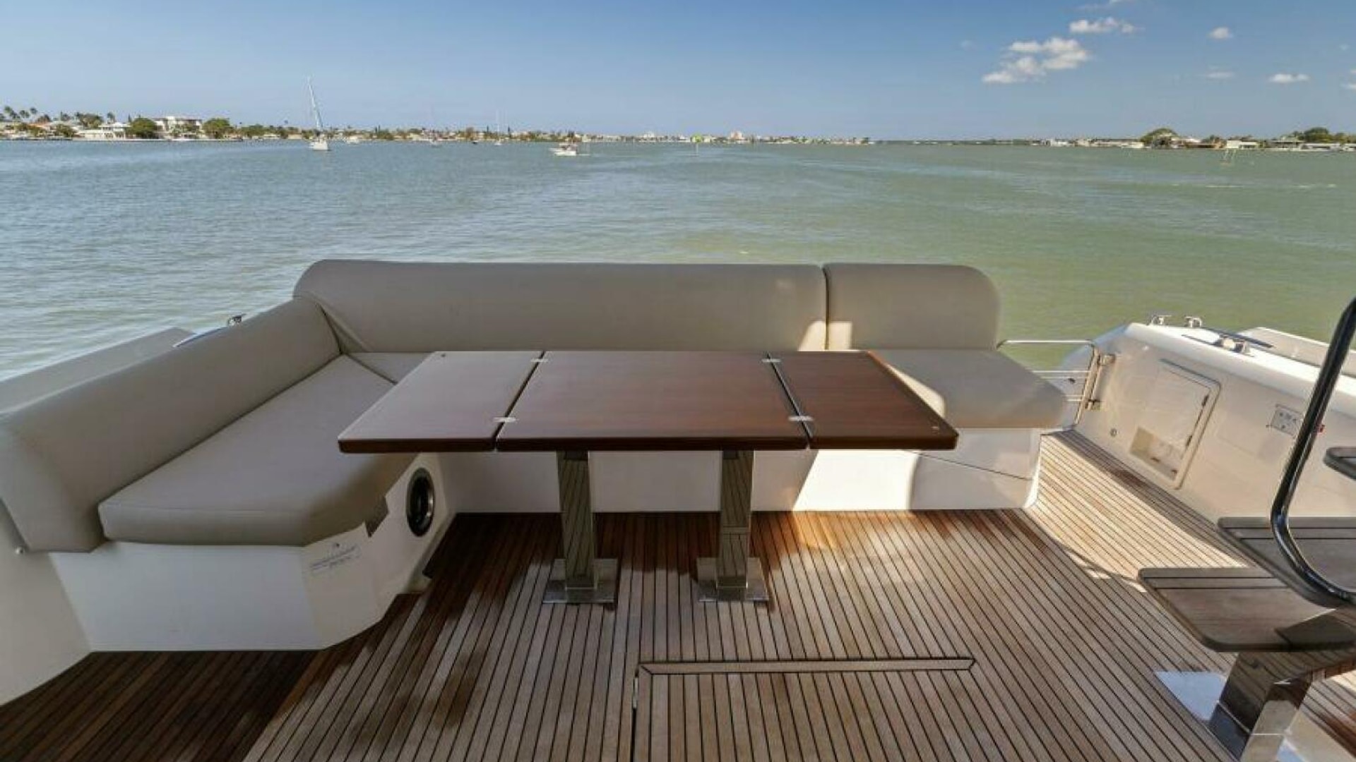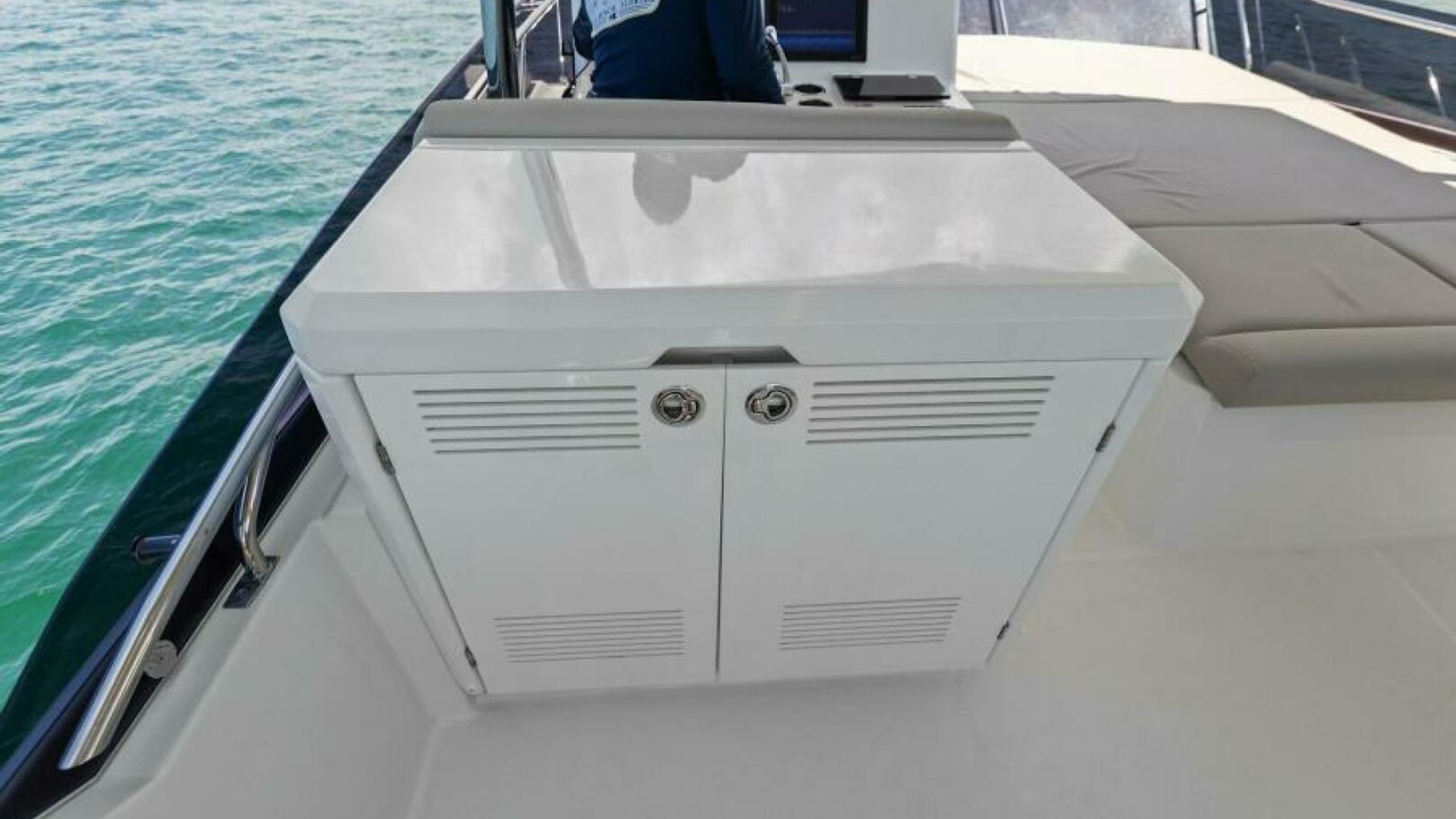 Stepping aboard onto the Swim platform of this 2022 Prestige 590 Fly you immediately feel the transition from land to the open ocean when your feet touch the teak decking. You will immediately notice the vastness of the swim platform area and its conveniently located railing system for easy movement throughout the space.