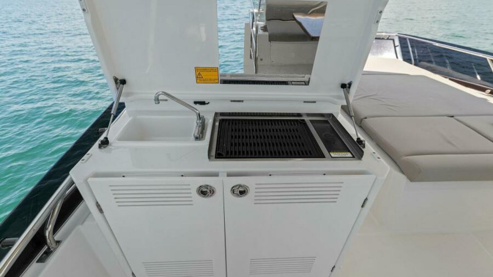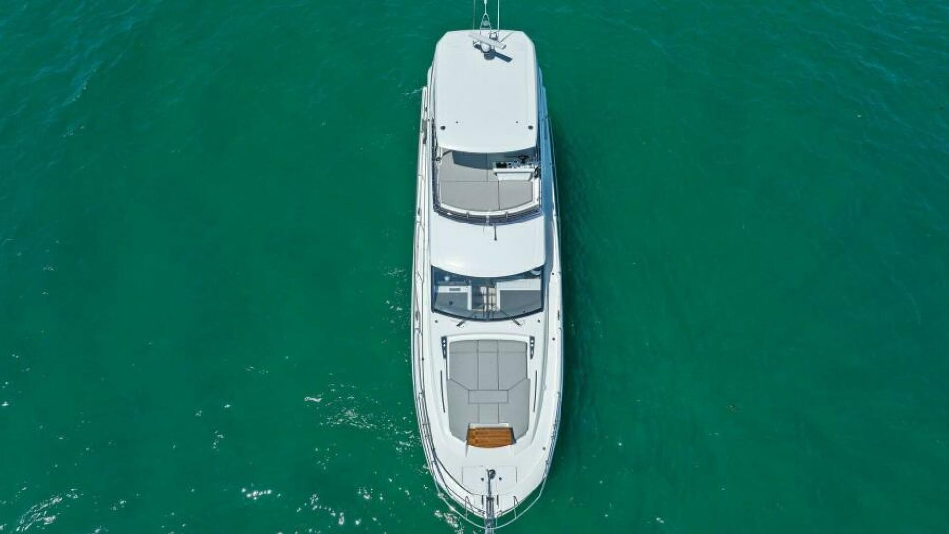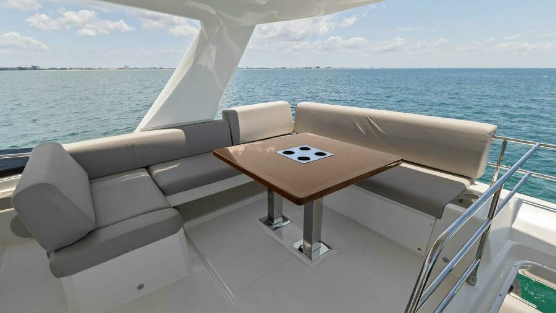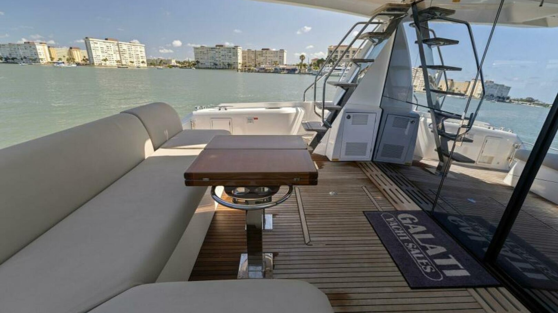 Stepping aboard onto the Swim platform of this 2022 Prestige 590 Fly you immediately feel the transition from land to the open ocean when your feet touch the teak decking. You will immediately notice the vastness of the swim platform area and its conveniently located railing system for easy movement throughout the space.