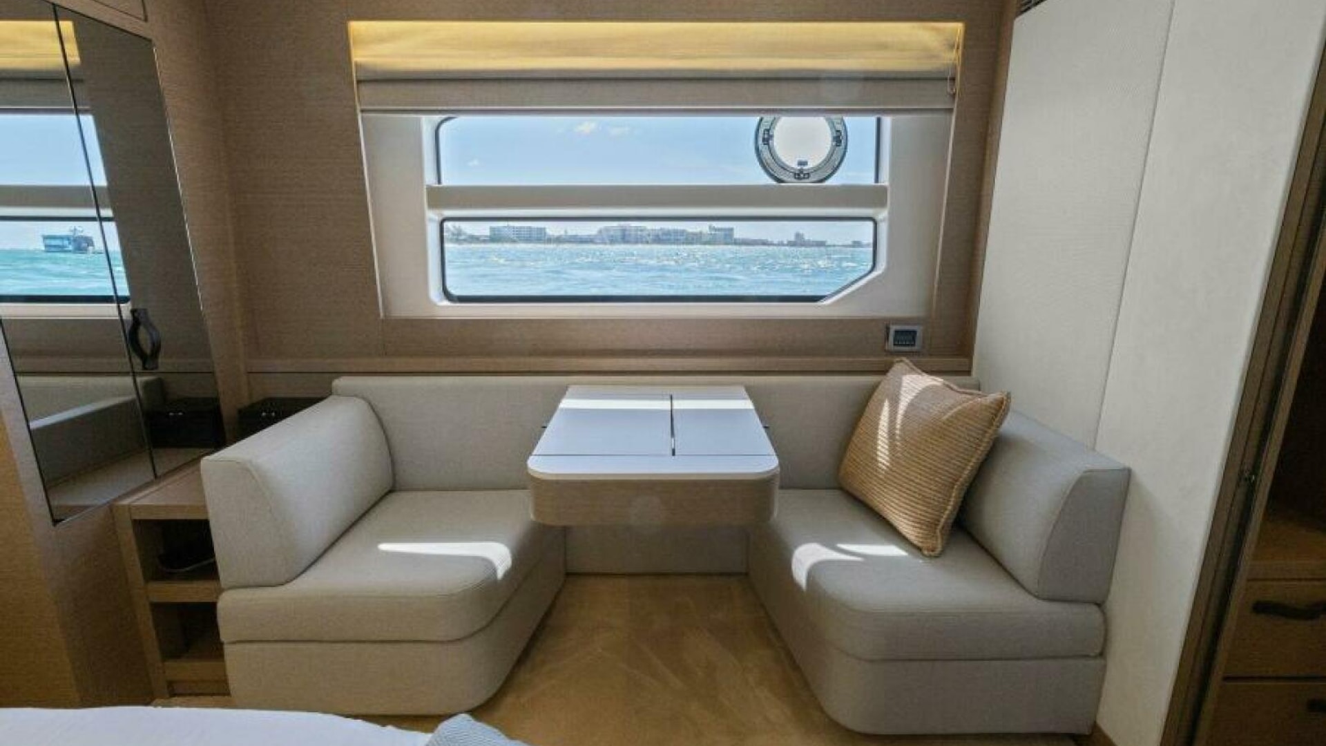 Stepping up one step into the Salon the panoramic glass windows give you nearly a 360 degree view of your surroundings. There is an abundance of natural lighting and open feel of the Salon provides you with an airy space to enjoy the company of your family or guests aboard. Adding to the openness of the Salon is the large U-shaped sofa to port wrapped around an elegant fold-out Electric High-Lo Table. Across to starboard is a Custom Spit Sofa Arrangement making the entire Salon space a very conversational layout while adding a sliding Glass door for transitioning to the exterior foredeck space of the 590 Prestige.