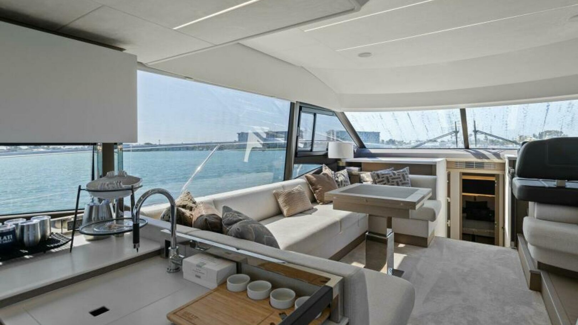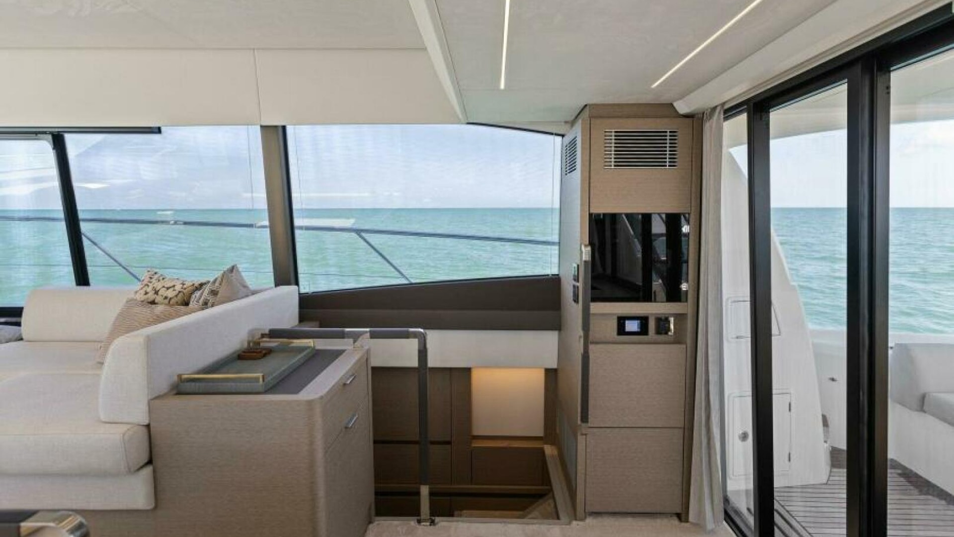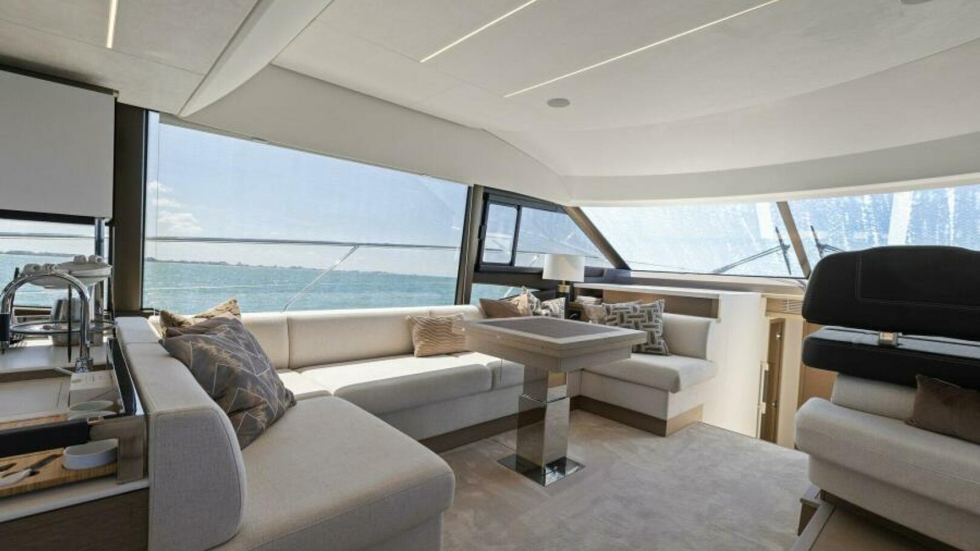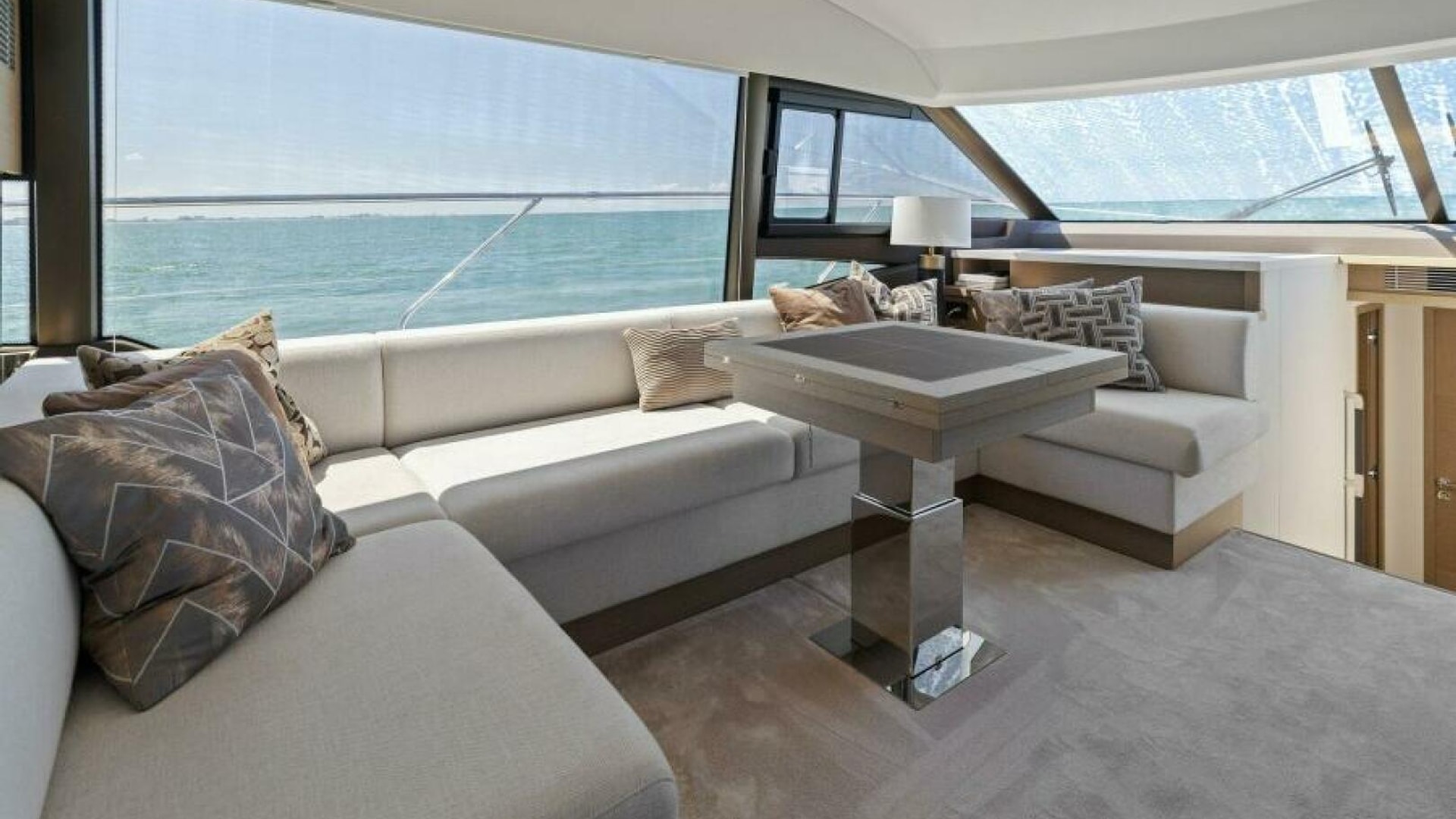 The attention to detail sets the Prestige 590 apart. Rounded furniture edges blend into comfortable seating areas that are both cozy and inviting. The materials, layout and sightlines all contribute to a sense of well-being onboard and an understated, refined elegance.