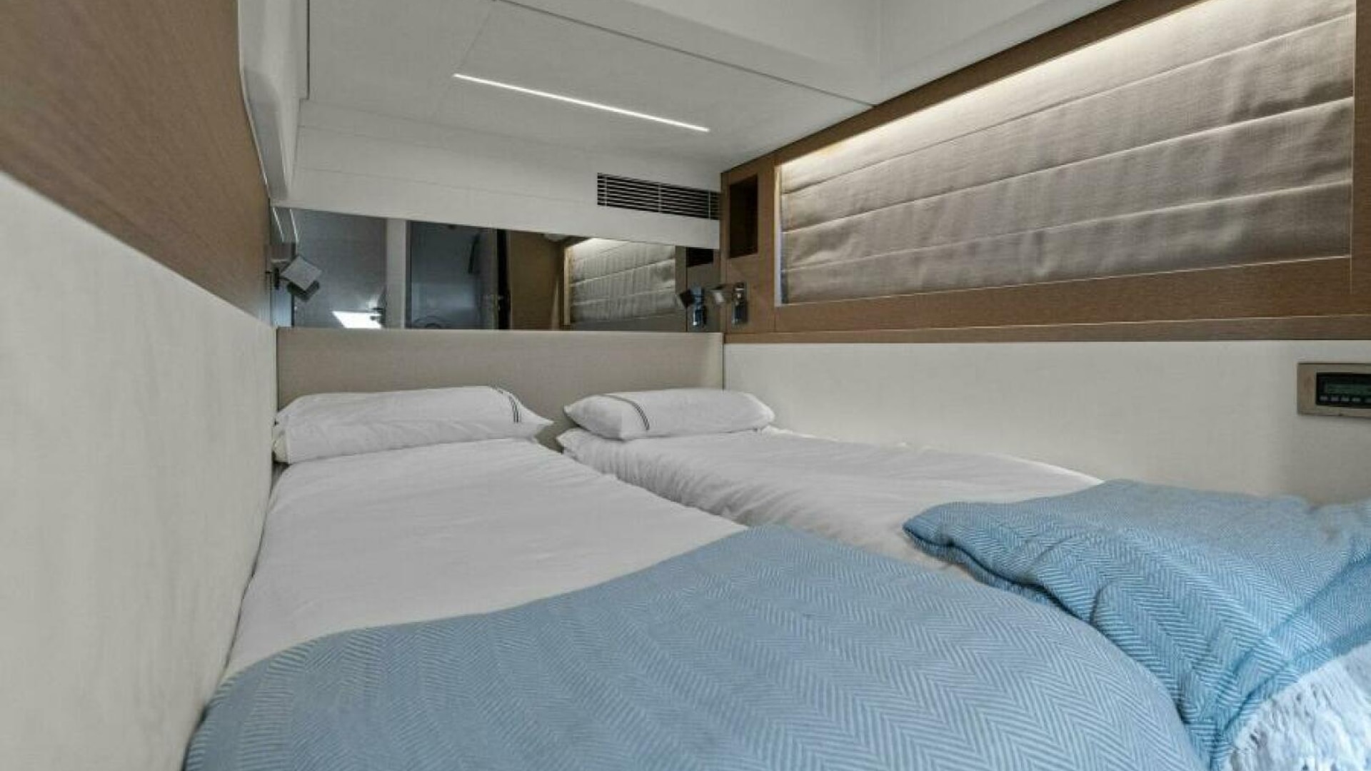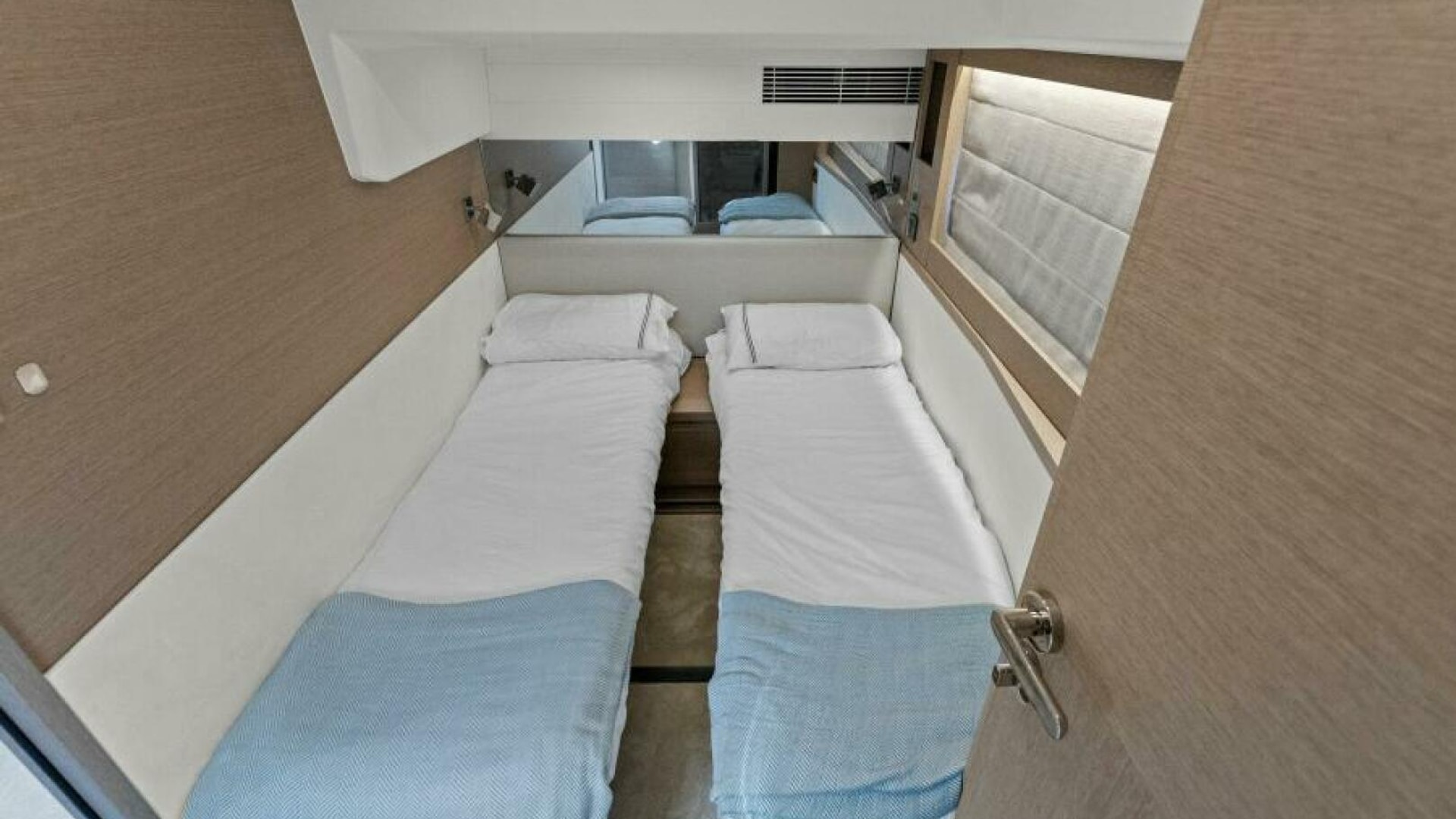 Exiting the forward VIP aft and to port is the Second Guest Stateroom featuring a split side-by-side bunk arrangement. The single berths can be combined into a larger sleeping platform via a slide system integrated in the floor. Present is a large Hanging Locker for storage, Hull side tinted glass window for natural lighting, and private entry doorway to the private ensuite head.