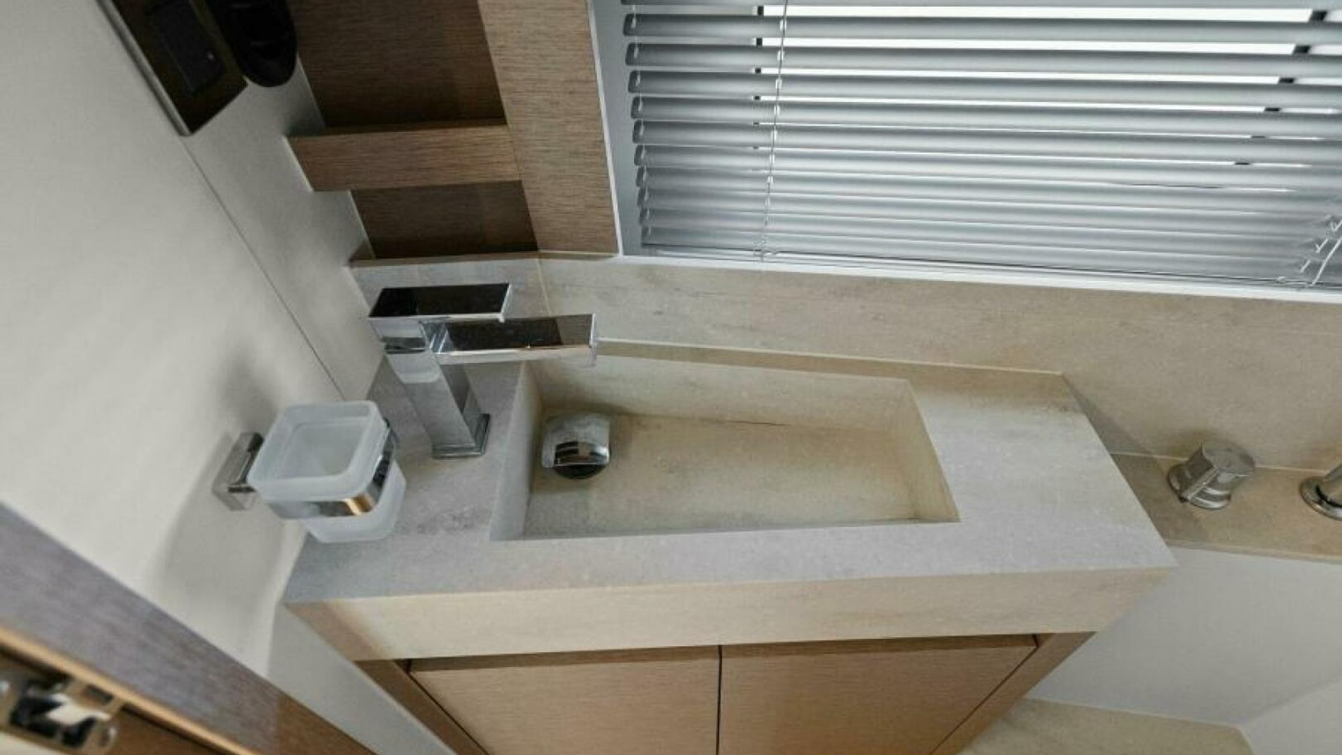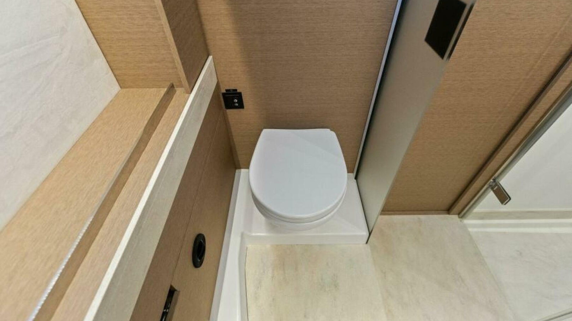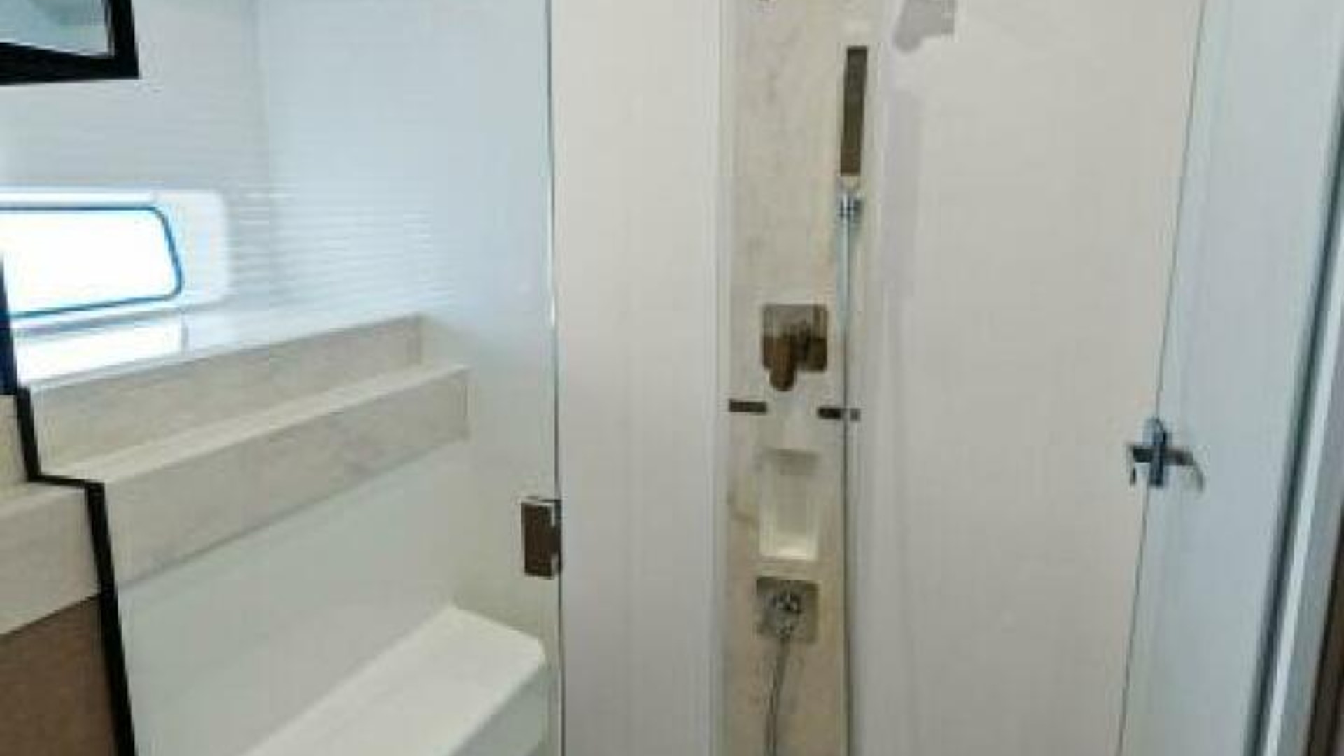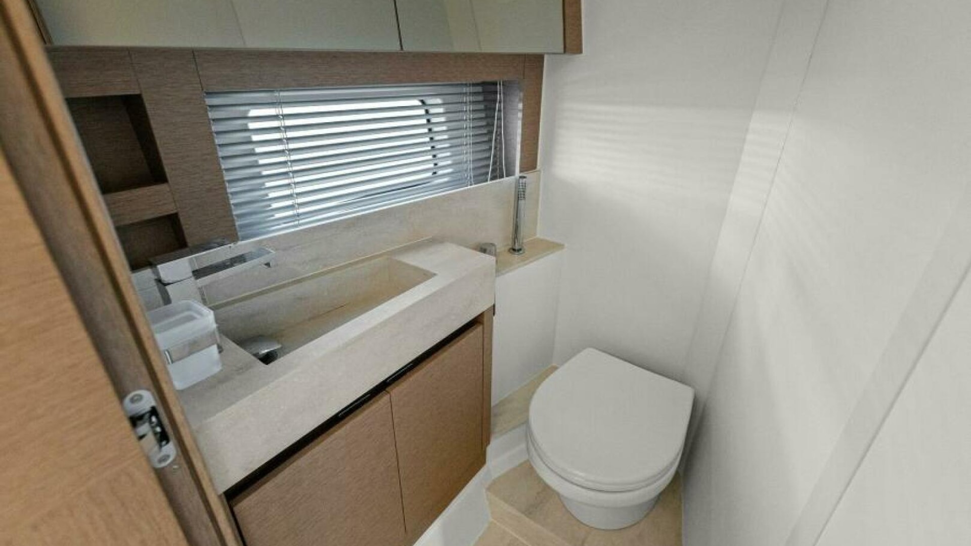 To port you will find the large teak stairwell ascending to the aft deck/cockpit. This area offers a large aft seating console wrapped around a beautiful high-gloss teak table with folding leaves and polished stainless steel pedestal making alfresco dining a breeze. Teak decking is present throughout this area giving you comfort while barefoot or in your favorite deck shoes. Underneath the aft cockpit seating is the Crew space entry door w/ assisted gas shock leading into the climate controlled single crew berth. This space features a large tinted glass window for natural lighting extending across the beam of the vessel for natural lighting. In addition to the Grey Oak finish your Crew member will have their own private wet head to starboard in the space.