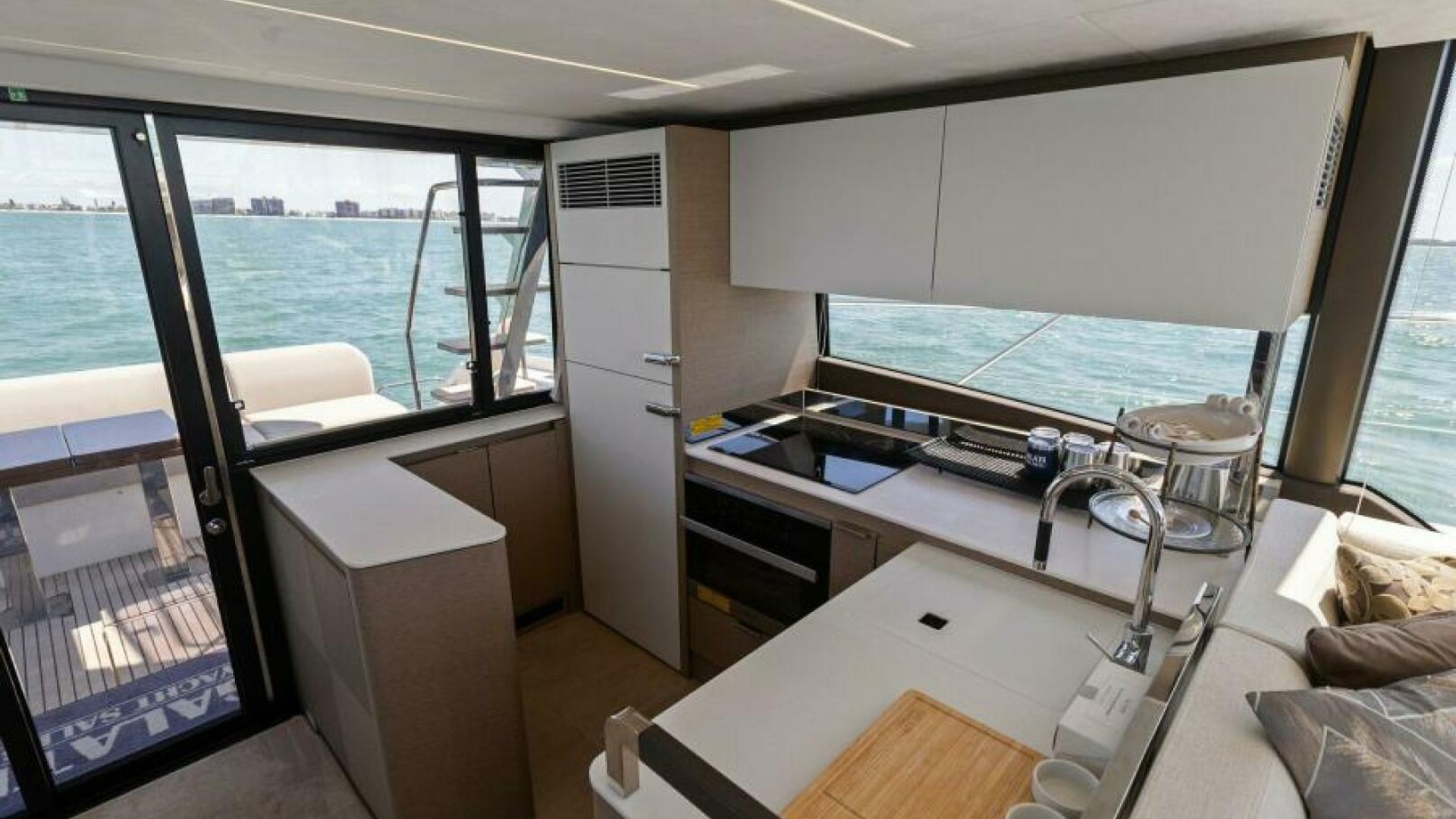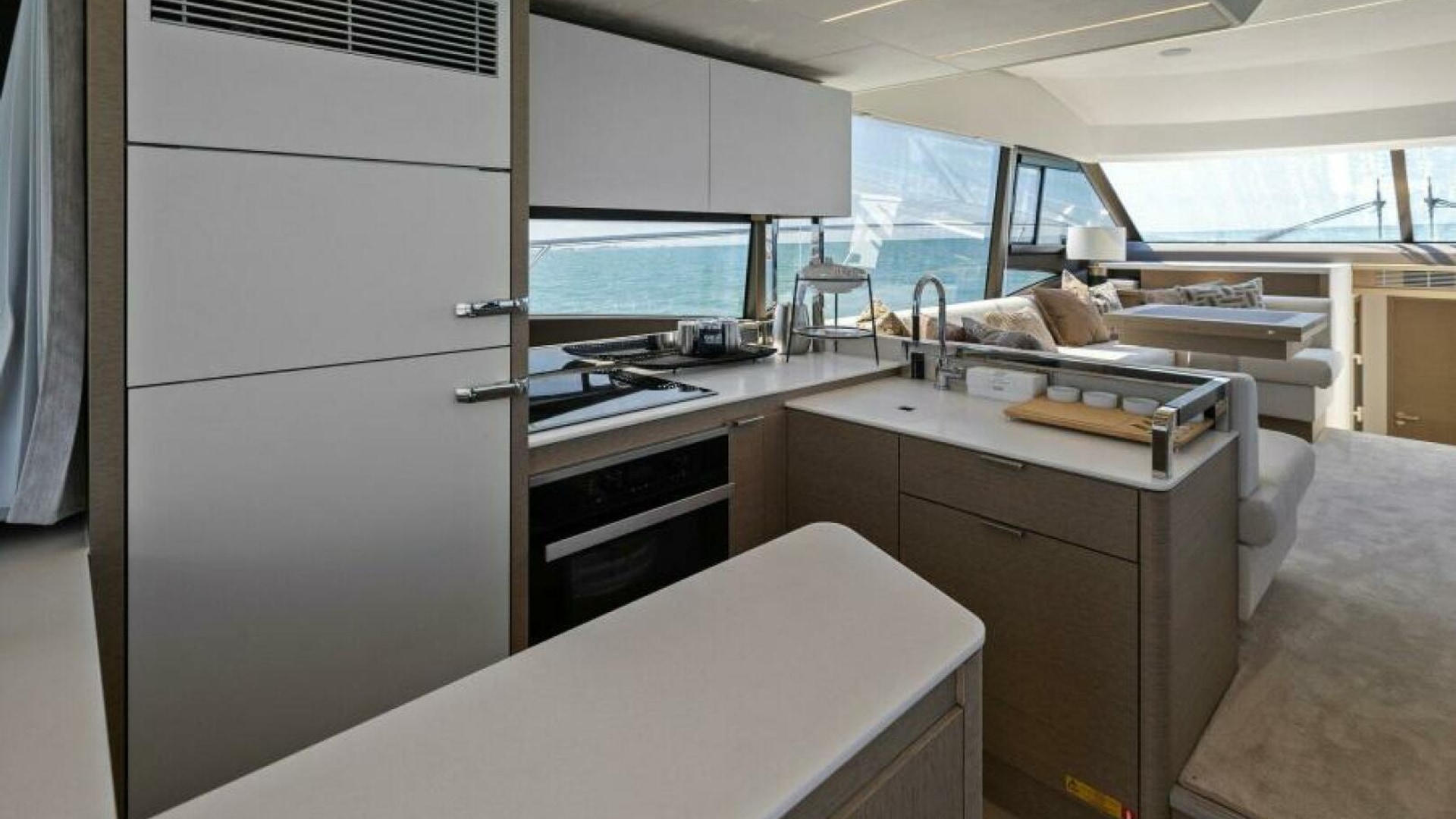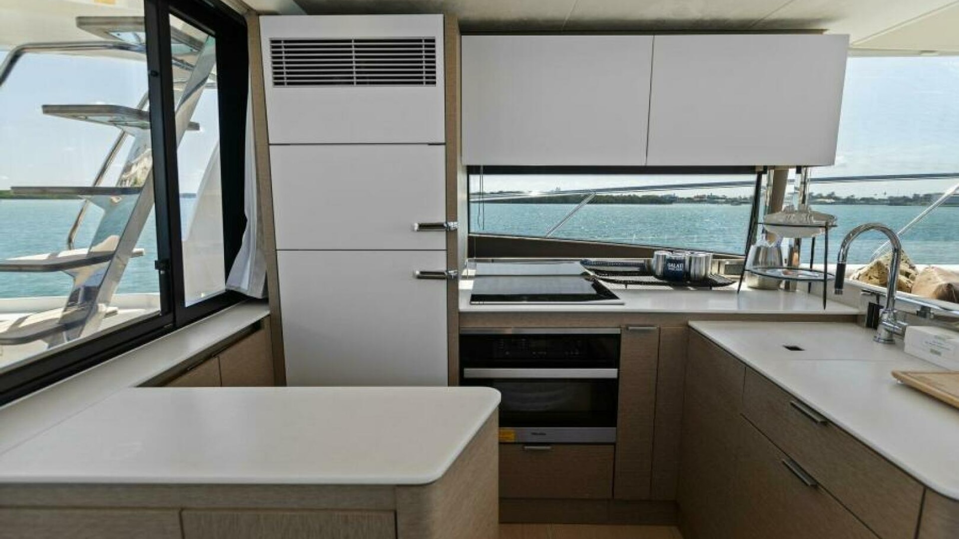 Moving forward of the Cockpit are the Heavy Duty Tinted Glass Sliding doors where you gain access to the Galley. The Aft Galley layout of the Prestige 590 Fly is extremely well thought out and functional while underway at sea. The Galley sports a large stacked refrigerator freezer set up w/ Custom Grey Oak Cabinet face, 3-Burner Glass Cooktop, and Miele Microwave Oven. Countertops are white Corian Stone and the ample Cabinet storage above and below the countertops is finished in Grey Oak Wood. This Galley layout really brings the outside in by always allowing the person in the Galley to be apart of the action.