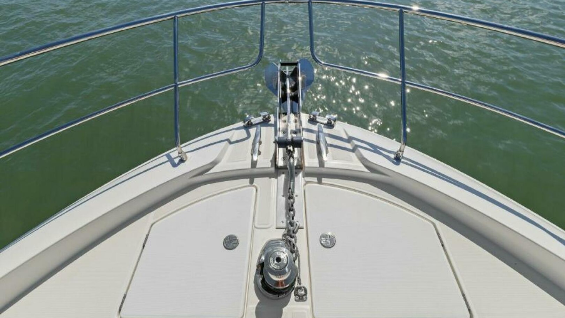 Walking down the flybridge ladder and then forward along the port and starboard walkways to the bow area you will find a massive yet comfortable sun lounge with adjustable seating and a pop-up finished wood table on a polished stainless steel base. The decking throughout the bow area is non-skid and features pop in stainless steel deck fittings for the Mediterranean Shade that breaks the sun off of the sun bed. In the bow you will also find convenient fold down stainless fender holder rings for securing fenders while underway. Forward of the sunbed is the anchor windlass and locker. The anchor locker has a fresh and saltwater washdown connection for convenience. Anchor windlass foot pedal controls are mounted in the foredeck allowing for anchor control at the bow. Wrapping the entire bow area for safety is the Stainless Steel Bow Rail standing at a generous height for easy movement throughout the foredeck.