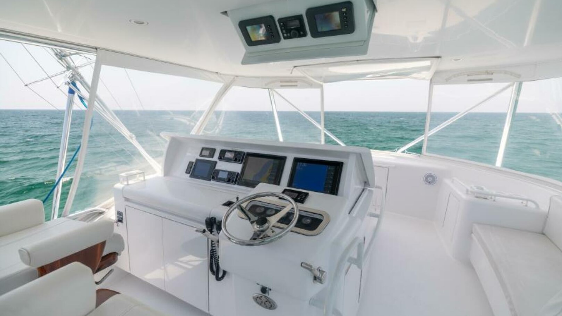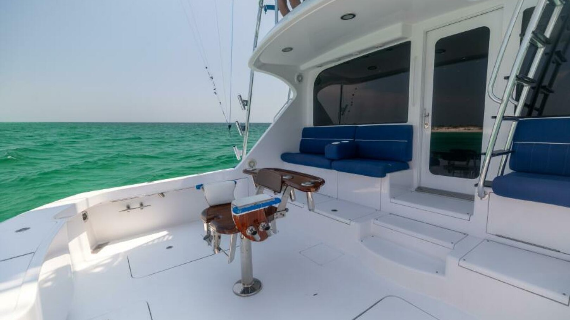 The spacious cockpit is equipped with all the necessary fishing amenities, including a large transom door, tackle storage, a bait freezer, ice maker and an in-deck fish box. Above, the flybridge offers excellent visibility and includes a helm station with state-of-the-art garmin electronics, comfortable seating, and ample storage.