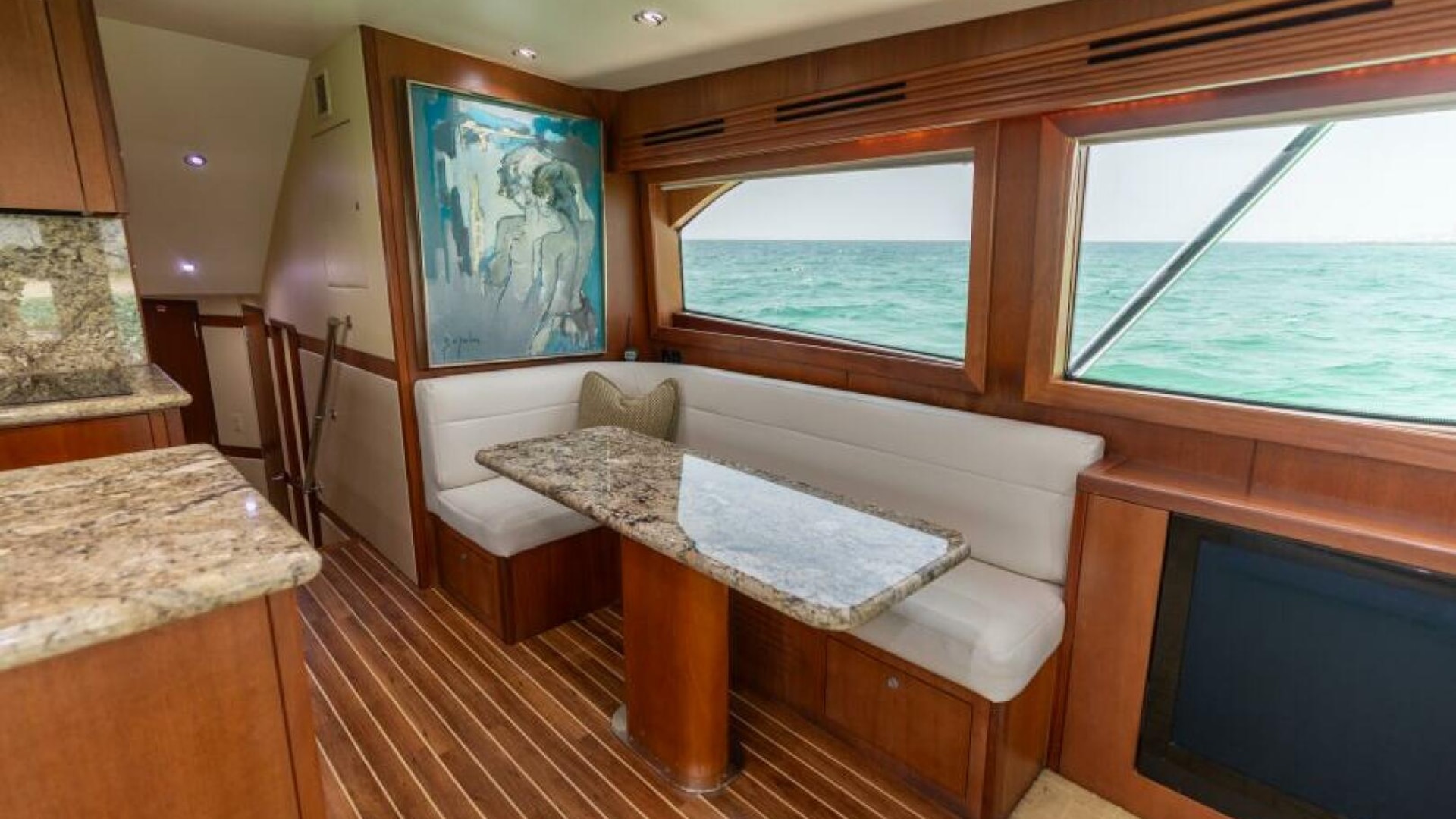 - Cherry wood face above forward dinette with Artwork