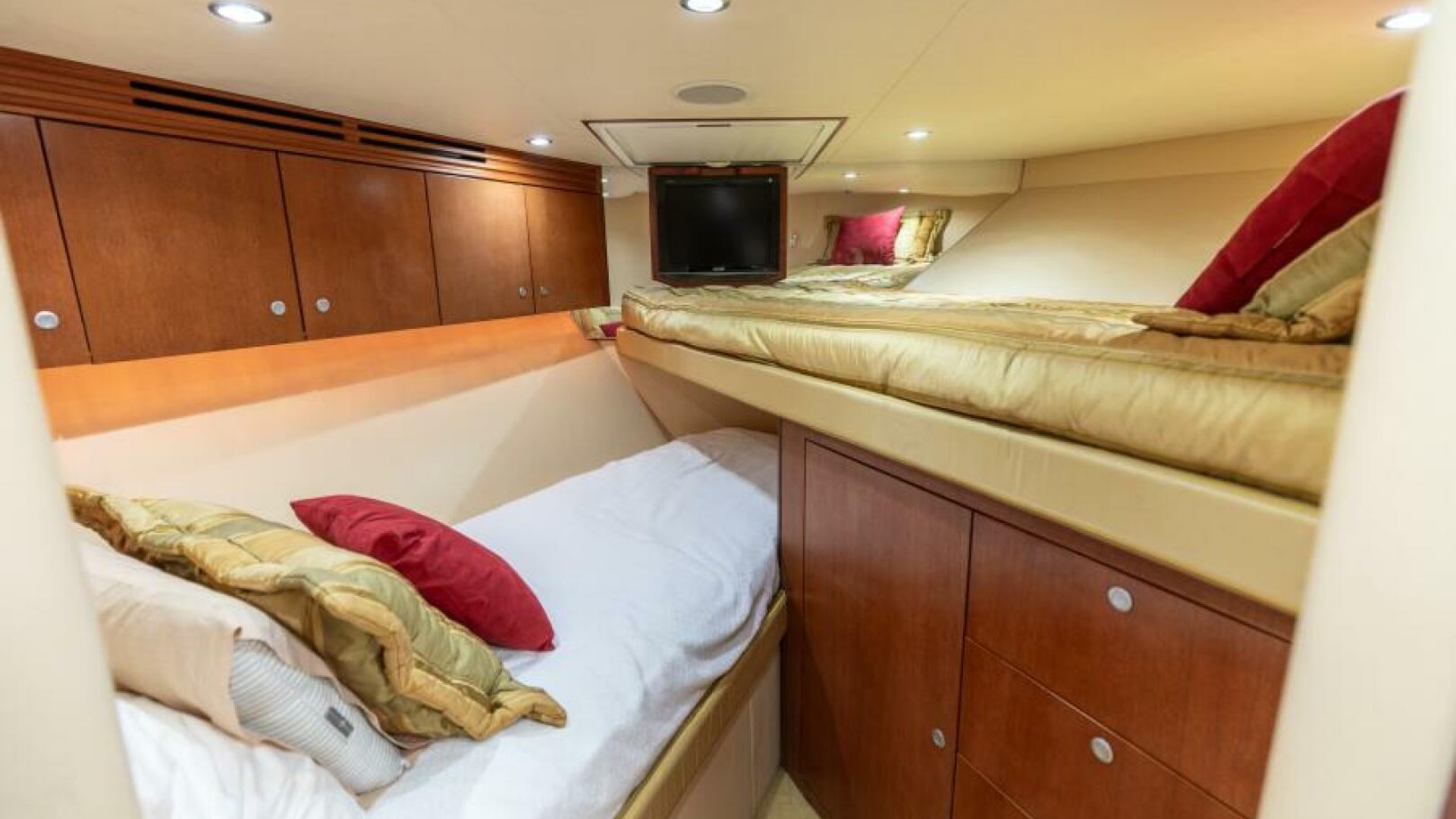 - Cross berth arrangement with cedar-lined storage below