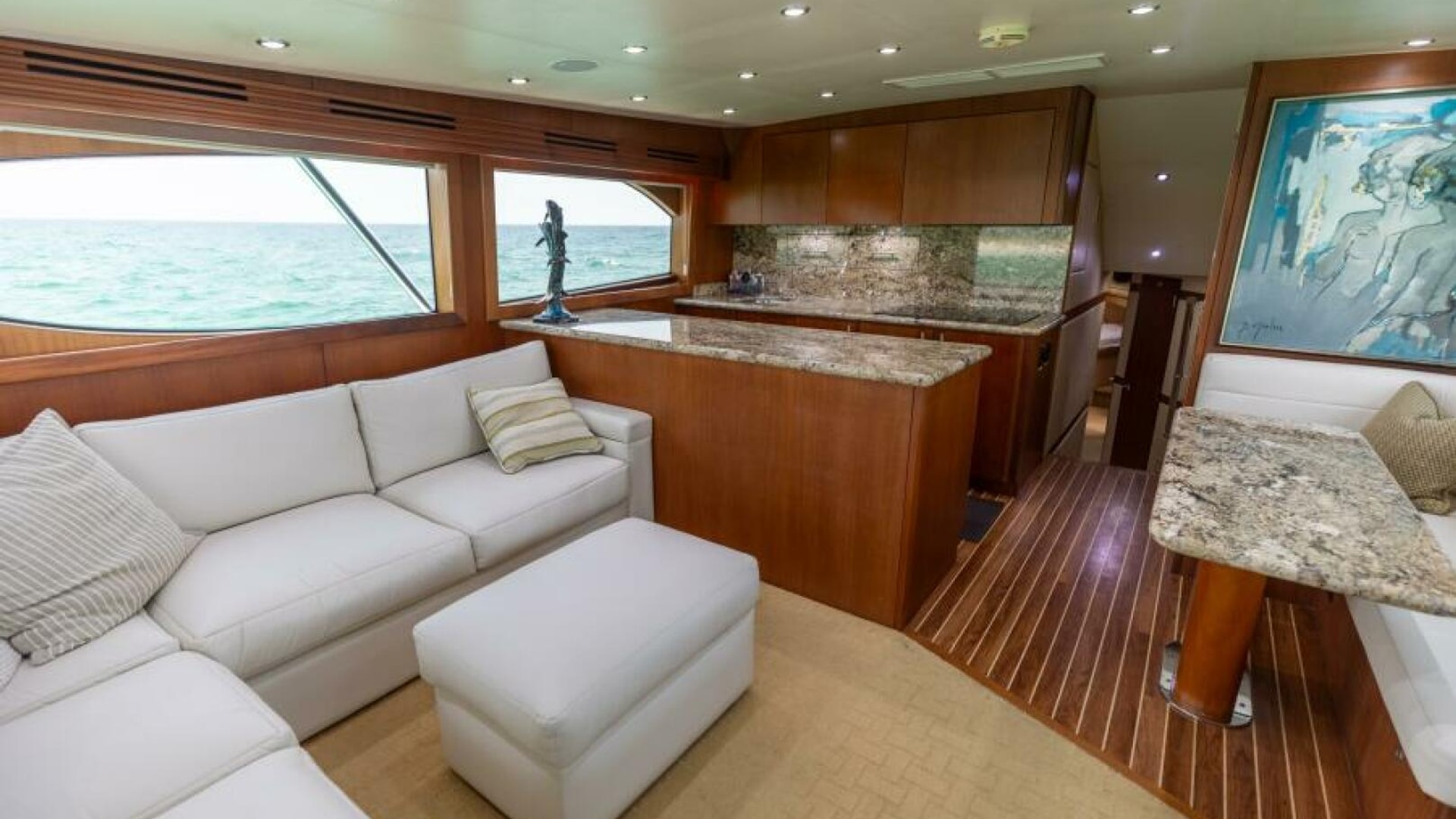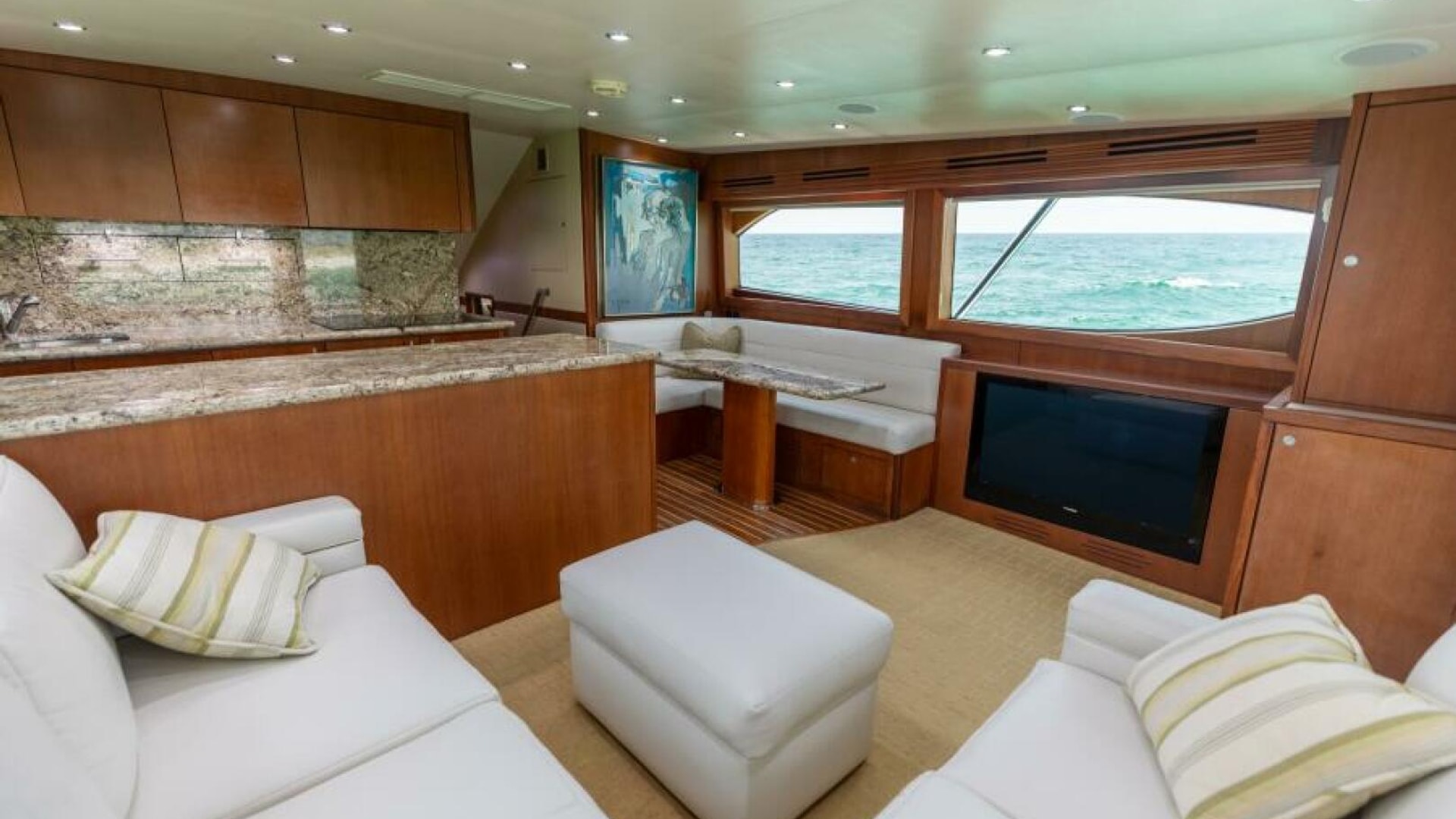 Inside, the Hatteras 60GT offers a luxurious and well-appointed interior with high-end finishes and attention to detail. The salon features plush seating, a well-equipped galley with modern appliances, and a dinette area. Below deck, the yacht includes three staterooms, including a large master suite, and two additional guest cabins, each with en-suite heads..