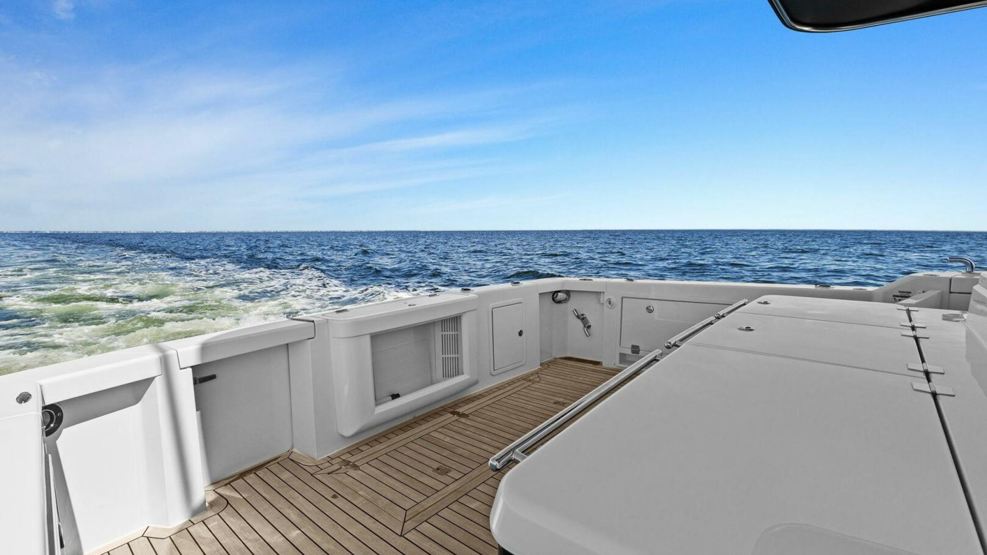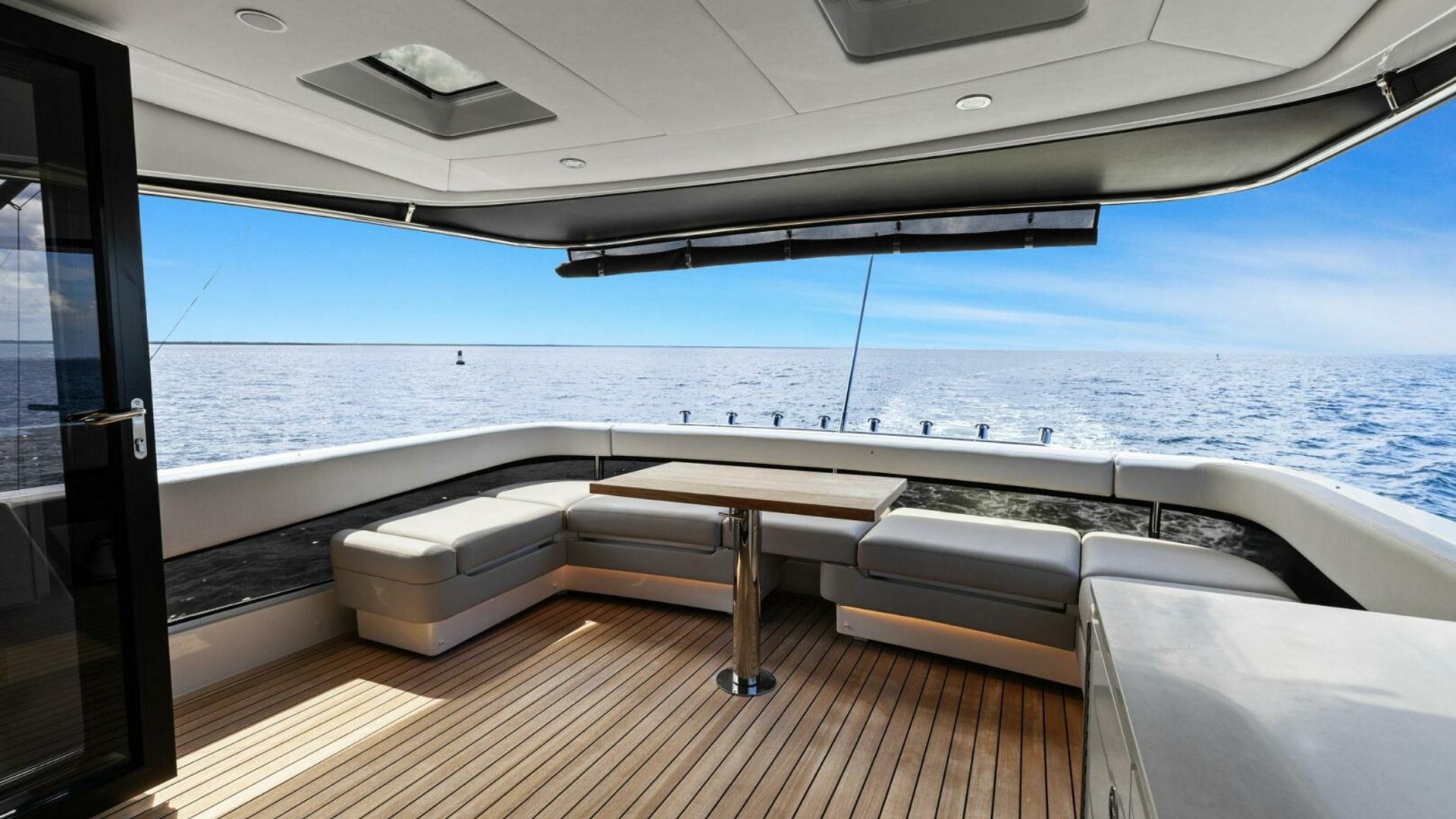 - Flybridge: Extended aft, U-shaped lounge seating, balcony outlet, stereo speakers, aft drop cover