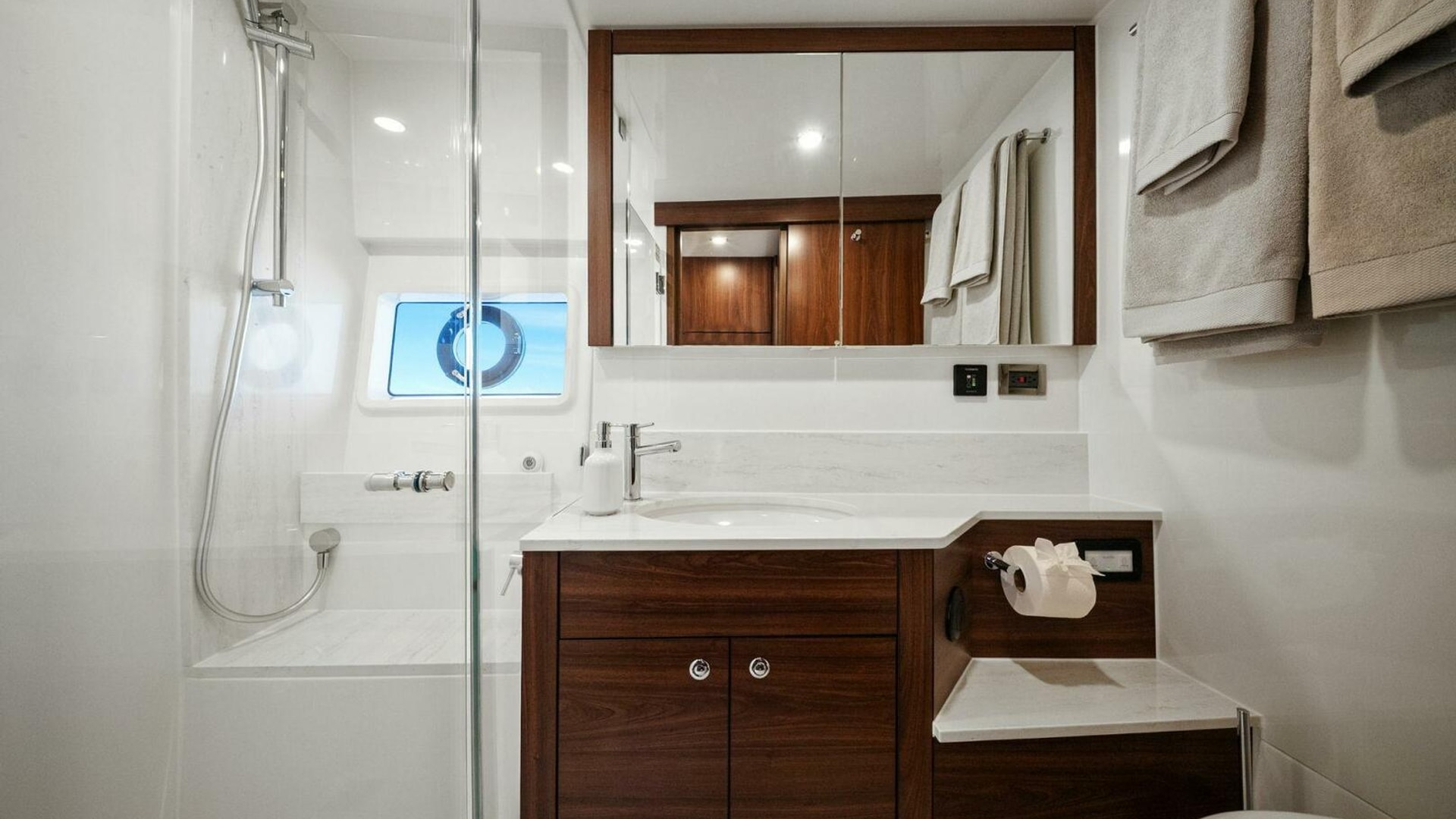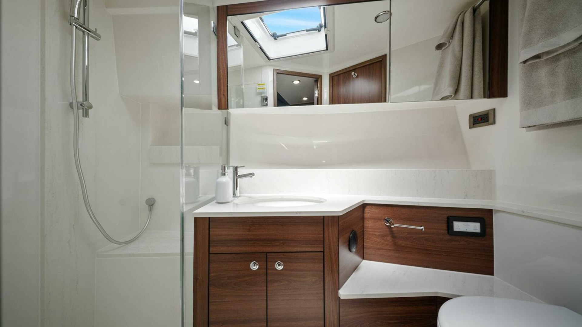 - Guest bathroom - shared with companionway - fresh water flush toilet, shower with automatic pump, frameless glass shower screen, vanity with mirror, LED down lights, solidsurface bench top, deck hatch with blind, towel rails and robe hooks