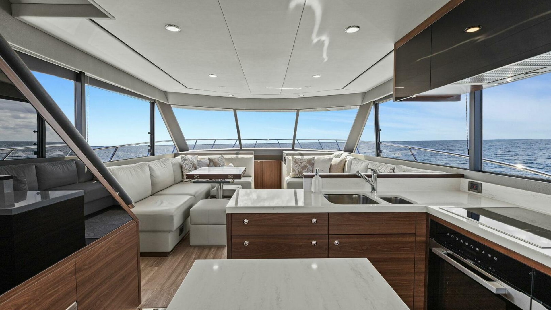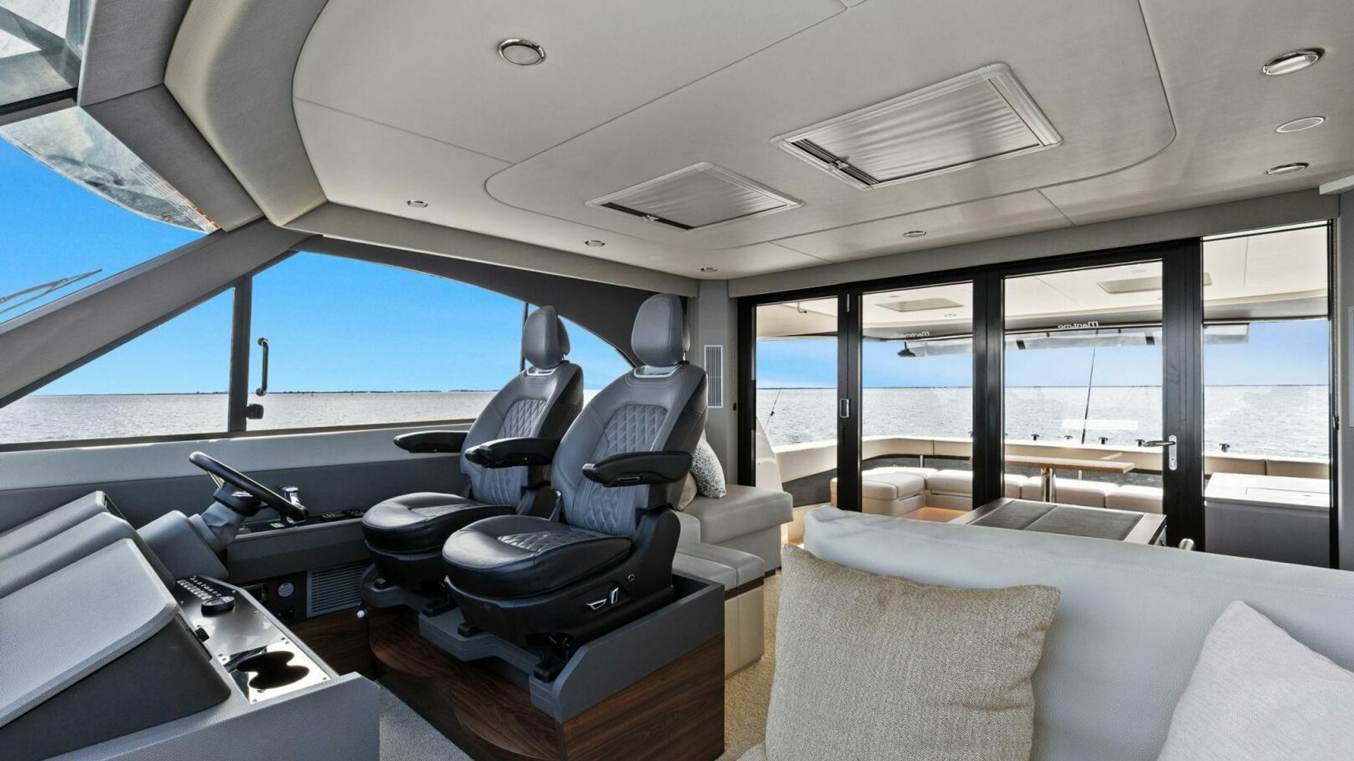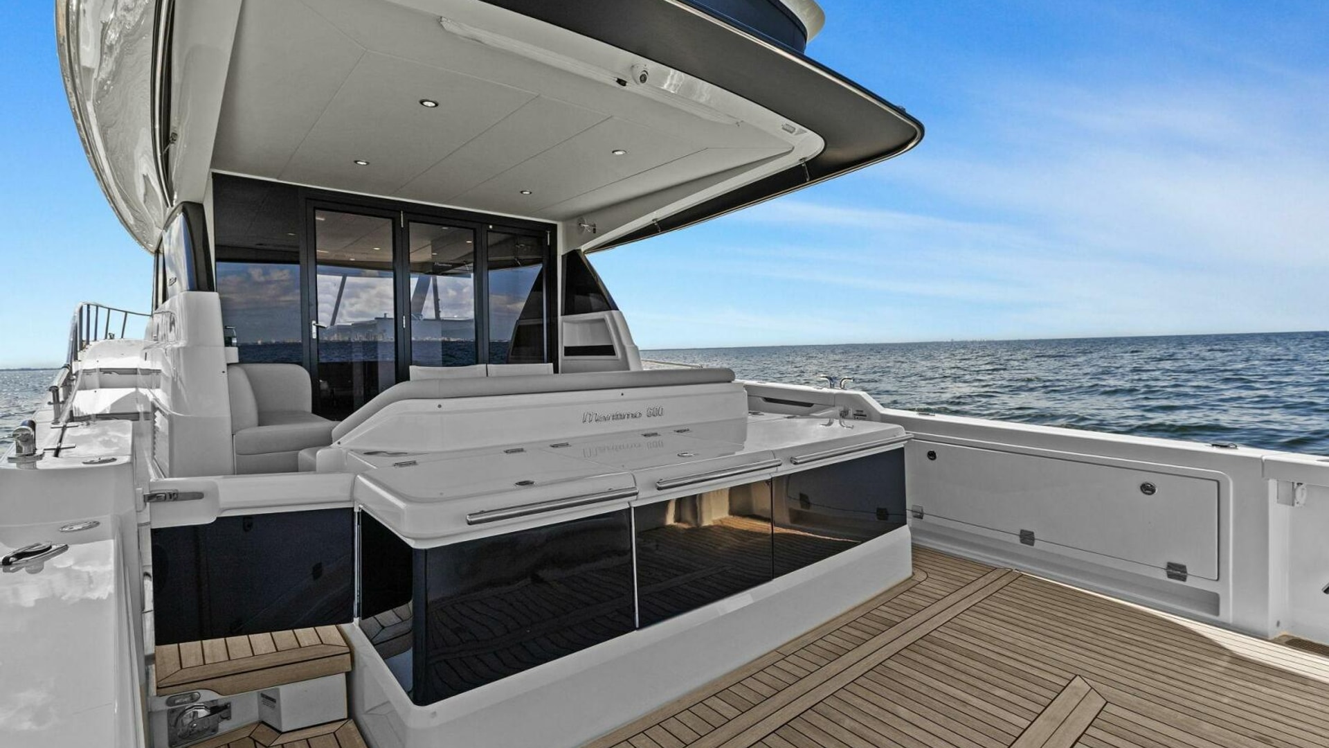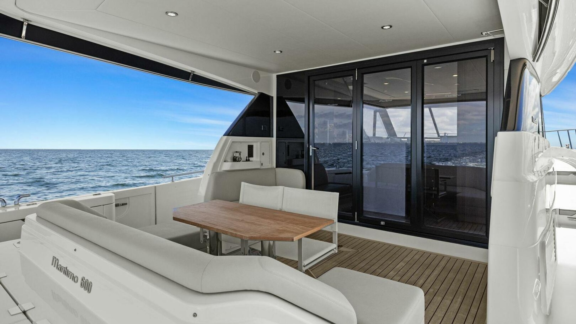 - Windows & Doors: Maritimo panoramic sliding windows (salon & flybridge), bi-fold doors to galley
