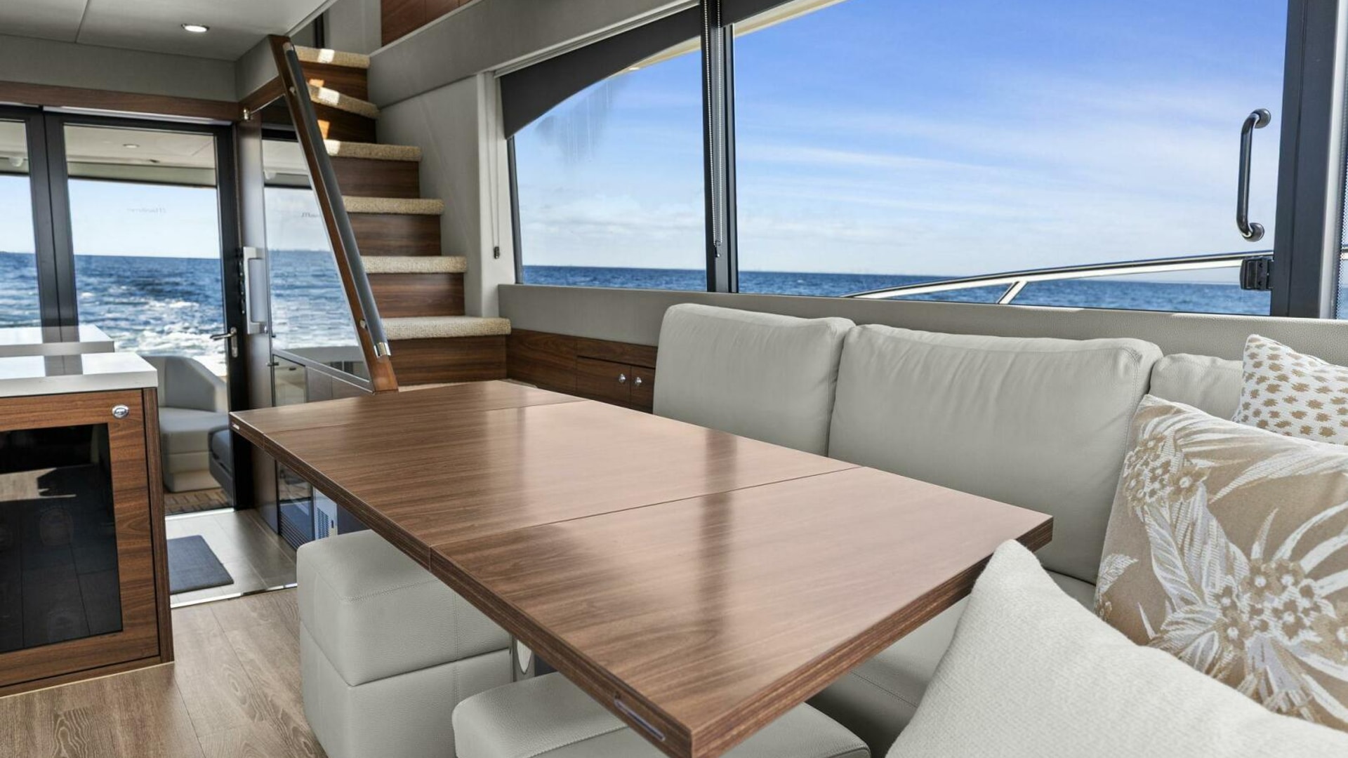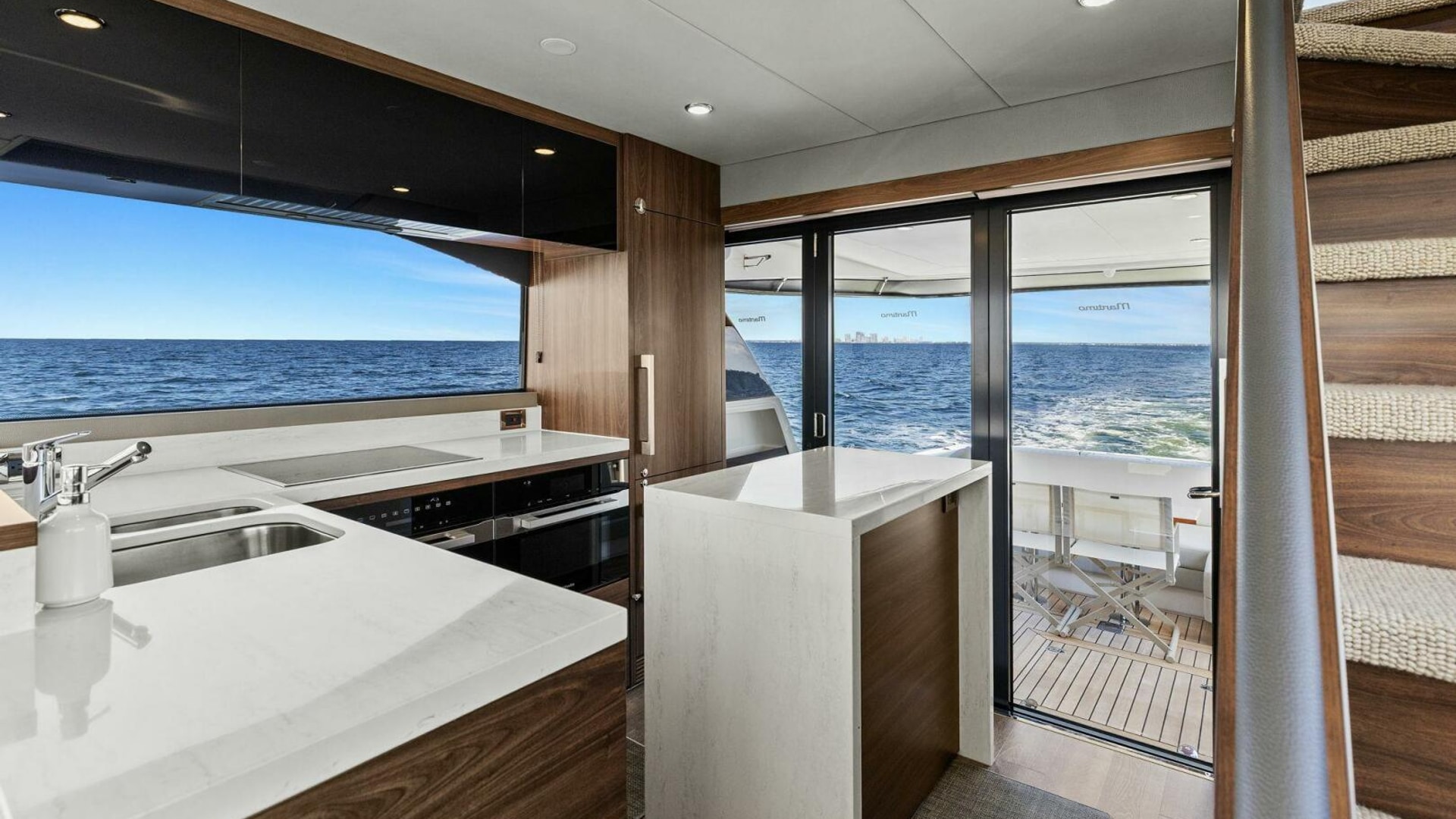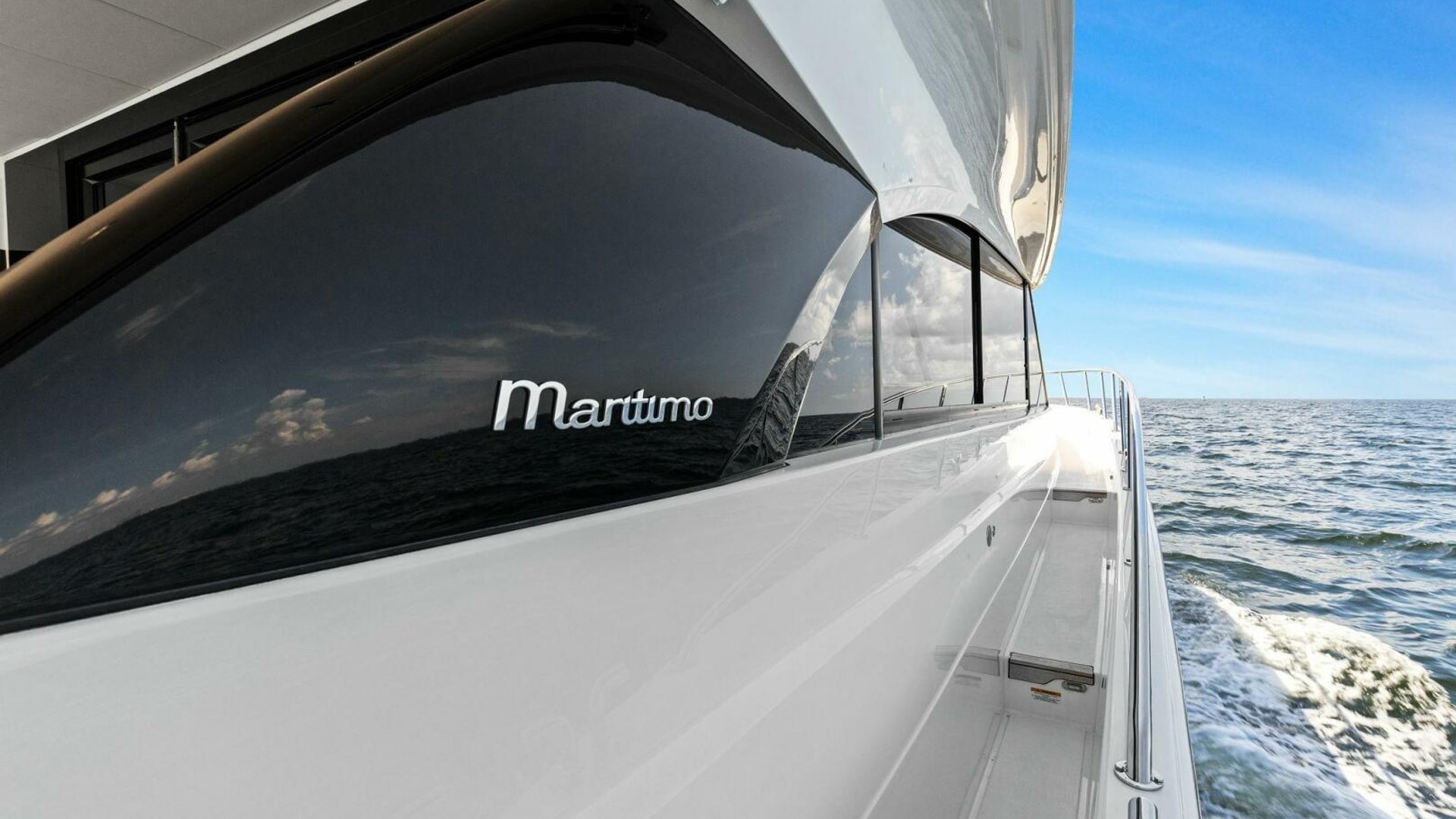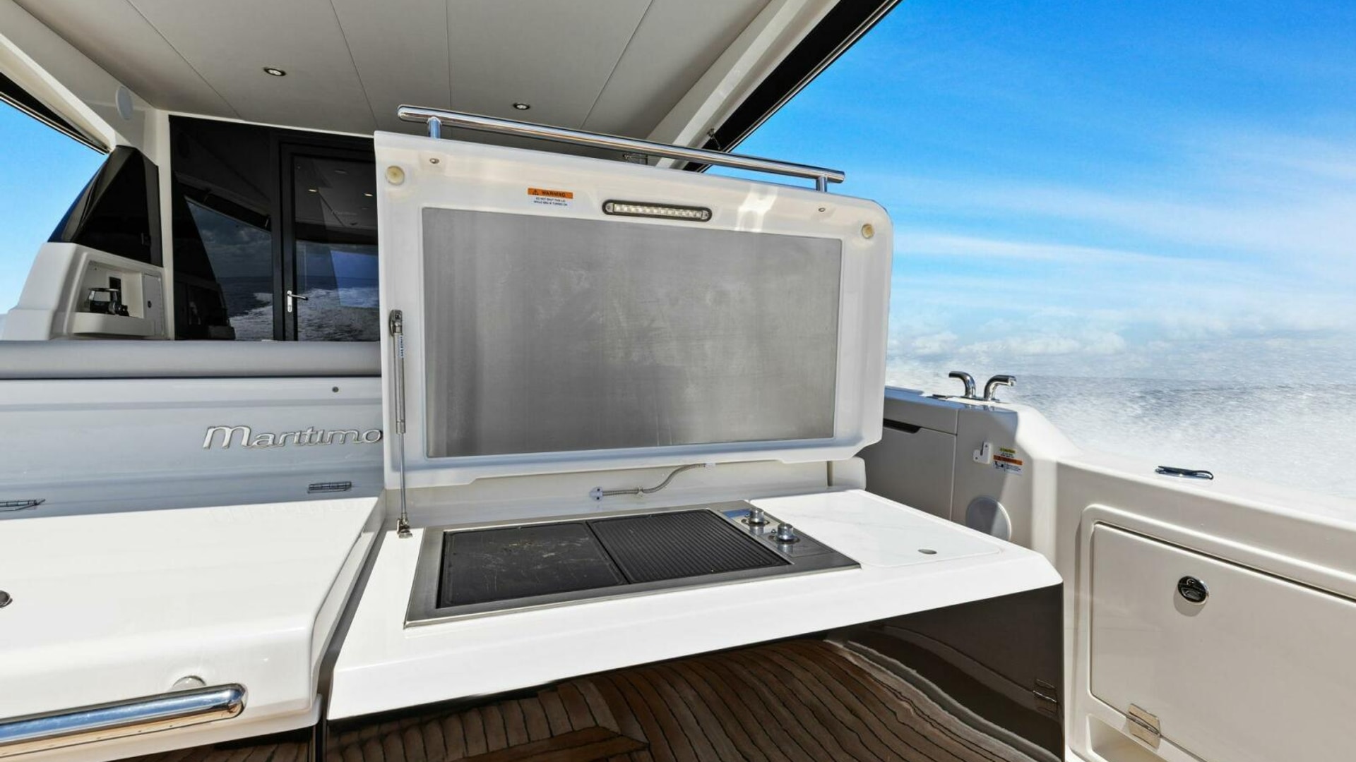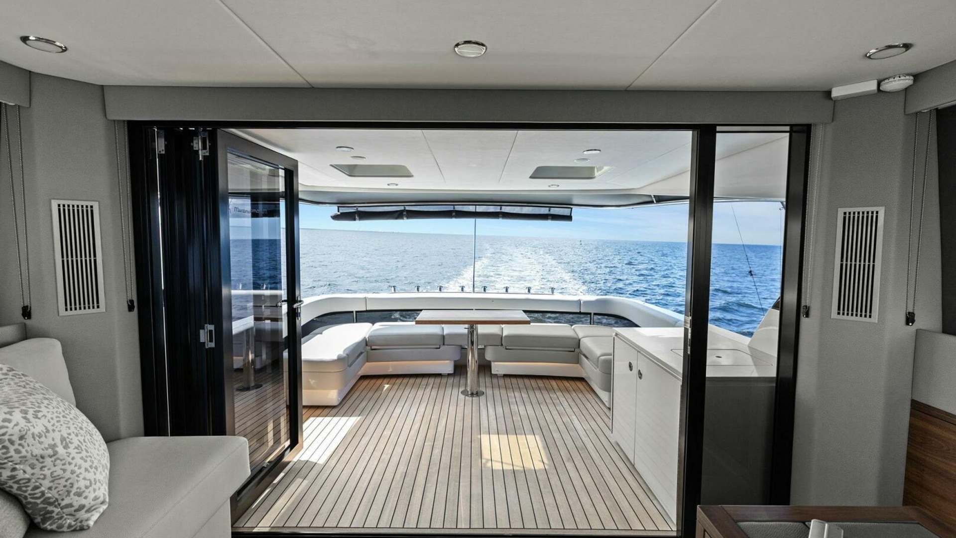 - Windows & Doors: Maritimo panoramic sliding windows (salon & flybridge), bi-fold doors to galley